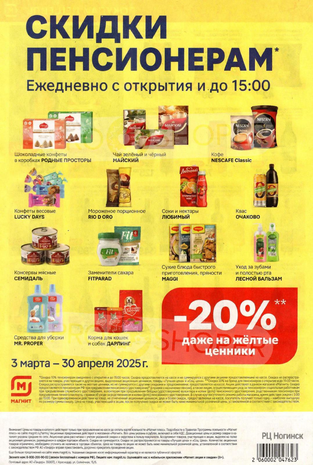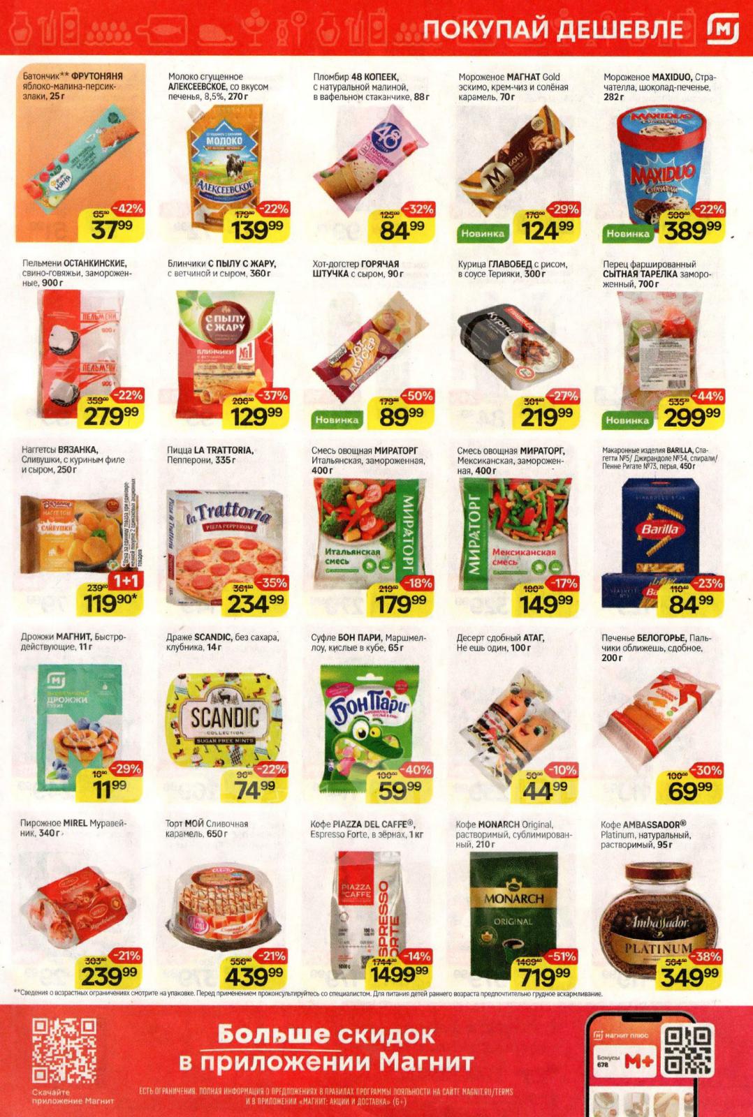 Смотрите еженедельный, новый каталог Магнит и не переплачивайте. Сегодня вас ждут ряд интересных предложений, привлекательных цен, акций и скидок. На страницах каталога Магнит вы найдете все свои любимые товары, которые сейчас предлагаются в супермаркете. Количество товара ограничено и действительно при наличии. Предложение «Цена по карте» действует при предъявлении на кассе "карты лояльности", до оплаты. До-акционные цены и размер скидки в каталоге указаны средние по сети. Цены по акции Магнит действуют в городах: Москва, Балашиха, Химки, Подольск, Королев, Мытищи, Люберцы, Электросталь, Коломна, Одинцово, Железнодорожный, Серпухов, Орехово-Зуево, Красногорск, Щелково, Сергиев Посад, Пушкино, Жуковский, Ногинск, Раменское и многих других населенных пунктах Московского региона.