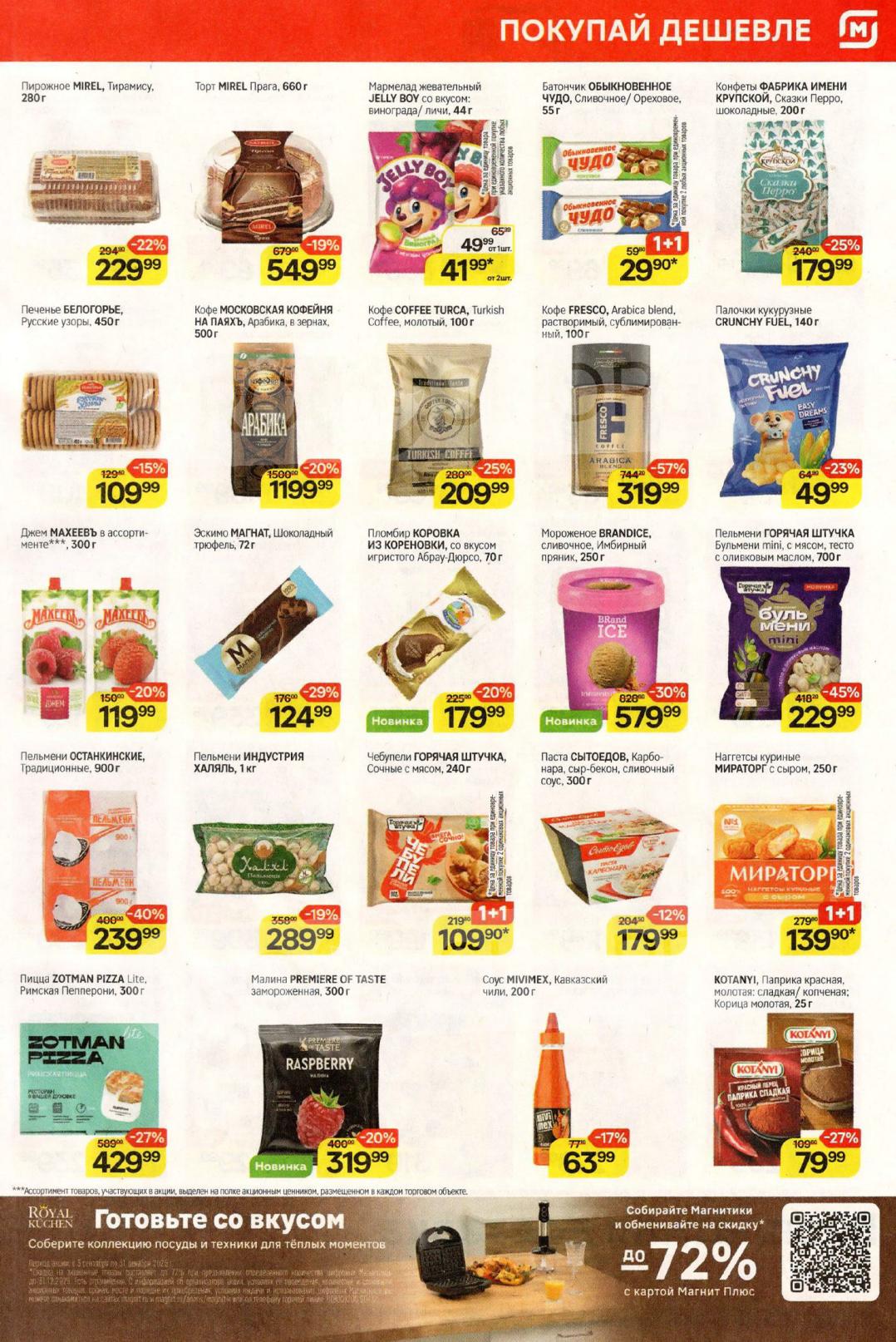 Смотрите еженедельный, новый каталог Магнит и не переплачивайте. Сегодня вас ждут ряд интересных предложений, привлекательных цен, акций и скидок. На страницах каталога Магнит вы найдете все свои любимые товары, которые сейчас предлагаются в супермаркете. Количество товара ограничено и действительно при наличии. Предложение «Цена по карте» действует при предъявлении на кассе "карты лояльности", до оплаты. До-акционные цены и размер скидки в каталоге указаны средние по сети. Цены по акции Магнит действуют в городах: Москва, Балашиха, Химки, Подольск, Королев, Мытищи, Люберцы, Электросталь, Коломна, Одинцово, Железнодорожный, Серпухов, Орехово-Зуево, Красногорск, Щелково, Сергиев Посад, Пушкино, Жуковский, Ногинск, Раменское и многих других населенных пунктах Московского региона.