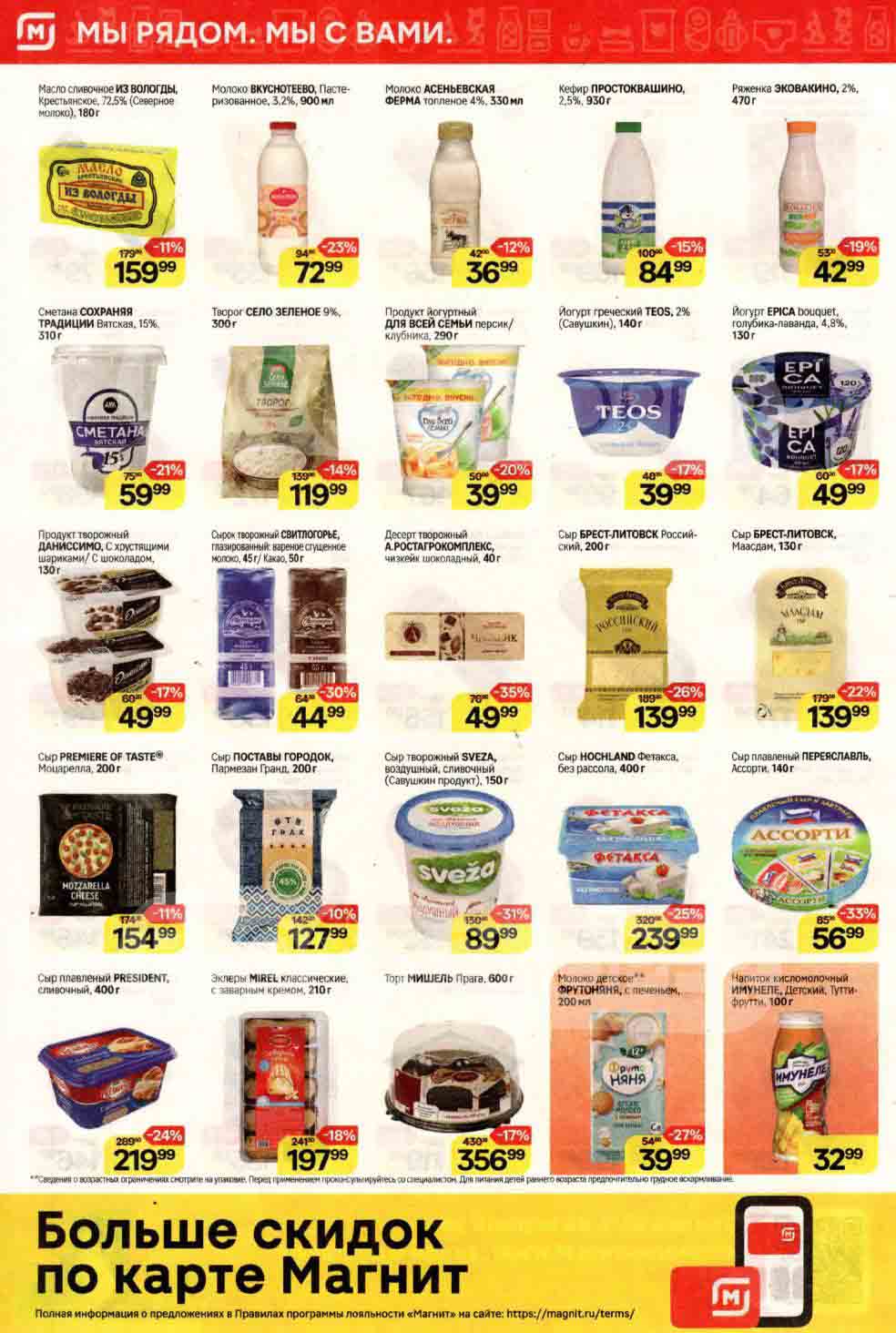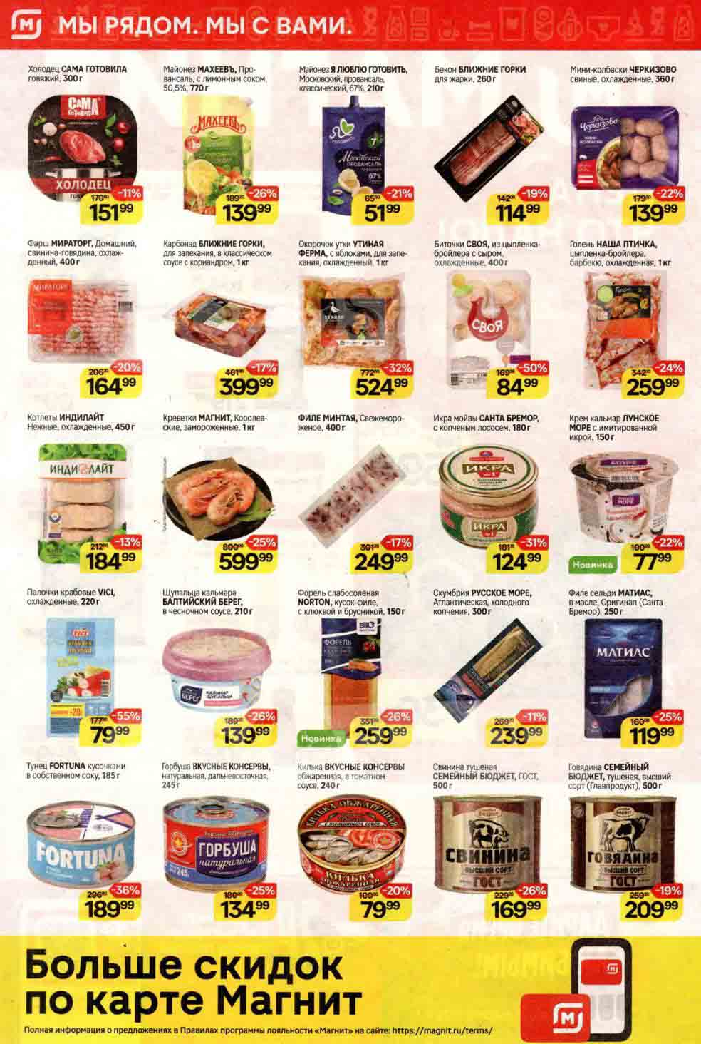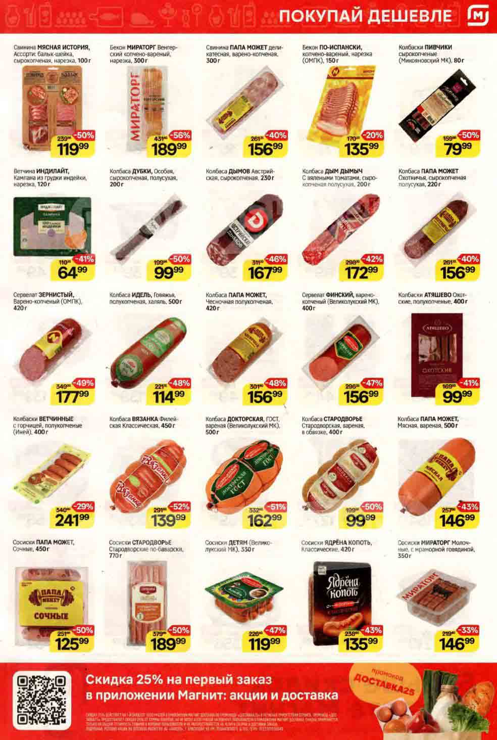 Акционные товары: фарш, сыр, пельмени, сметана, круассаны, ветчина, шоколад, корма для животных и другие. Скидки: от 11% до 56% на различные товары.