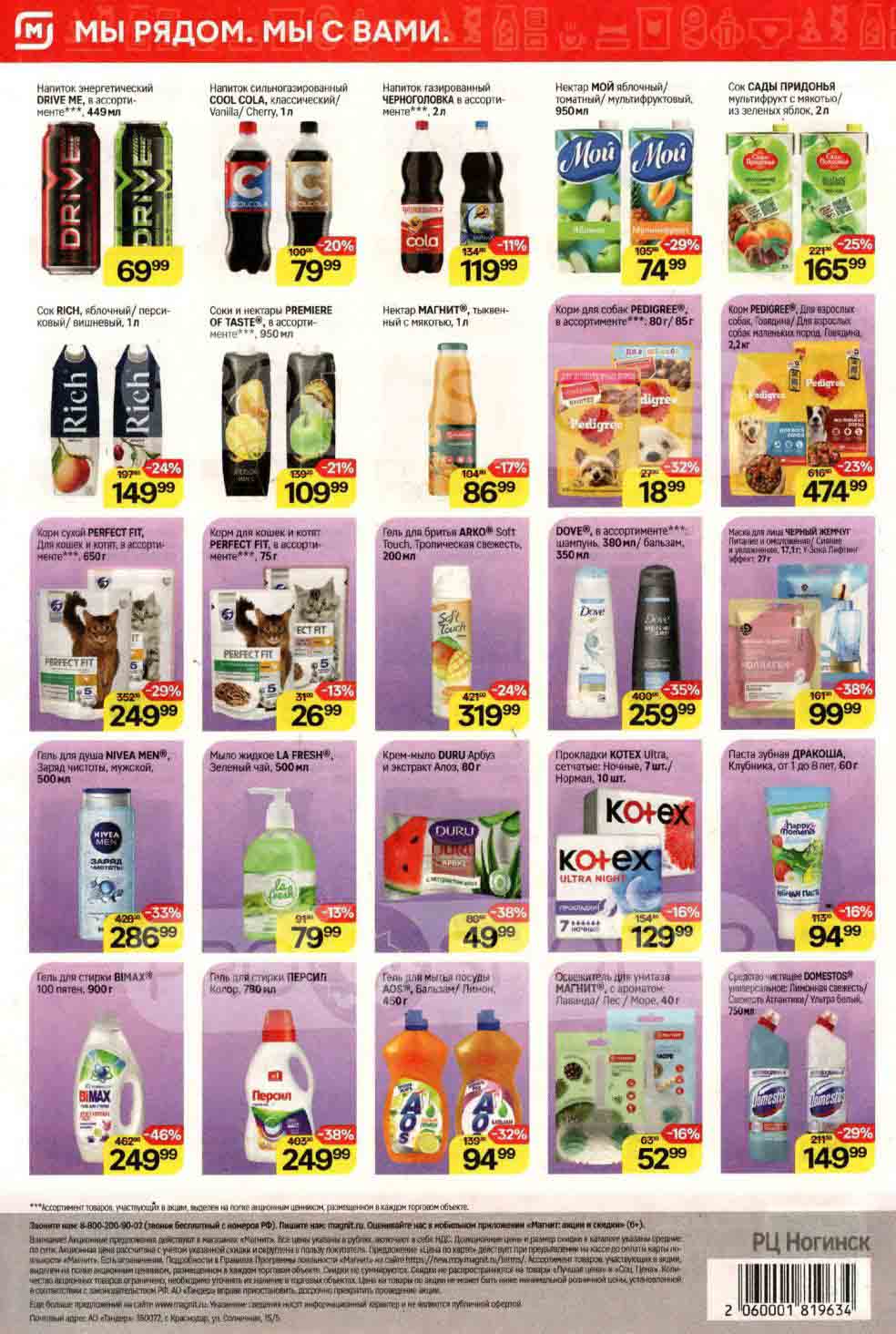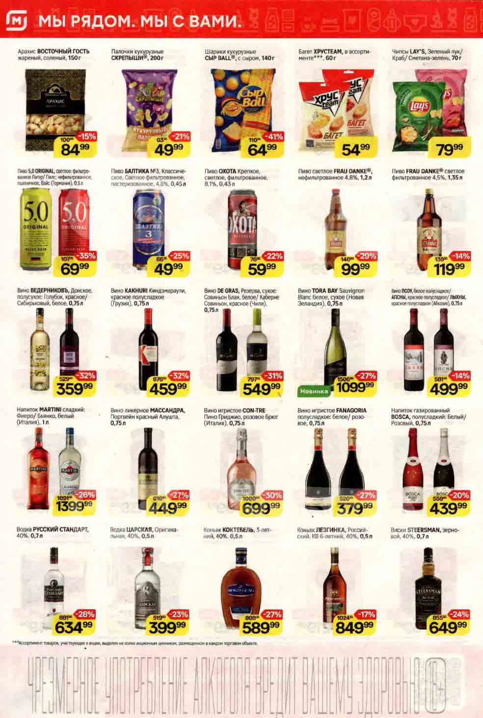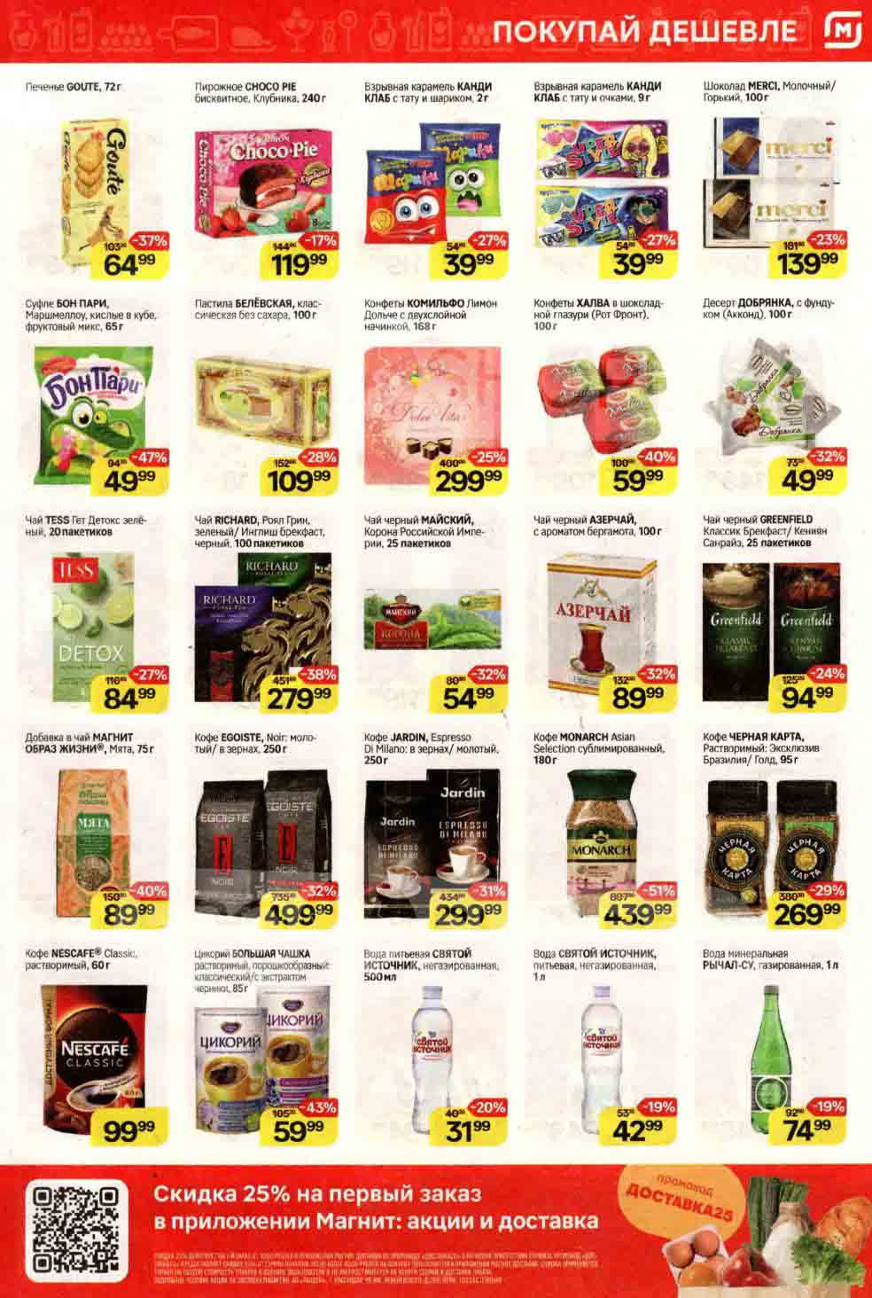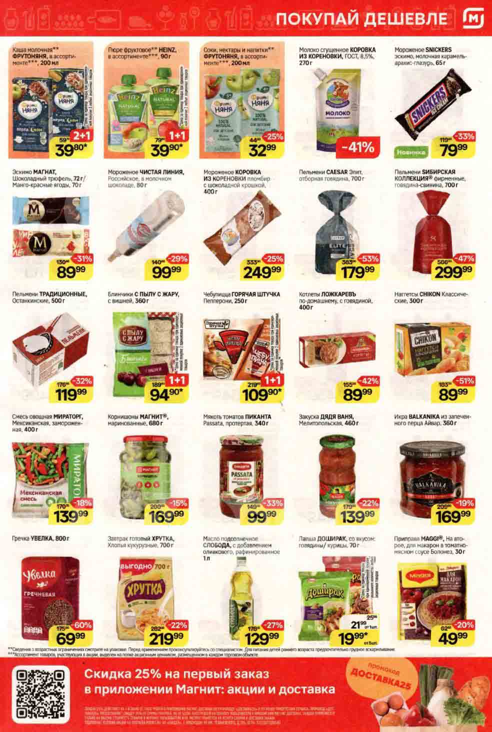 Акционные товары: фарш, сыр, пельмени, сметана, круассаны, ветчина, шоколад, корма для животных и другие. Скидки: от 11% до 56% на различные товары.