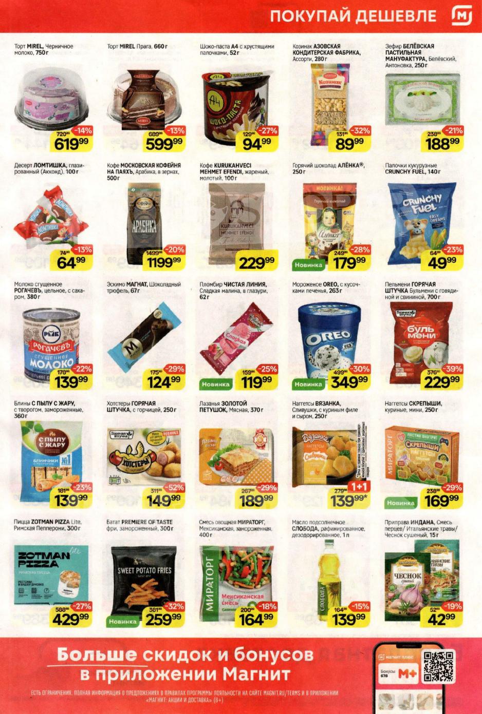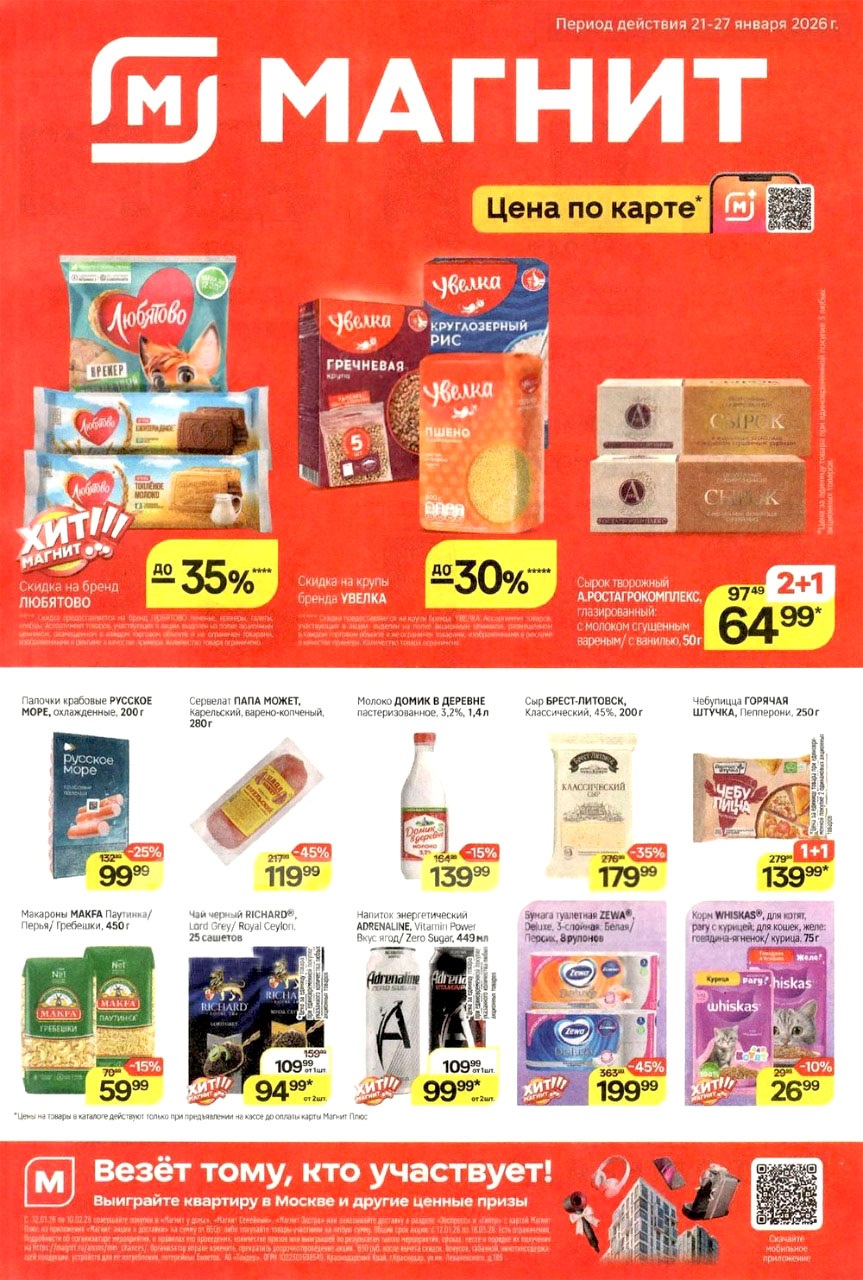 Смотрите еженедельный, новый каталог Магнит и не переплачивайте. Сегодня вас ждут ряд интересных предложений, привлекательных цен, акций и скидок. На страницах каталога Магнит вы найдете все свои любимые товары, которые сейчас предлагаются в супермаркете. Количество товара ограничено и действительно при наличии. Предложение «Цена по карте» действует при предъявлении на кассе "карты лояльности", до оплаты. До-акционные цены и размер скидки в каталоге указаны средние по сети. Цены по акции Магнит действуют в городах: Москва, Балашиха, Химки, Подольск, Королев, Мытищи, Люберцы, Электросталь, Коломна, Одинцово, Железнодорожный, Серпухов, Орехово-Зуево, Красногорск, Щелково, Сергиев Посад, Пушкино, Жуковский, Ногинск, Раменское и многих других населенных пунктах Московского региона.
