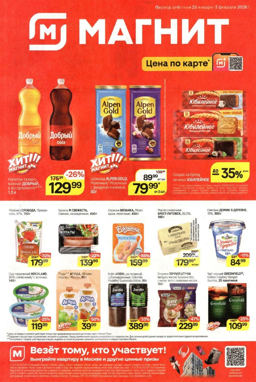 Смотрите еженедельный, новый каталог Магнит и не переплачивайте. Сегодня вас ждут ряд интересных предложений, привлекательных цен, акций и скидок. На страницах каталога Магнит вы найдете все свои любимые товары, которые сейчас предлагаются в супермаркете. Количество товара ограничено и действительно при наличии. Предложение «Цена по карте» действует при предъявлении на кассе "карты лояльности", до оплаты. До-акционные цены и размер скидки в каталоге указаны средние по сети. Цены по акции Магнит действуют в городах: Москва, Балашиха, Химки, Подольск, Королев, Мытищи, Люберцы, Электросталь, Коломна, Одинцово, Железнодорожный, Серпухов, Орехово-Зуево, Красногорск, Щелково, Сергиев Посад, Пушкино, Жуковский, Ногинск, Раменское и многих других населенных пунктах Московского региона.