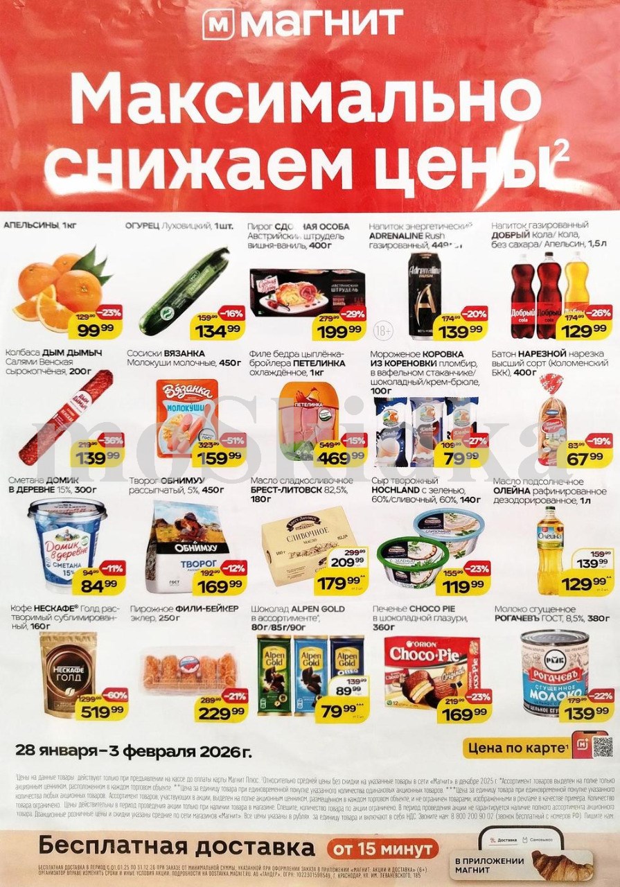 Смотрите еженедельный, новый каталог Магнит и не переплачивайте. Сегодня вас ждут ряд интересных предложений, привлекательных цен, акций и скидок. На страницах каталога Магнит вы найдете все свои любимые товары, которые сейчас предлагаются в супермаркете. Количество товара ограничено и действительно при наличии. Предложение «Цена по карте» действует при предъявлении на кассе "карты лояльности", до оплаты. До-акционные цены и размер скидки в каталоге указаны средние по сети. Цены по акции Магнит действуют в городах: Москва, Балашиха, Химки, Подольск, Королев, Мытищи, Люберцы, Электросталь, Коломна, Одинцово, Железнодорожный, Серпухов, Орехово-Зуево, Красногорск, Щелково, Сергиев Посад, Пушкино, Жуковский, Ногинск, Раменское и многих других населенных пунктах Московского региона.