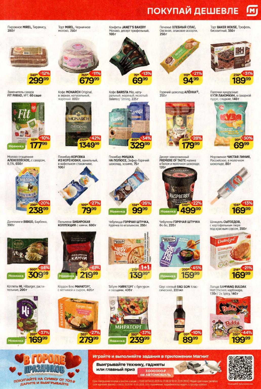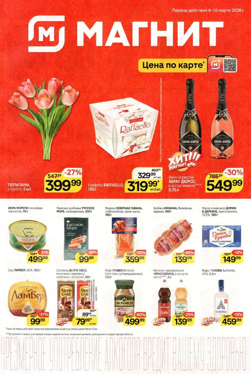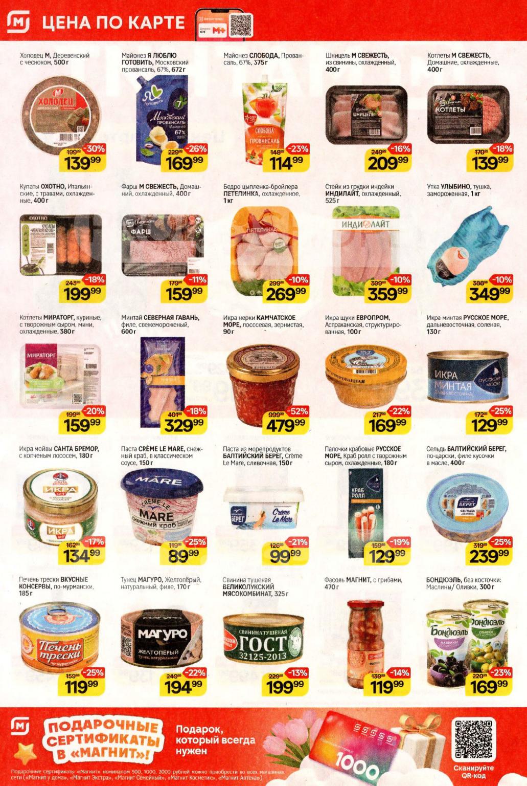 Смотрите еженедельный, новый каталог Магнит и не переплачивайте. Сегодня вас ждут ряд интересных предложений, привлекательных цен, акций и скидок. На страницах каталога Магнит вы найдете все свои любимые товары, которые сейчас предлагаются в супермаркете. Количество товара ограничено и действительно при наличии. Предложение «Цена по карте» действует при предъявлении на кассе "карты лояльности", до оплаты. До-акционные цены и размер скидки в каталоге указаны средние по сети. Цены по акции Магнит действуют в городах: Москва, Балашиха, Химки, Подольск, Королев, Мытищи, Люберцы, Электросталь, Коломна, Одинцово, Железнодорожный, Серпухов, Орехово-Зуево, Красногорск, Щелково, Сергиев Посад, Пушкино, Жуковский, Ногинск, Раменское и многих других населенных пунктах Московского региона.