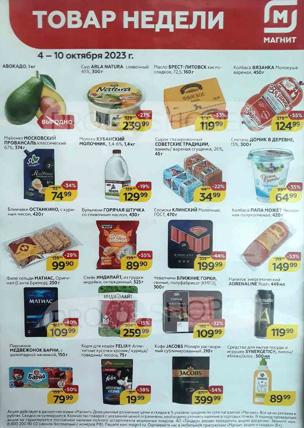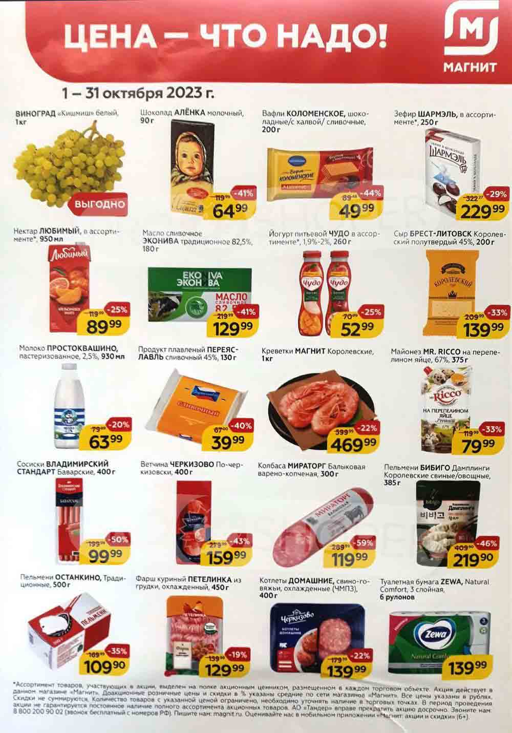Смотрите еженедельный, новый каталог Магнит и не переплачивайте. Сегодня вас ждут ряд интересных предложений, привлекательных цен, акций и скидок. На страницах каталога Магнит вы найдете все свои любимые товары, которые сейчас предлагаются в супермаркете. Количество товара ограничено и действительно при наличии. Предложение «Цена по карте» действует при предъявлении на кассе "карты лояльности", до оплаты. До-акционные цены и размер скидки в каталоге указаны средние по сети. Цены по акции Магнит действуют в городах: Москва, Балашиха, Химки, Подольск, Королев, Мытищи, Люберцы, Электросталь, Коломна, Одинцово, Железнодорожный, Серпухов, Орехово-Зуево, Красногорск, Щелково, Сергиев Посад, Пушкино, Жуковский, Ногинск, Раменское и многих других населенных пунктах Московского региона.
