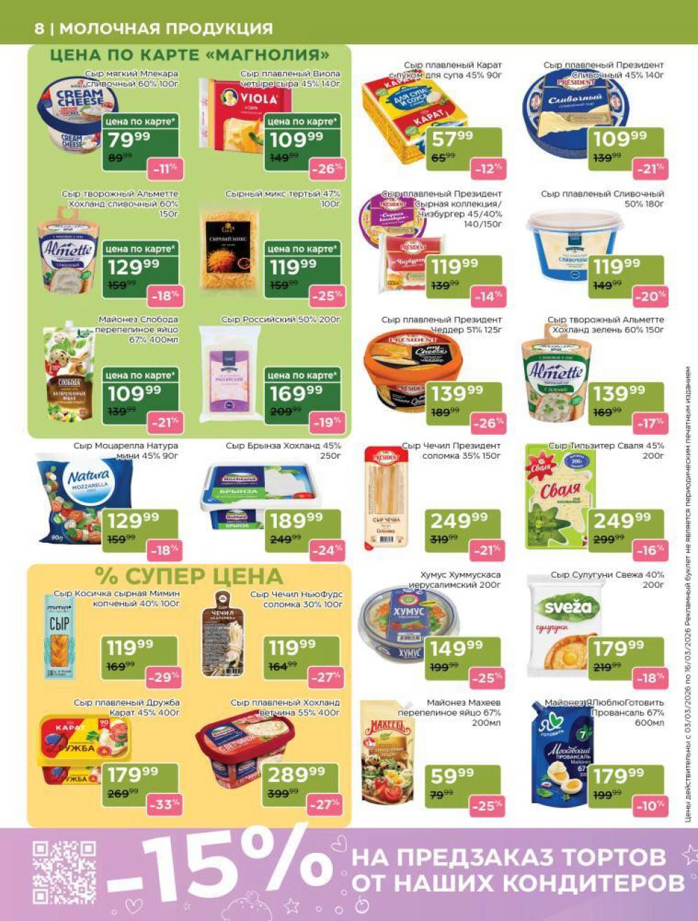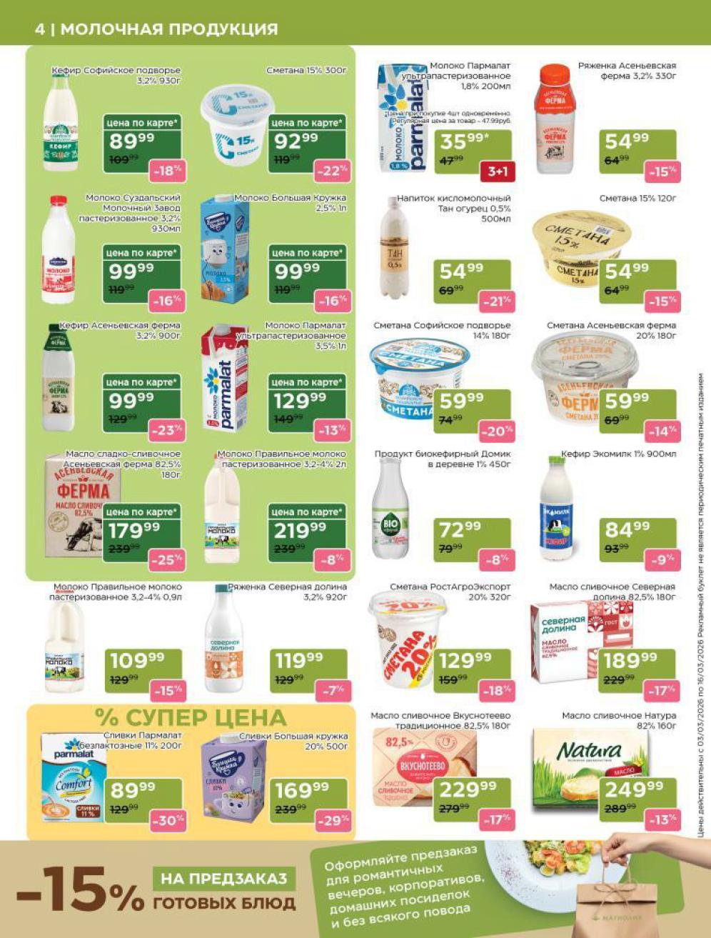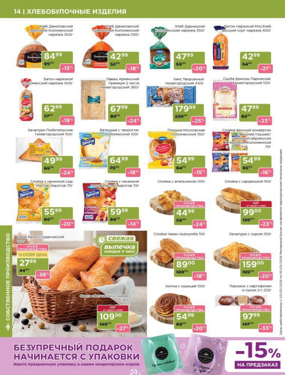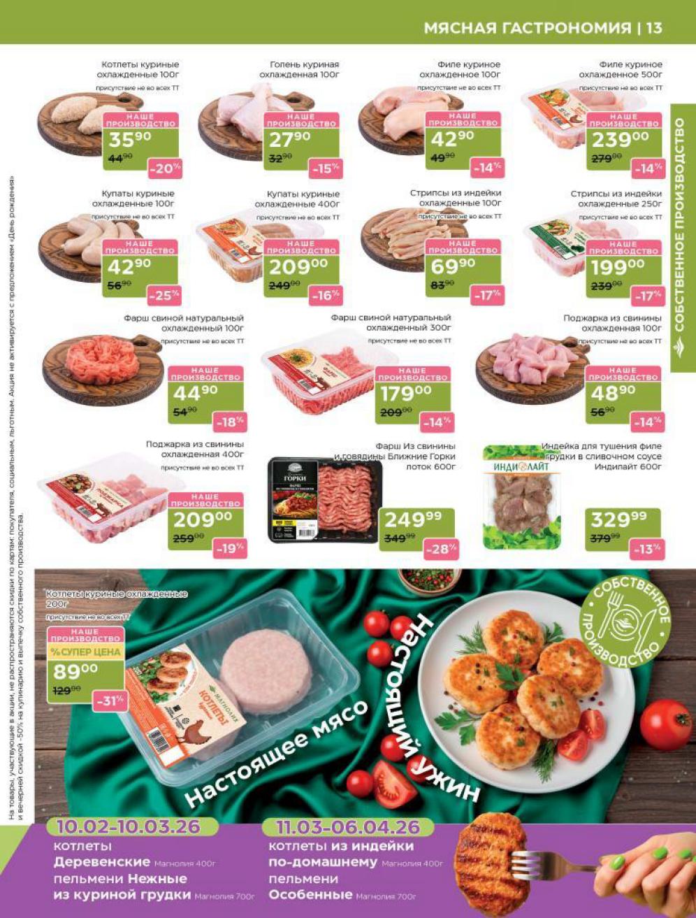 Продукция собственного производства: Акции на товары из пекарни, кулинарии и мясного цеха часто действуют в ограниченном количестве из-за ручного формата производства — уточняйте наличие на месте.