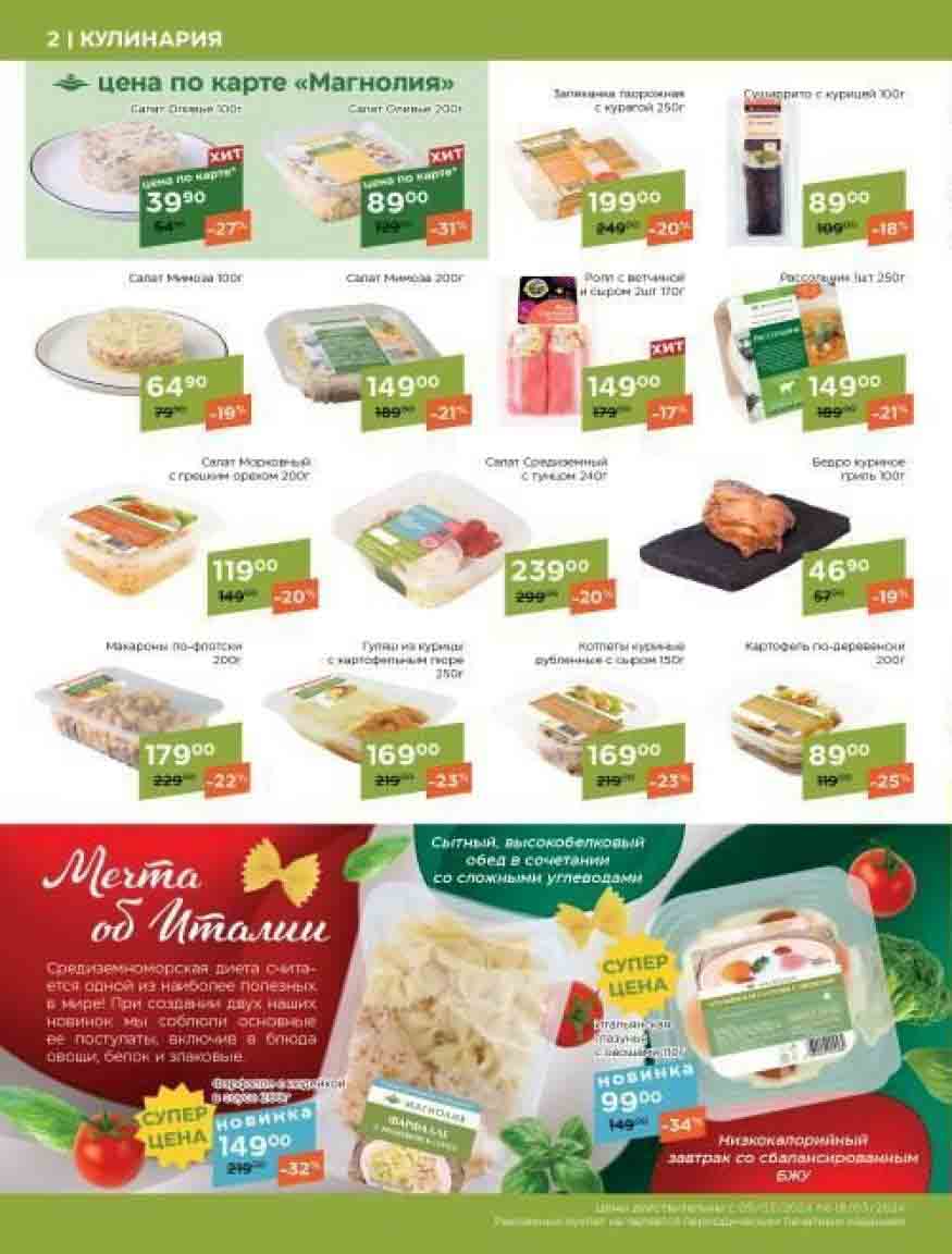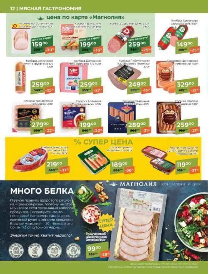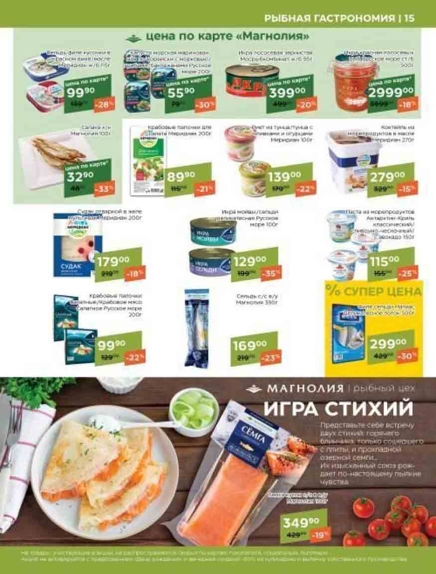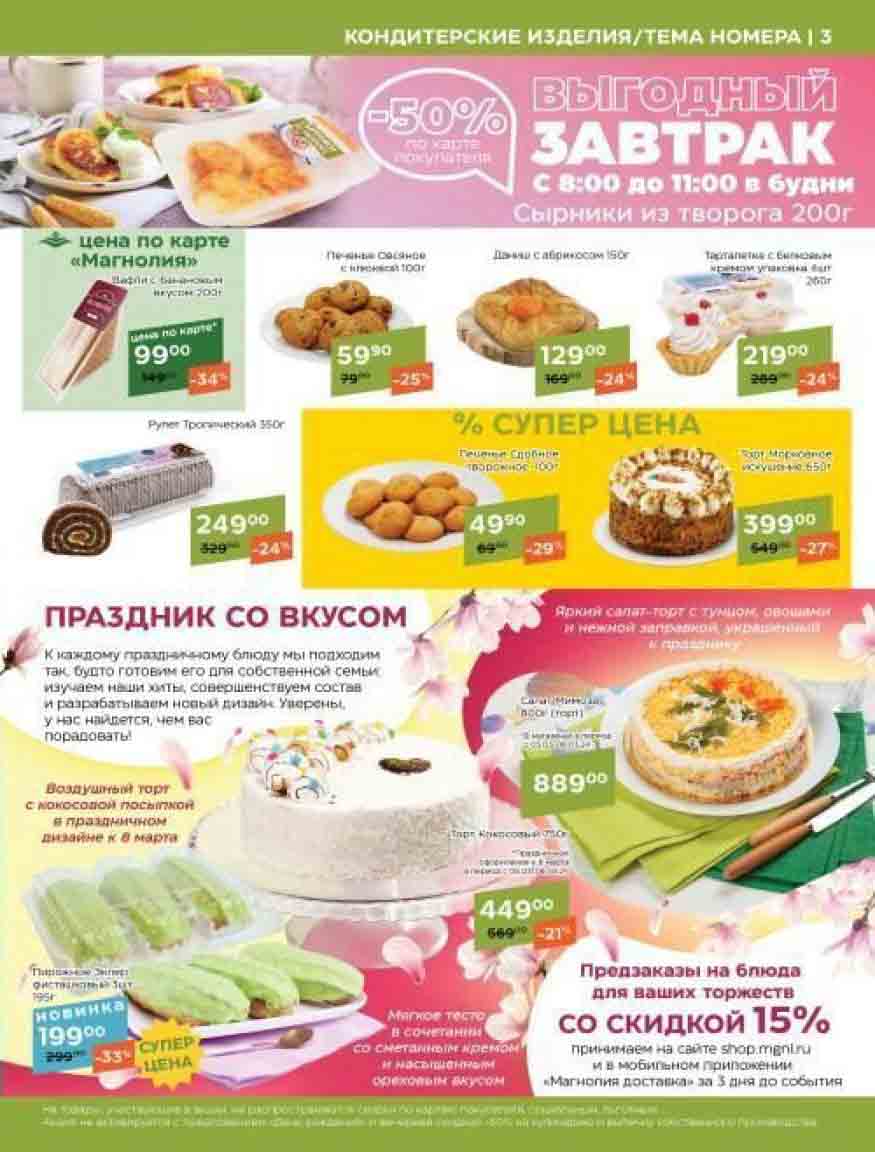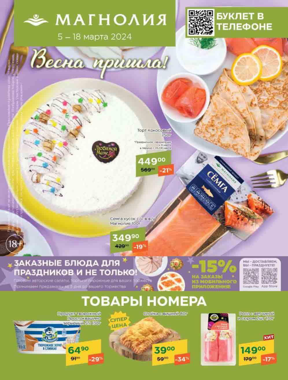 В акционном буклете предложены выгодные цены на различные продукты, такие как торт Кокосовый 750г цена: 449 руб., семга кусок с/с в в/у Магнолия 100г цена: 349.90 руб., продукт творожный Простоквашино зерненый 5% 150г цена: 64.90 руб., ролл с ветчиной и сыром 2шт 170г цена: 149 руб. и многое другое.