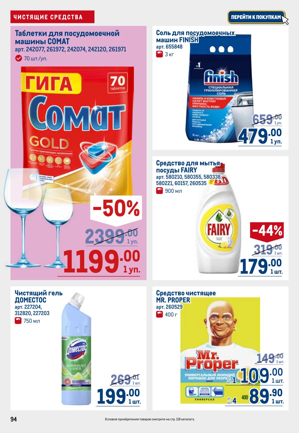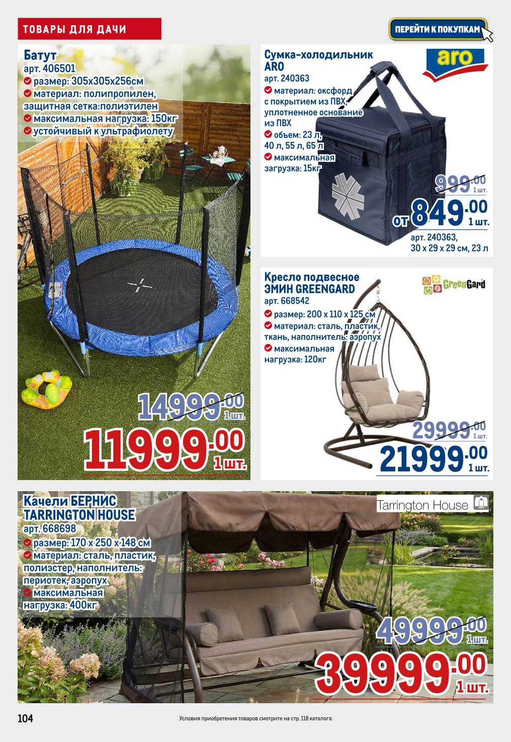Чистящий гель «Доместос» (750 мл), таблетки для посудомойки COMAT (70 шт.), соль Finish (3 кг), средство для мытья посуды Fairy (900 мл), чистящее средство Mr. Proper (400 г). Для дачи: батут (305×305×256 см, нагрузка 150 кг), сумка-холодильник ARO (23–65 л), кресло подвесное (200×110×125 см, нагрузка 120 кг), качели (170×250×148 см, нагрузка 400 кг). Цены на эти товары уточняйте в магазине (в каталоге не указаны, но акция действует).