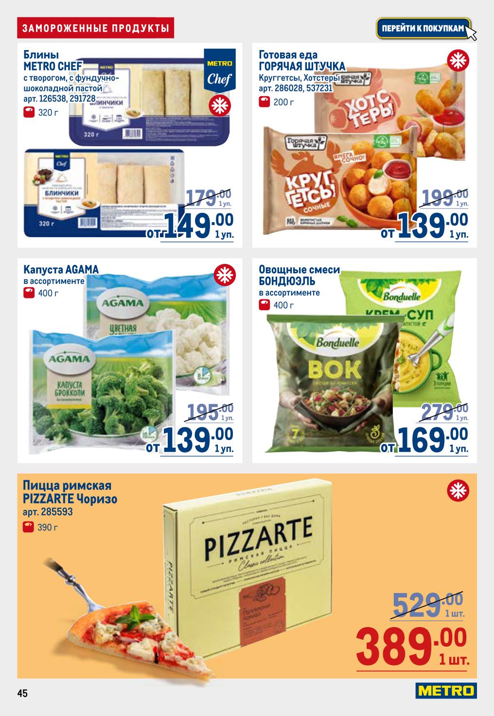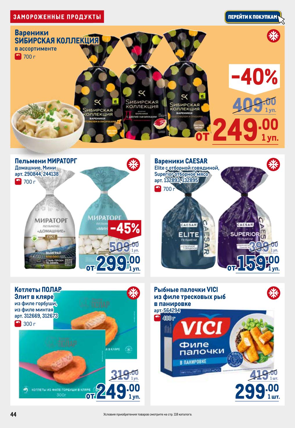 Вареники «Сибирская коллекция» (700 г, 249 ₽, скидка 39%), вареники Caesar Elite с говядиной (700 г, от 159 ₽, скидка 41%), пельмени «Мираторг» (700 г, 299 ₽, скидка 39%). Котлеты «Полар» из филе горбуши или минтая в кляре (300 г, 299 ₽), рыбные палочки VICI (400 г, 249 ₽). Очень выгодные цены на полуфабрикаты.