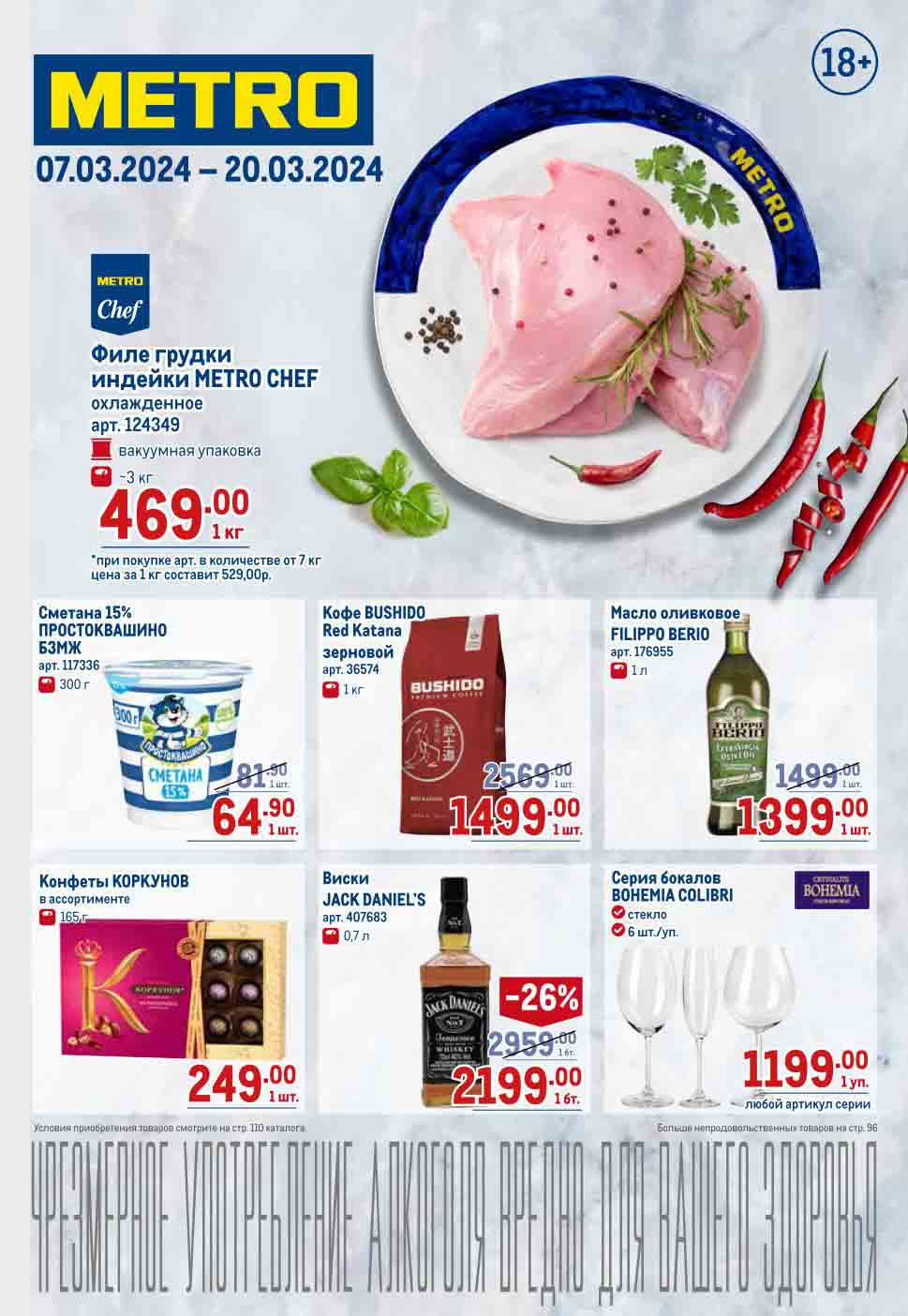 В акционном буклете предложены выгодные цены на различные продукты, такие как Филе грудки индейки — 469.00 руб., сметана 15% ПРОСТОКВАШИНО — 64.90 руб., скидка 26% на JACK DANIEL’S и многое другое.