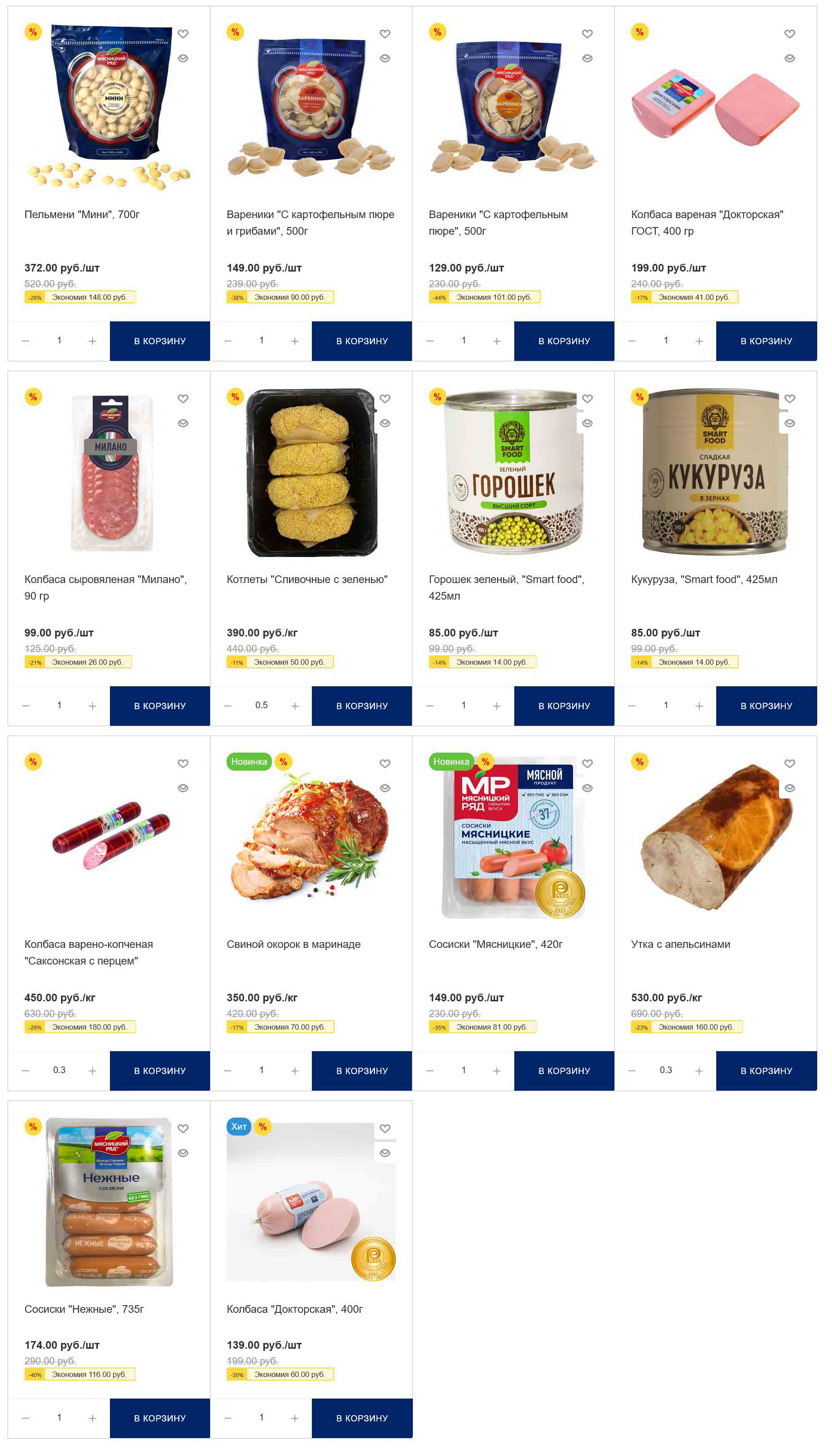 На страницах каталога Мясницкий Ряд вы найдете все свои любимые товары, которые сейчас предлагаются в супермаркете. Не пропустите последние специальные предложения и сэкономьте на покупках. Цены по акции Мясницкий ряд действуют в городах: Москва, Балашиха, Химки, Подольск, Королев, Мытищи, Люберцы, Электросталь, Коломна, Одинцово, Железнодорожный, Серпухов, Орехово-Зуево, Красногорск, Щелково, Сергиев Посад, Пушкино, Жуковский, Ногинск, Раменское, Клин, Воскресенск, Домодедово и многих других населенных пунктах Московского региона.