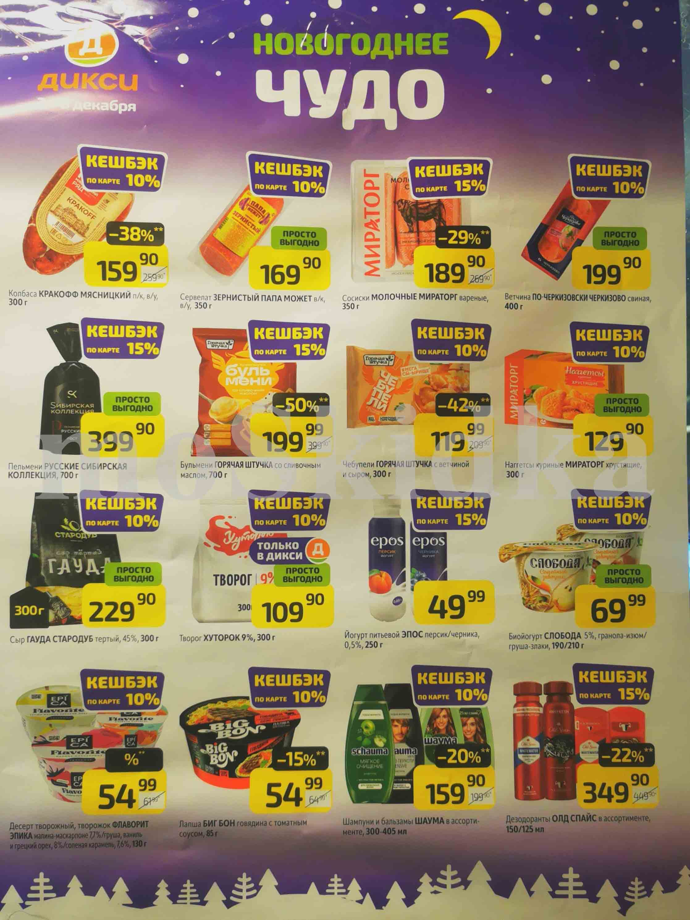 Смотрите еженедельный, новый каталог Дикси и не переплачивайте уже сегодня вас ждут ряд интересных акций и привлекательных скидок. Обо всем этом вы сможете узнать посмотрев новый каталог Дикси на нашем сайте. На страницах каталога Дикси вы найдете все свои любимые продукты, которые сейчас предлагаются в супермаркете. Предложения, представленные в настоящем буклете, действительны в указанный срок проведения. Стоимость указана за единицу товара (за исключением весового, цена которого определена за конкретный вес, указанный в настоящем буклете). В акции участвуют позиции, изображение которых размещено в каталоге. Цены в супермаркетах могут быть дополнительно снижены по решению руководства сети. Цены помеченные «*», обозначают среднюю цену данной позиции по сети. Количество товара ограничено и может не везде присутствовать. Цены по акции Дикси действуют в городах: Москва, Балашиха, Химки, Подольск, Королев, Мытищи, Люберцы, Электросталь, Коломна, Одинцово, Железнодорожный, Серпухов, Орехово-Зуево, Красногорск, Щелково, Сергиев Посад, Пушкино, Жуковский, Ногинск, Раменское, Клин, Воскресенск, Домодедово и многих других населенных пунктах Московского региона.