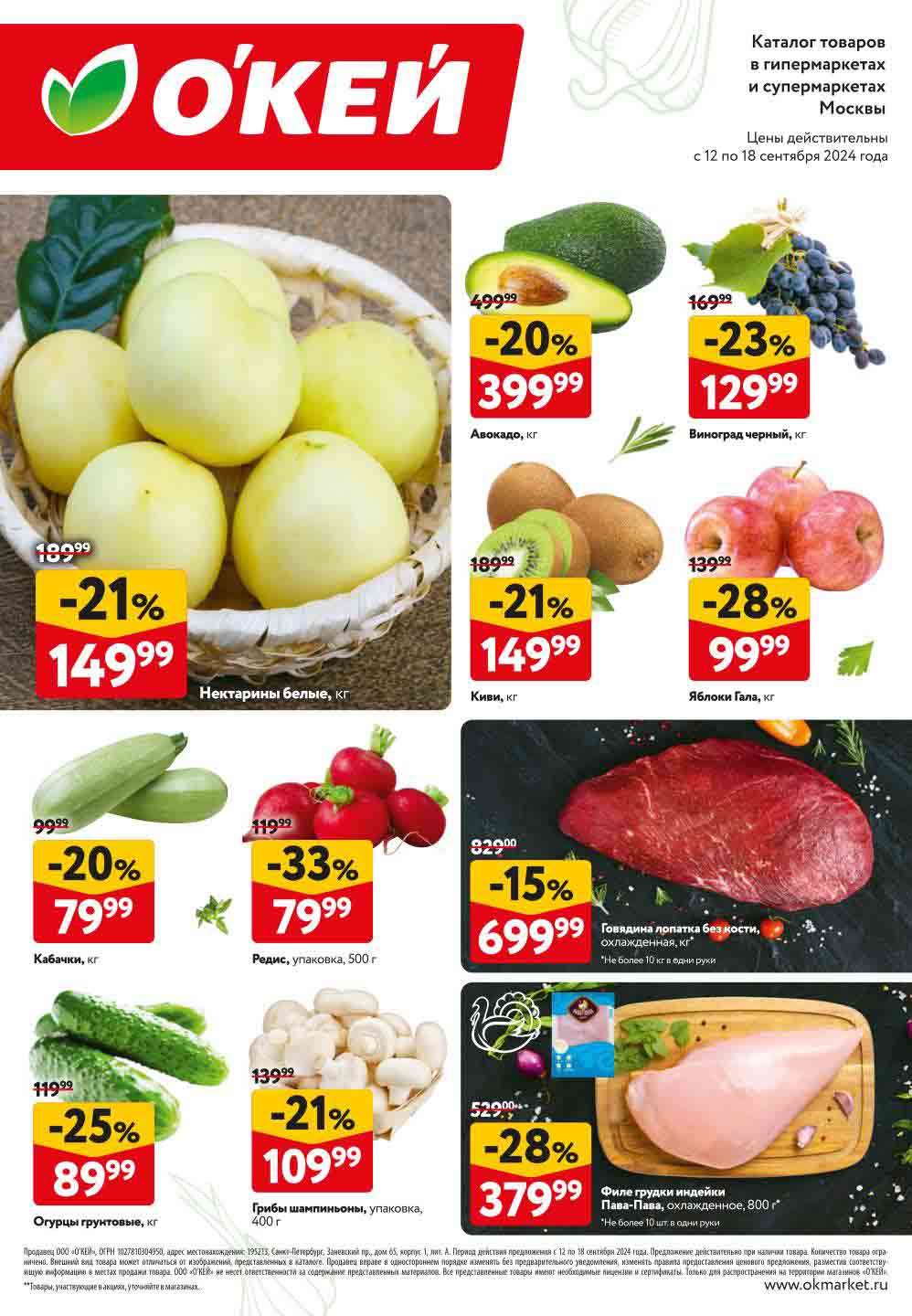 На страницах каталога Окей вы найдете все свои любимые продукты, которые сейчас предлагаются в супермаркете. Не пропустите последние специальные предложения и сэкономьте на покупках. Предложение действительно при наличии товара на прилавках. Каталог Окей обновляется каждые две недели, в нем представлены большое количество товаров с привлекательными скидками. Цены по акции Окей действуют в городах: Москва, Путилково, Московский, Отрадное, Лобня, Мытищи, Люберцы, Электросталь, Ногинск, Клин, Сергиев Пасад, Воскресенск и многих других населенных пунктах Московского региона.