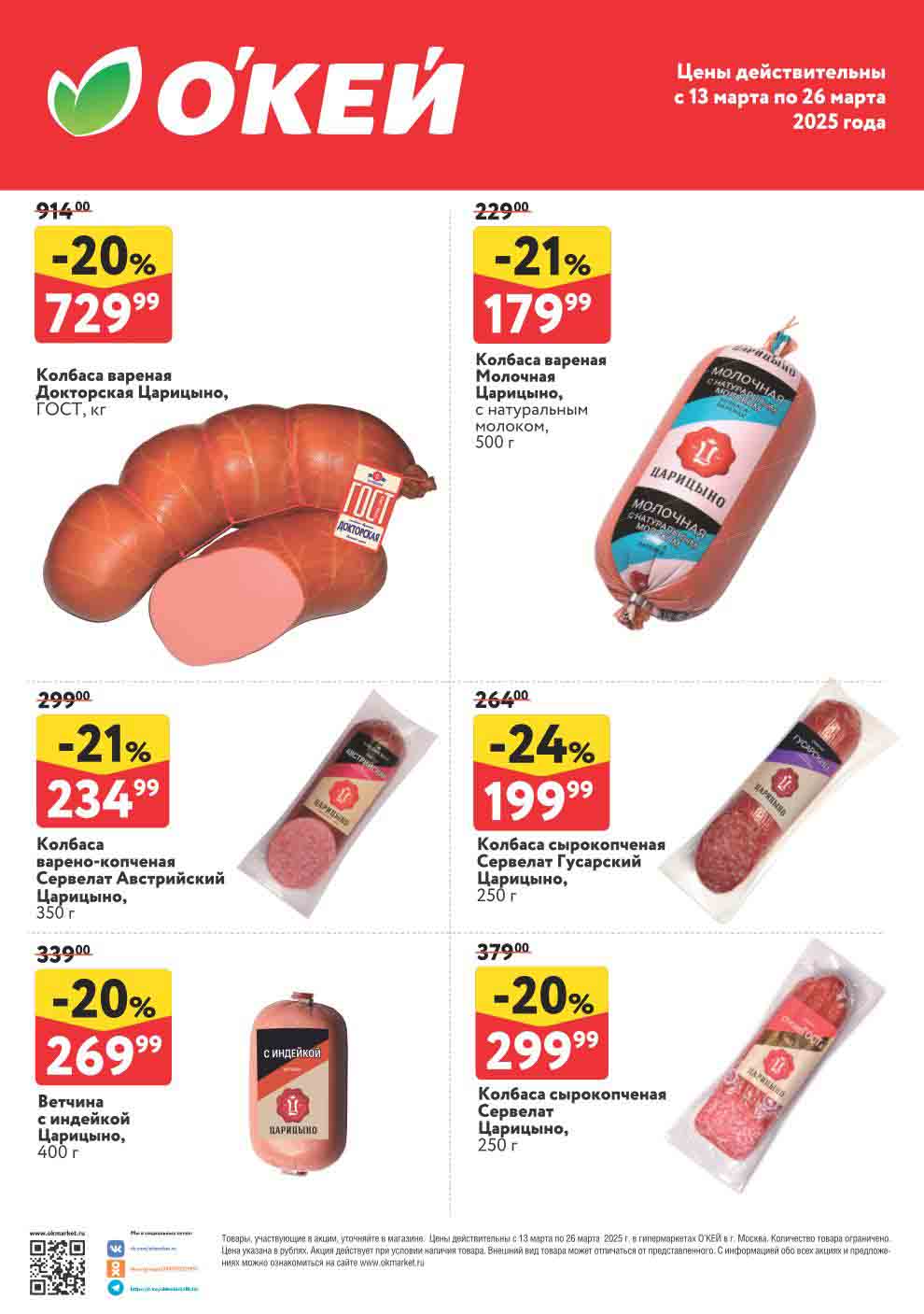 На страницах каталога Окей вы найдете все свои любимые продукты, которые сейчас предлагаются в супермаркете. Не пропустите последние специальные предложения и сэкономьте на покупках. Предложение действительно при наличии товара на прилавках. Каталог Окей обновляется каждые две недели, в нем представлены большое количество товаров с привлекательными скидками. Цены по акции Окей действуют в городах: Москва, Путилково, Московский, Отрадное, Лобня, Мытищи, Люберцы, Электросталь, Ногинск, Клин, Сергиев Пасад, Воскресенск и многих других населенных пунктах Московского региона.
