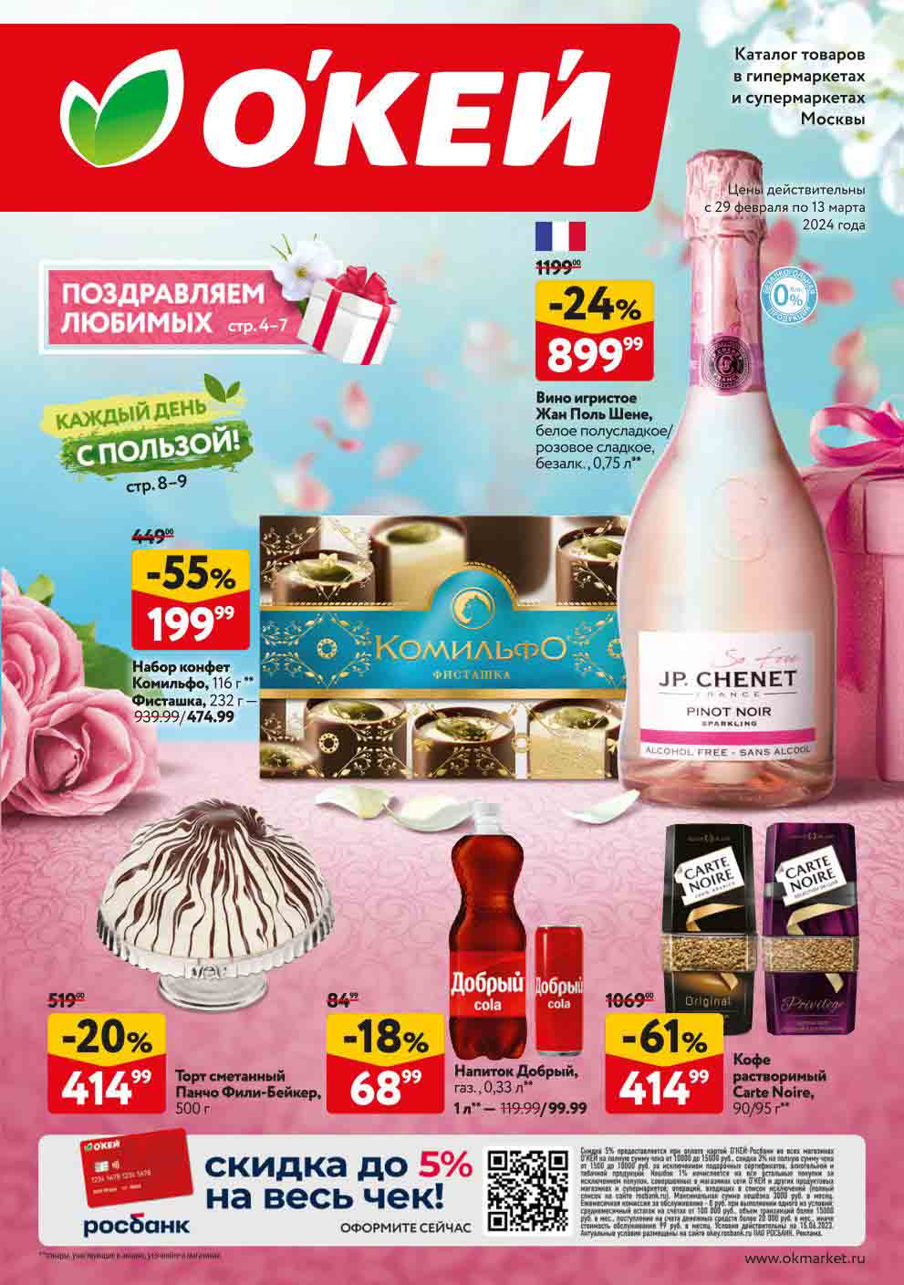 Каталог представляет продукты, доступные по акции в гипермаркетах и супермаркетах Москвы о обл., в том числе набор конфет Комильфо со скидкой 55%, игристое вино Жаль Поль Жене, торт сметанный, газированный напиток Добрый, минус 61% на кофе и многое другое. Скидки варьируются от 15% до 61% от первоначальных цен.