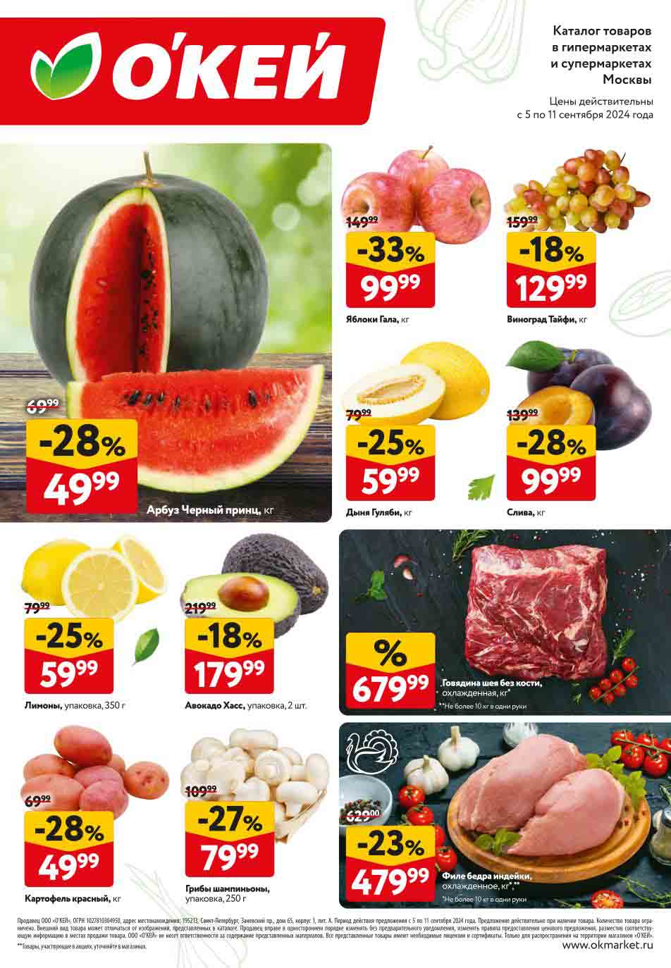 На страницах каталога Окей вы найдете все свои любимые продукты, которые сейчас предлагаются в супермаркете. Не пропустите последние специальные предложения и сэкономьте на покупках. Предложение действительно при наличии товара на прилавках. Каталог Окей обновляется каждые две недели, в нем представлены большое количество товаров с привлекательными скидками. Цены по акции Окей действуют в городах: Москва, Путилково, Московский, Отрадное, Лобня, Мытищи, Люберцы, Электросталь, Ногинск, Клин, Сергиев Пасад, Воскресенск и многих других населенных пунктах Московского региона.