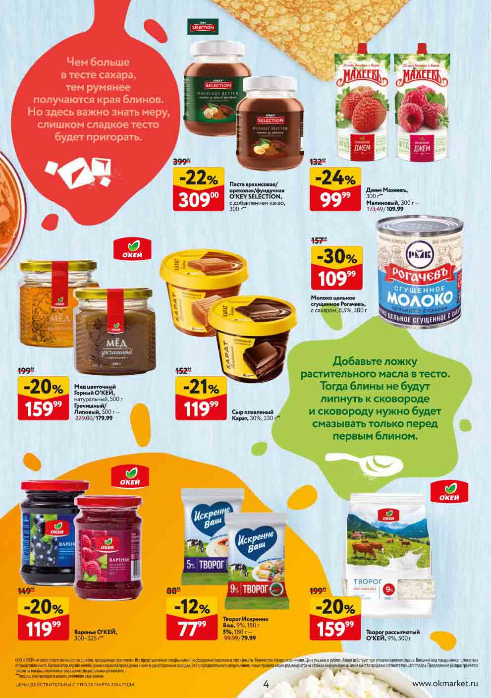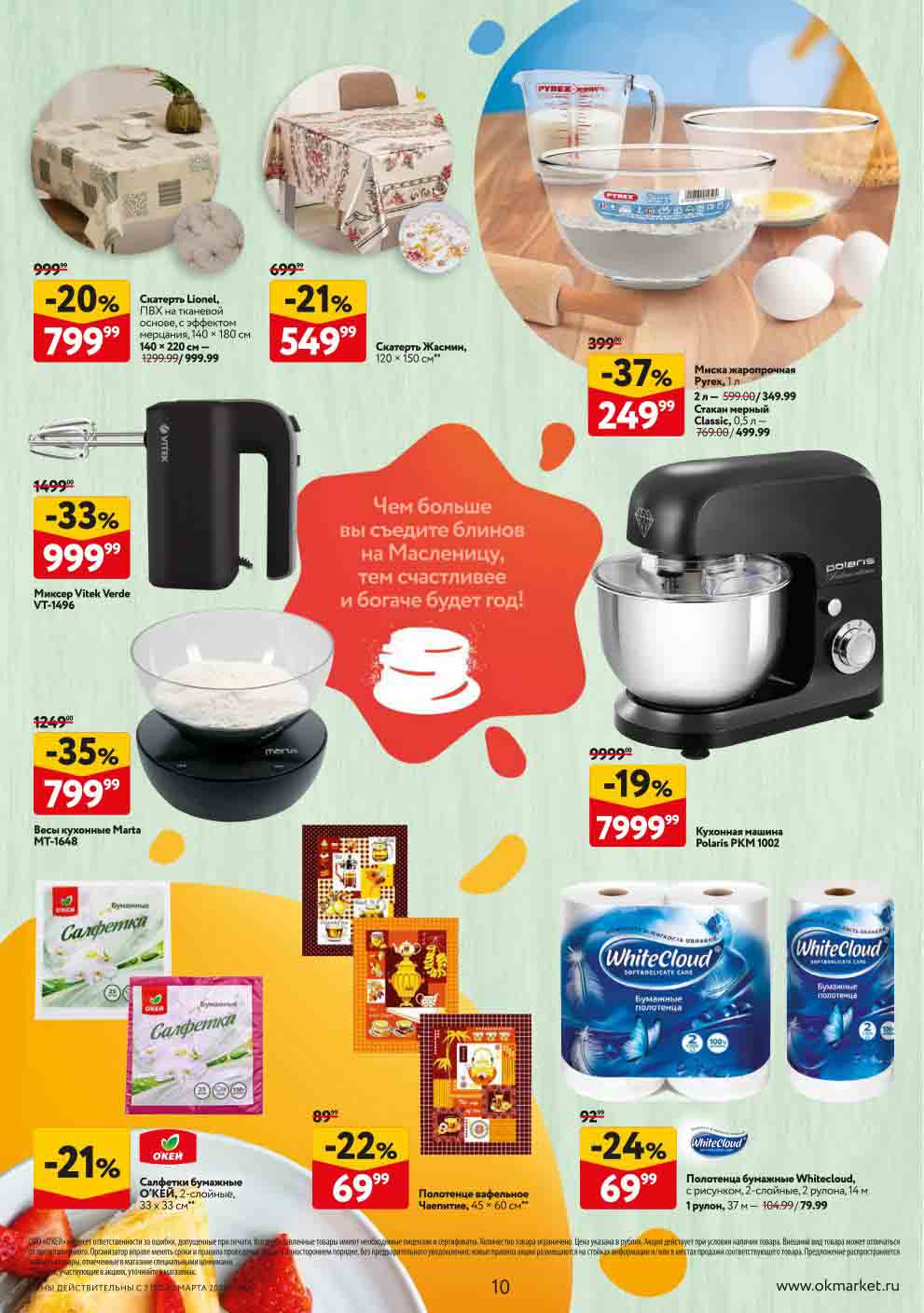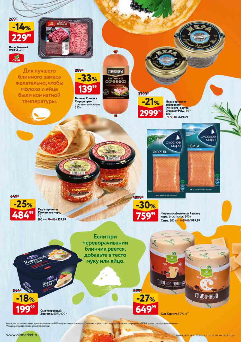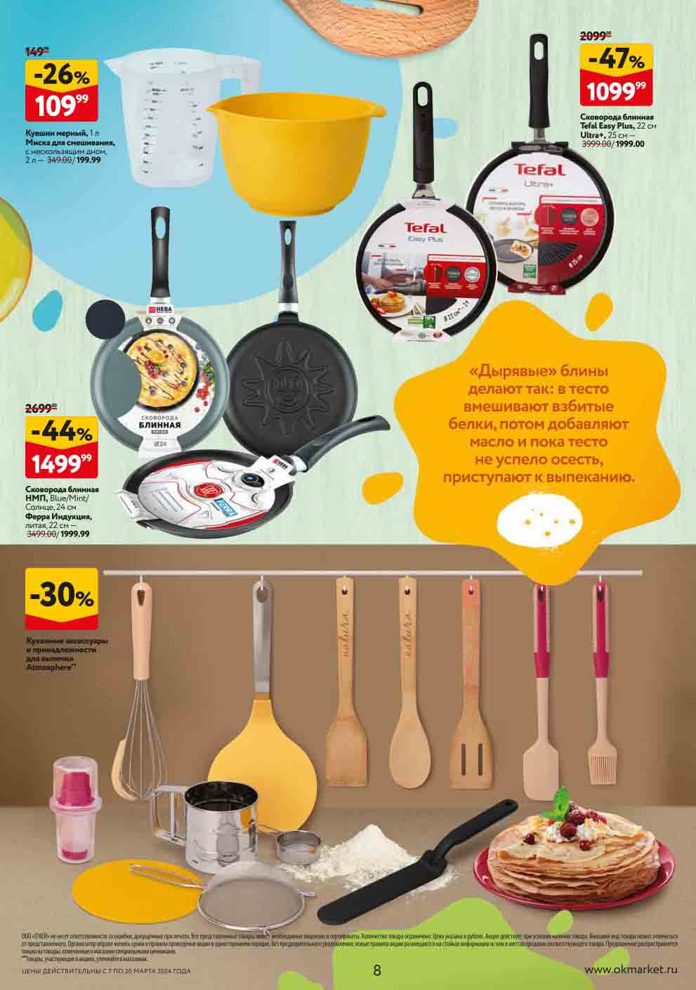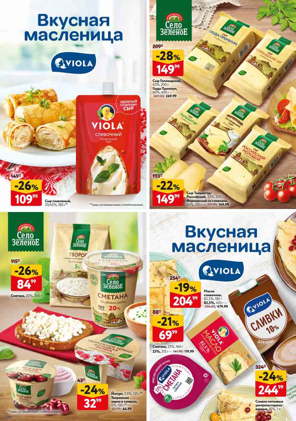 В акционном буклете предложены выгодные цены на различные продукты, такие как -18% на муку пшеничную, молоко Село Зеленое за 82.99 руб., -57% на сковороду блинную Skala, яйцо куриное, С0, 10 шт. за 119.99 руб. и многое другое.