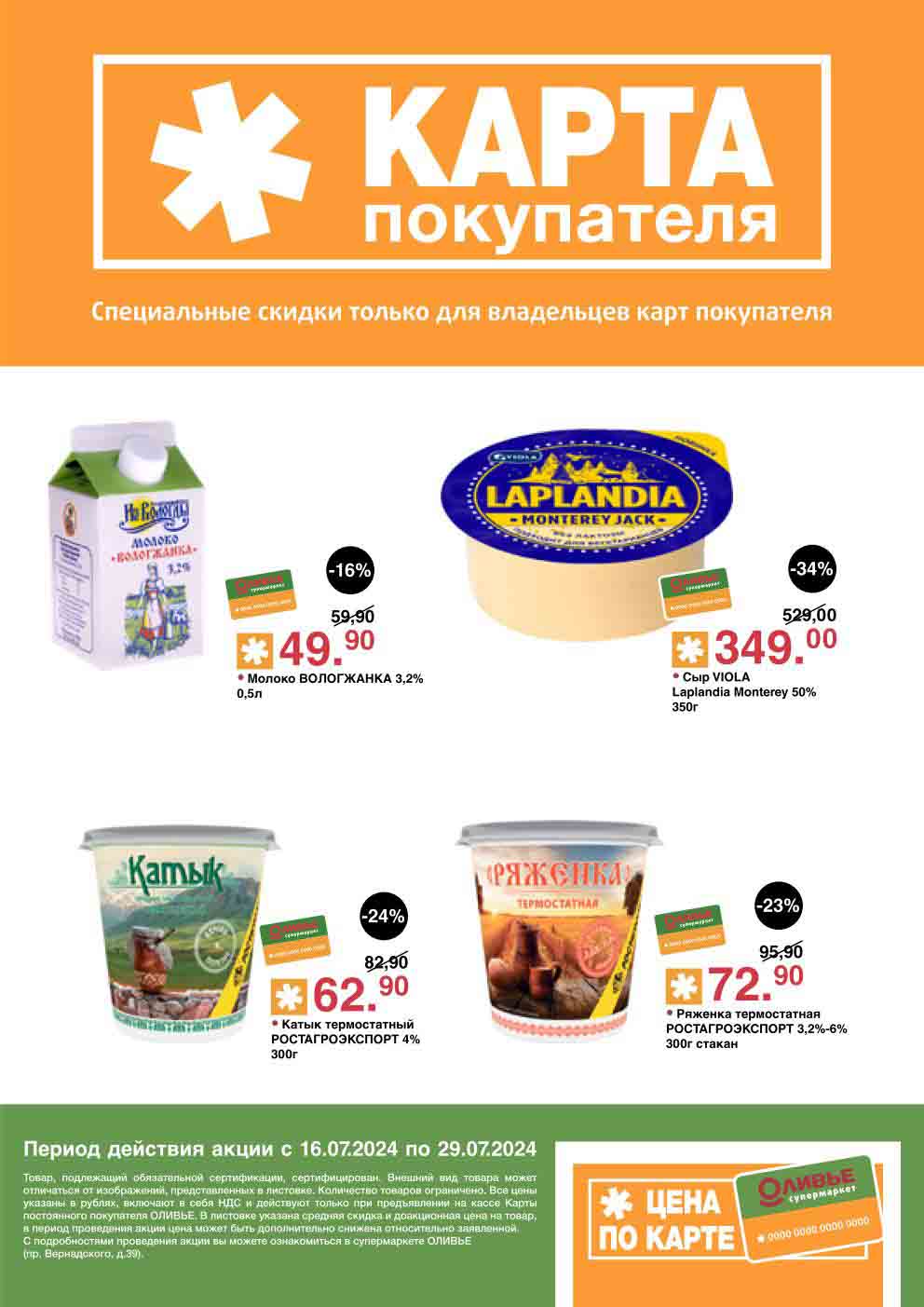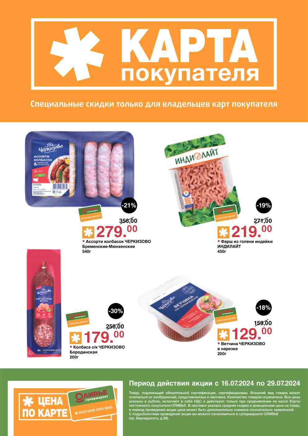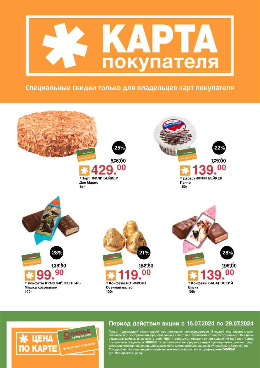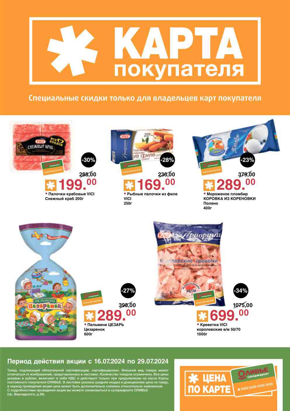 На страницах каталога Оливье вы найдете все свои любимые товары, которые сейчас предлагаются в супермаркете. Не пропустите последние специальные предложения и сэкономьте на покупках. Обратите внимание, что внешний вид товара может отличаться от изображений, представленных в листовке. Кроме того, количество предложенных товаров ограничено. Все цены указаны в рублях и действуют только при предъявлении на кассе карты постоянного покупателя. В период проведения промо, цена может быть дополнительно снижена относительно заявленной.