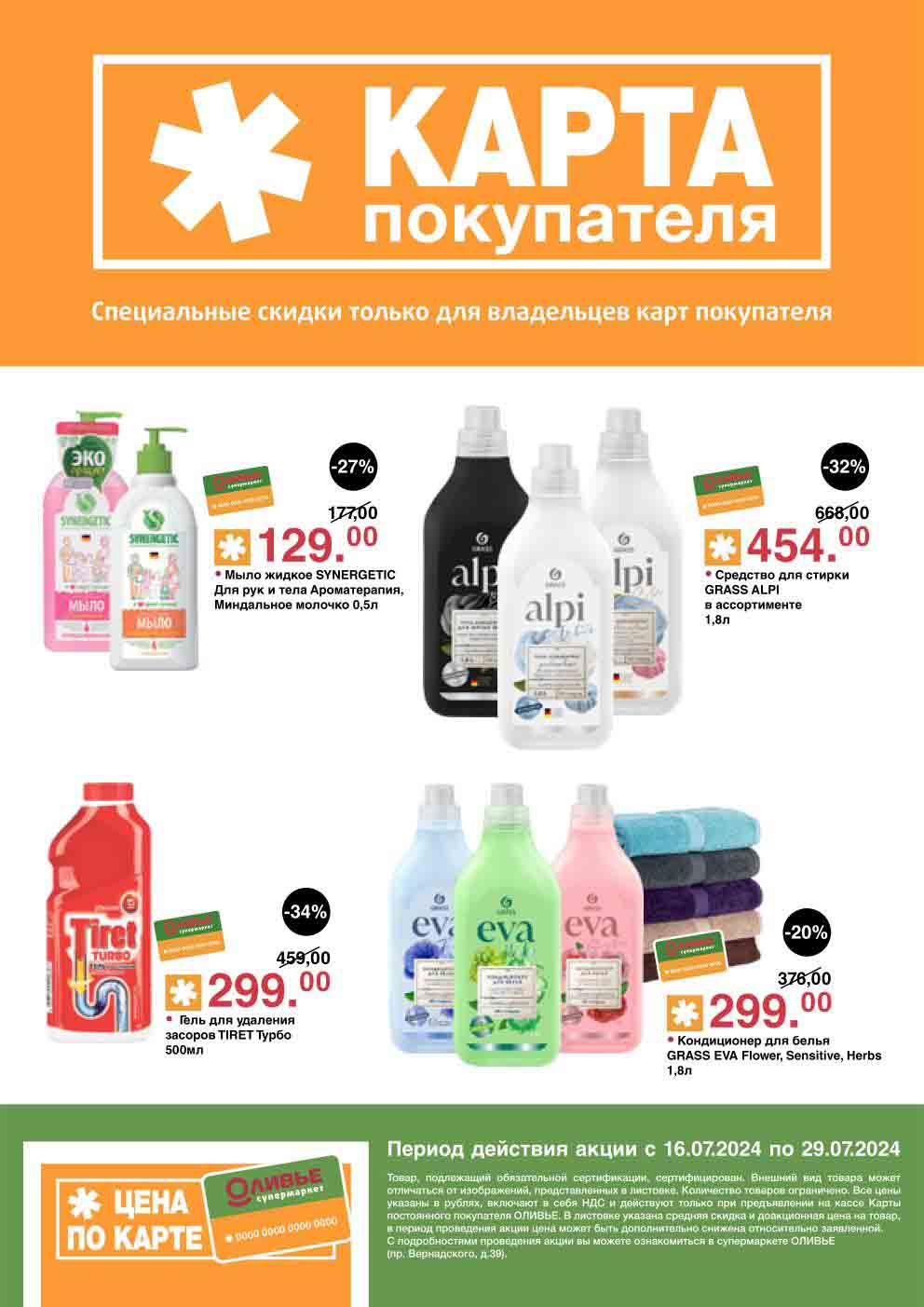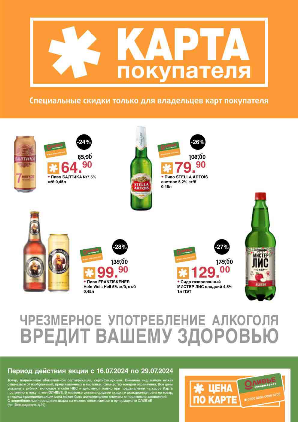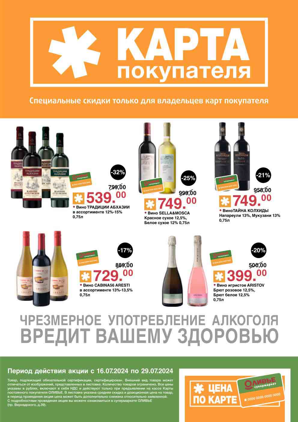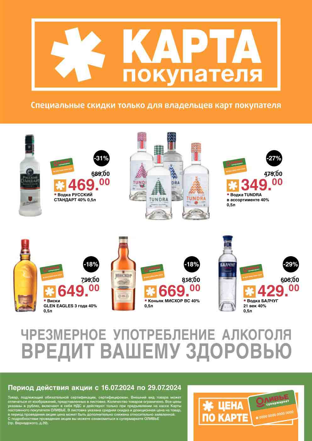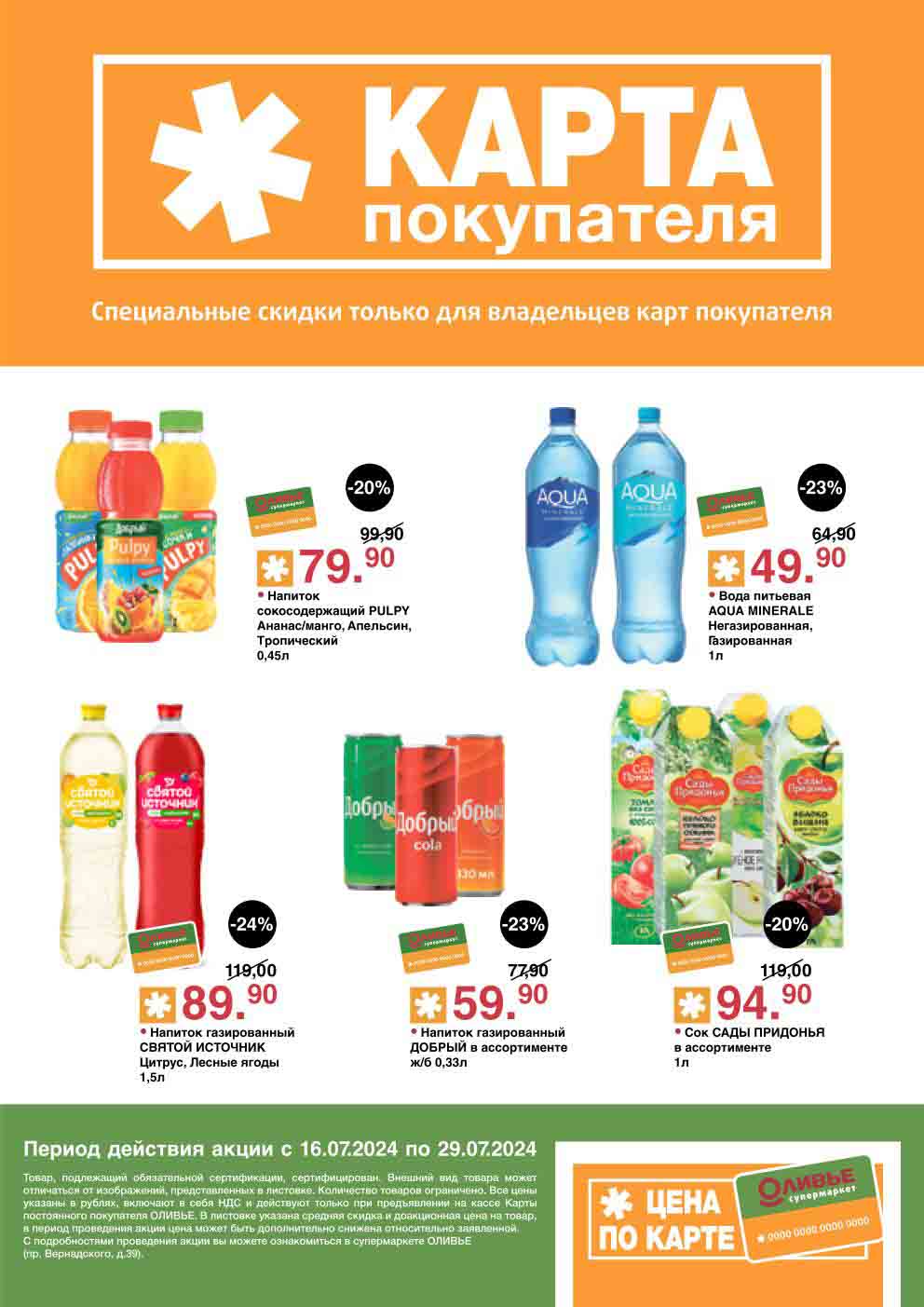 На страницах каталога Оливье вы найдете все свои любимые товары, которые сейчас предлагаются в супермаркете. Не пропустите последние специальные предложения и сэкономьте на покупках. Обратите внимание, что внешний вид товара может отличаться от изображений, представленных в листовке. Кроме того, количество предложенных товаров ограничено. Все цены указаны в рублях и действуют только при предъявлении на кассе карты постоянного покупателя. В период проведения промо, цена может быть дополнительно снижена относительно заявленной.