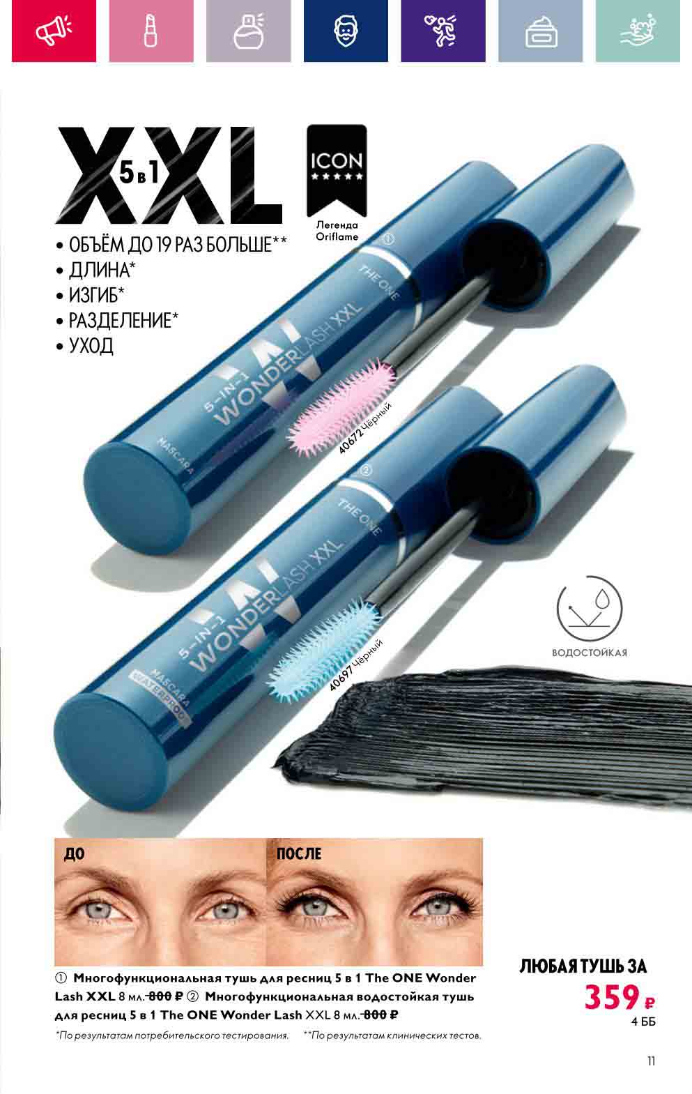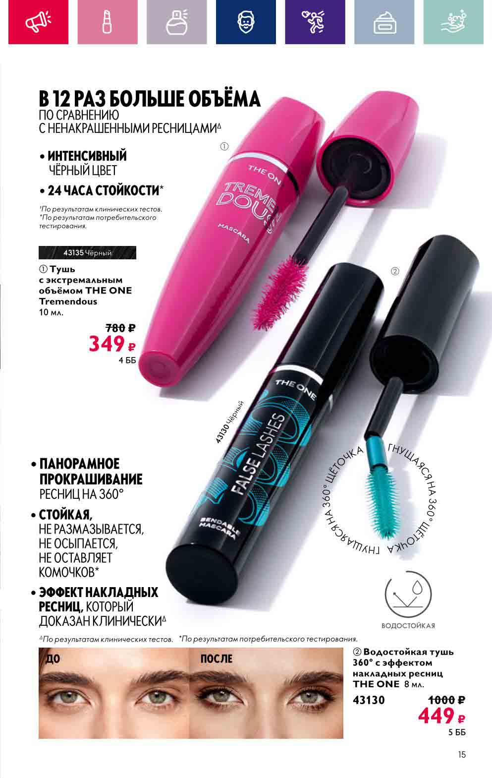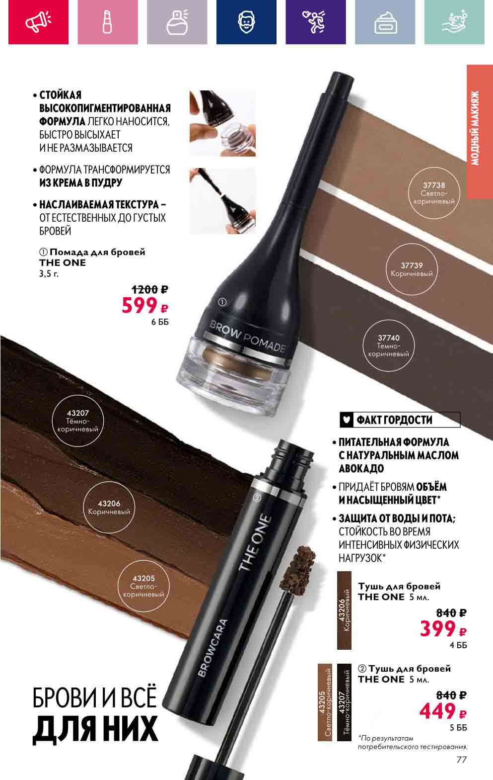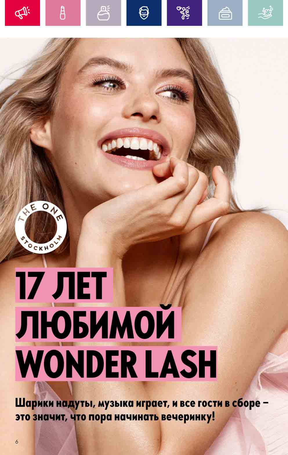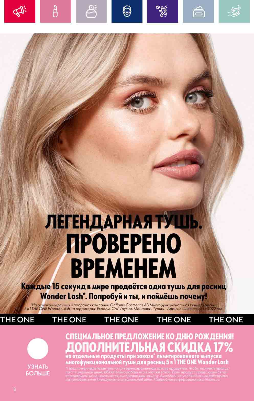 В акционном буклете предложены выгодные цены на различные товары, такие как тушь для ресниц 5 в 1 The one Wonder Lash за 399 руб., глянцевая губная помада-кушон The One irresistible Touch за 599 руб., парфюмерная вода Miss Giordani за 1999 руб. и многое другое.