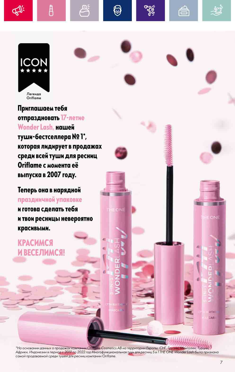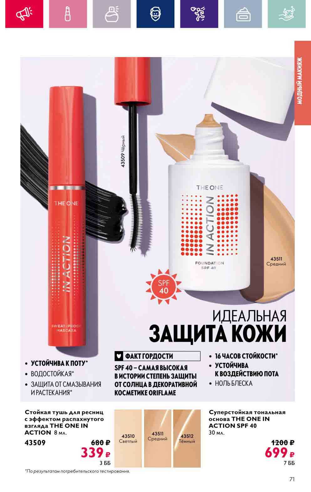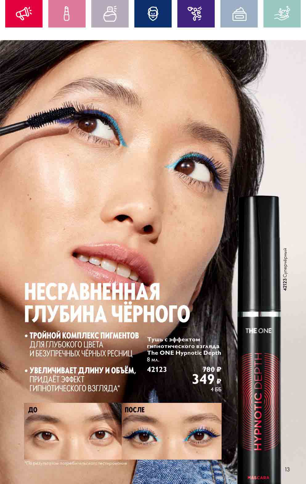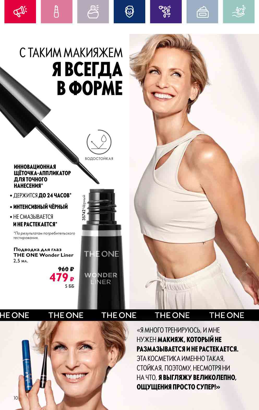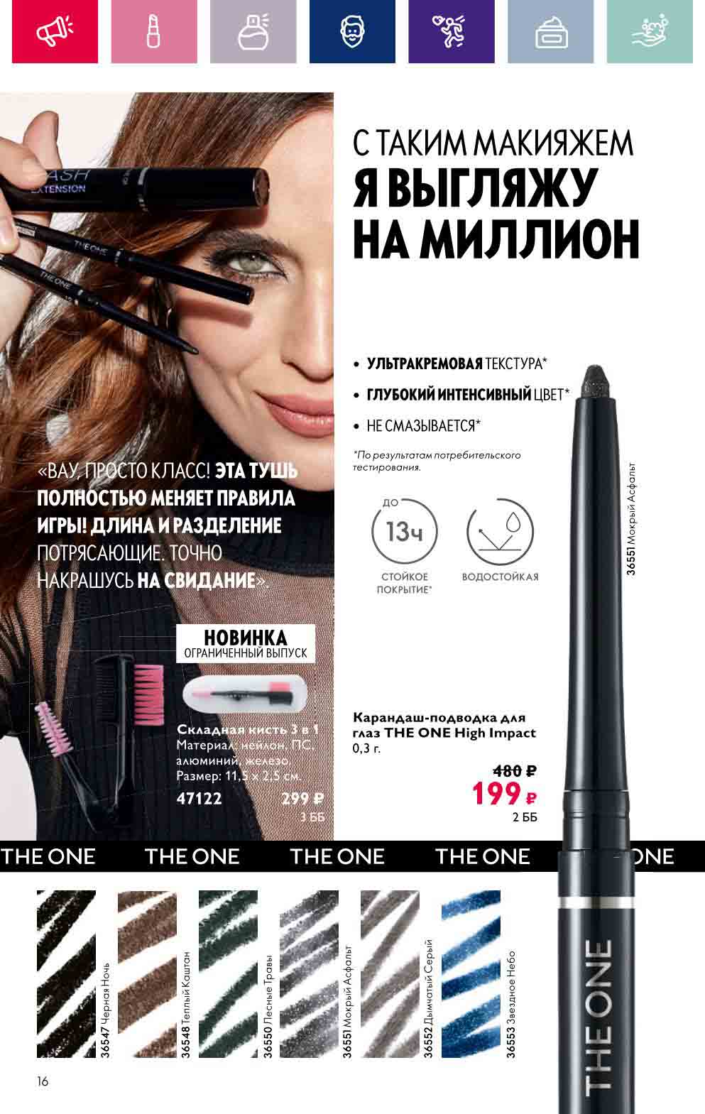 В акционном буклете предложены выгодные цены на различные товары, такие как тушь для ресниц 5 в 1 The one Wonder Lash за 399 руб., глянцевая губная помада-кушон The One irresistible Touch за 599 руб., парфюмерная вода Miss Giordani за 1999 руб. и многое другое.