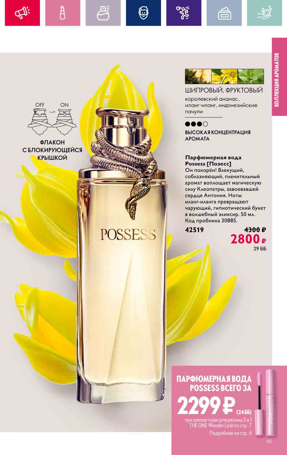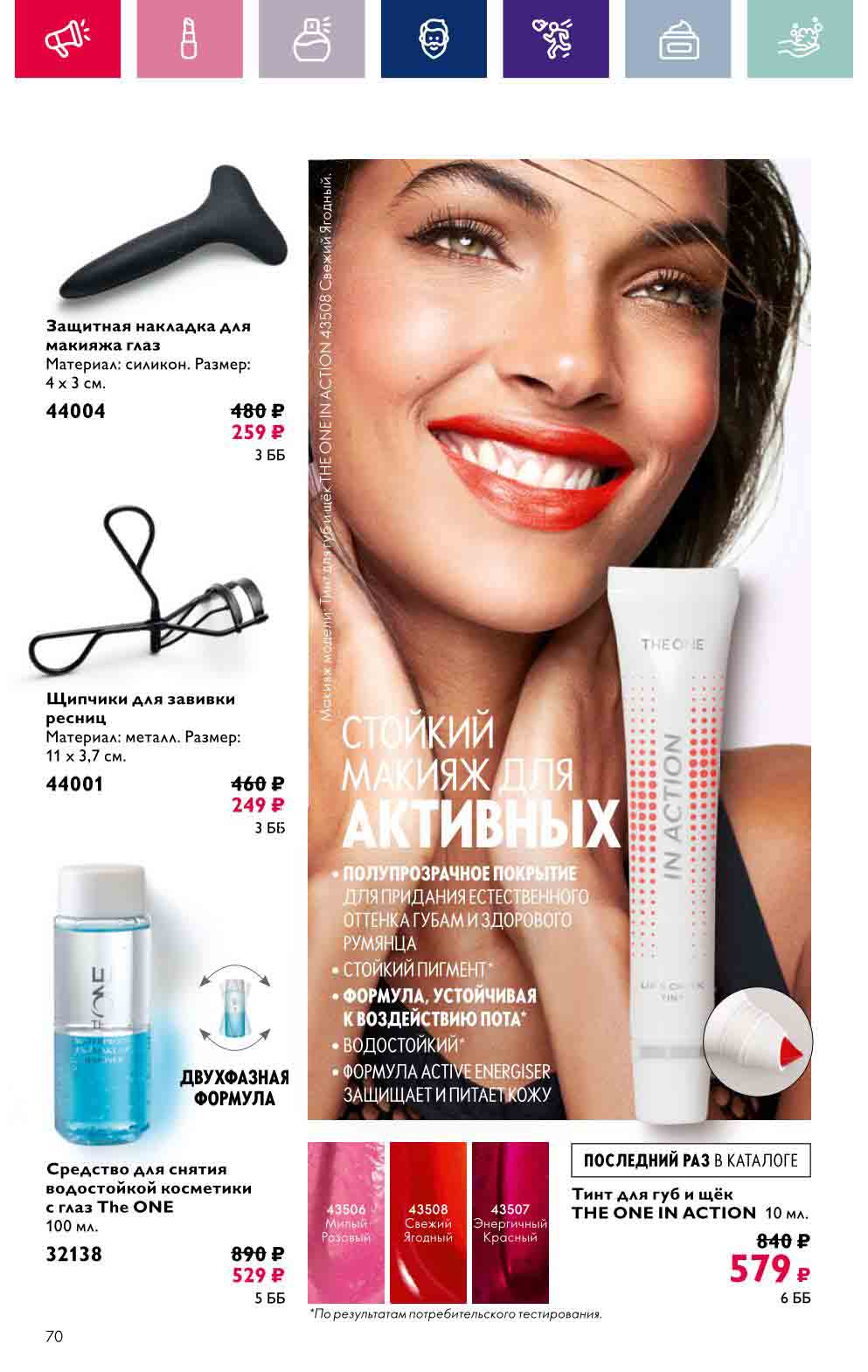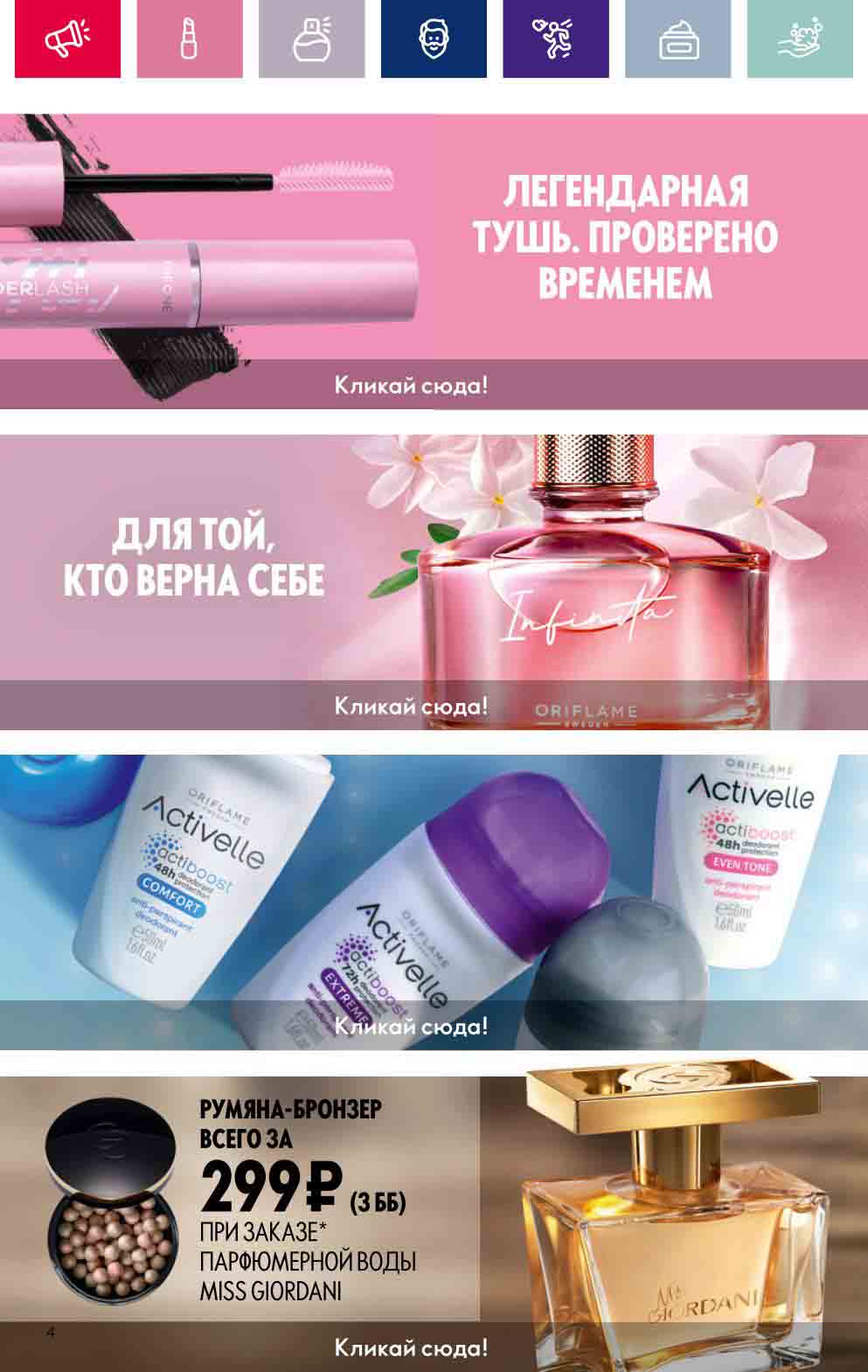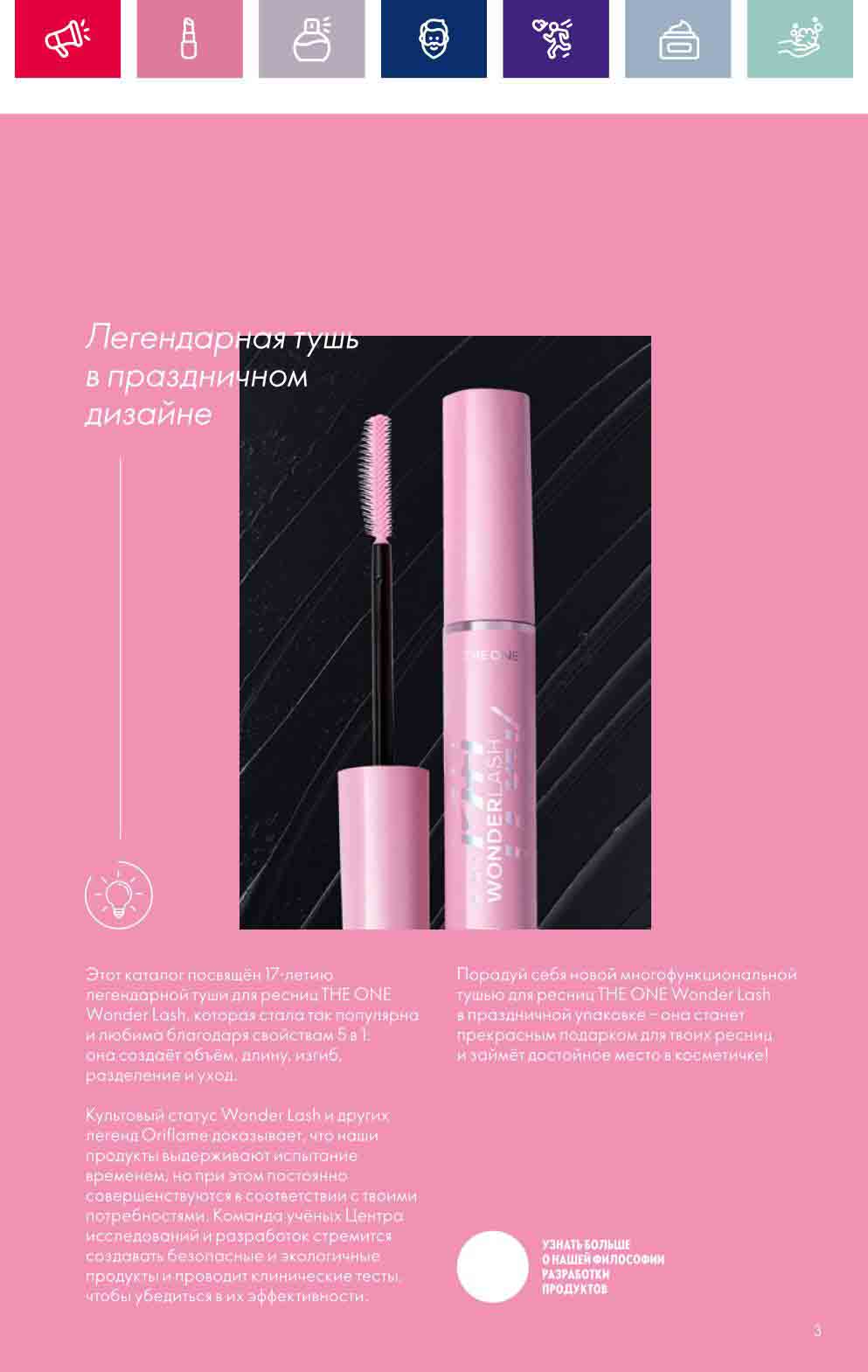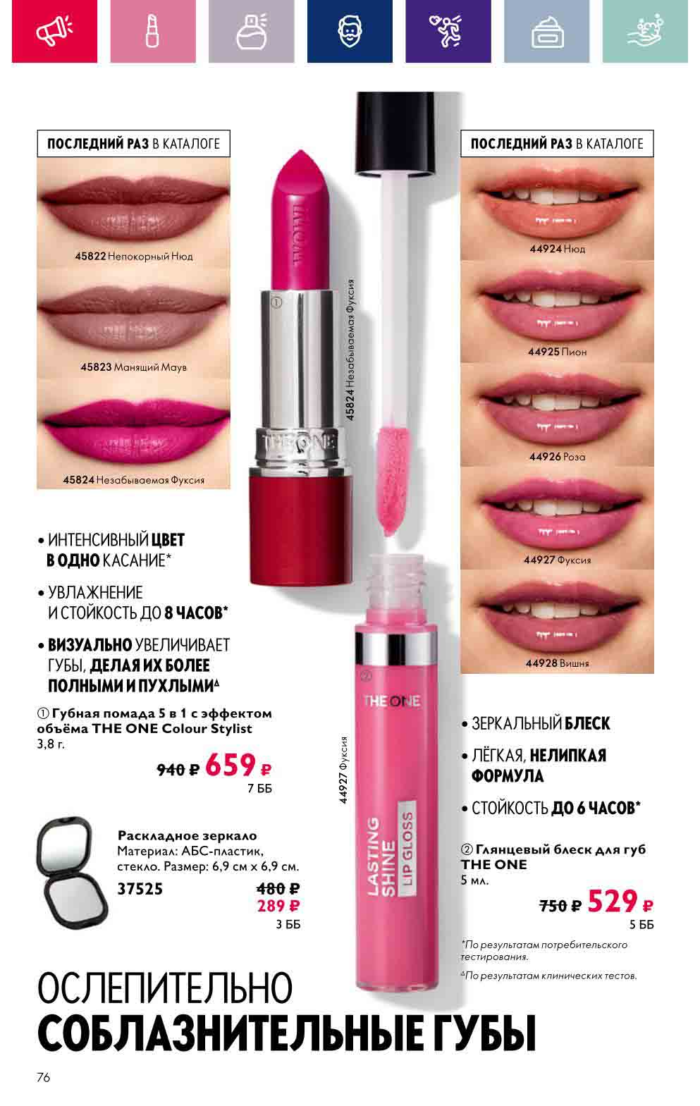 В акционном буклете предложены выгодные цены на различные товары, такие как тушь для ресниц 5 в 1 The one Wonder Lash за 399 руб., глянцевая губная помада-кушон The One irresistible Touch за 599 руб., парфюмерная вода Miss Giordani за 1999 руб. и многое другое.