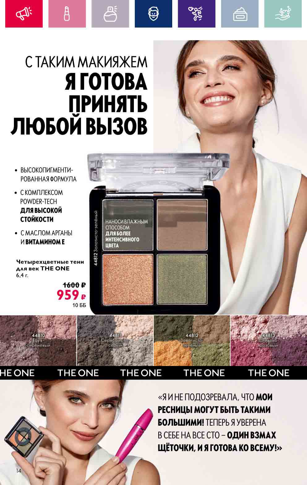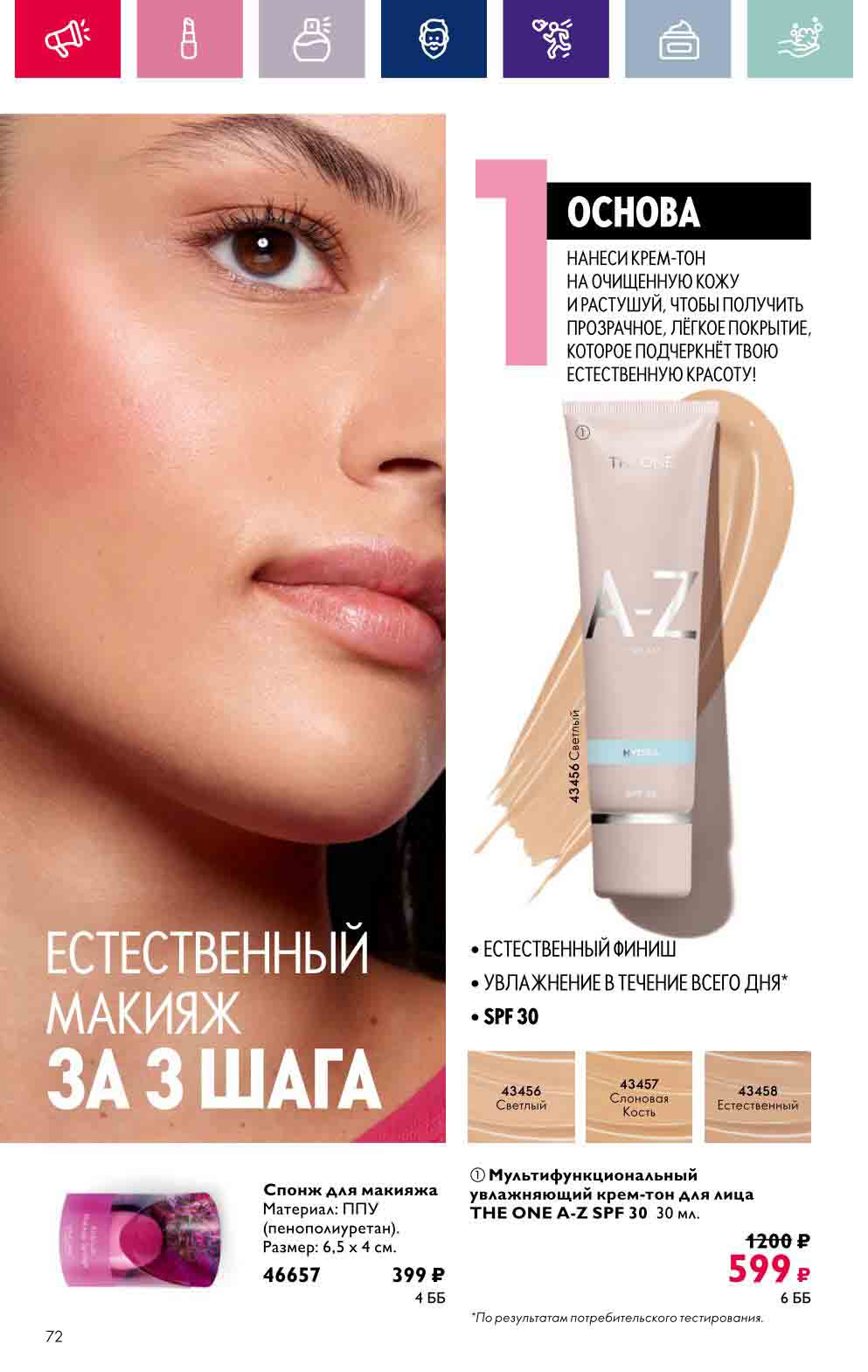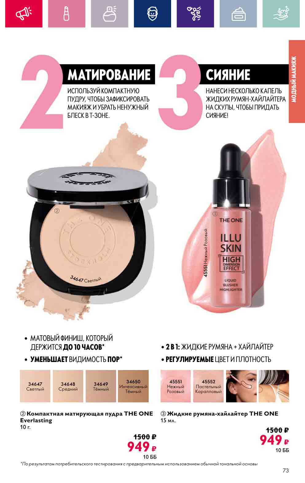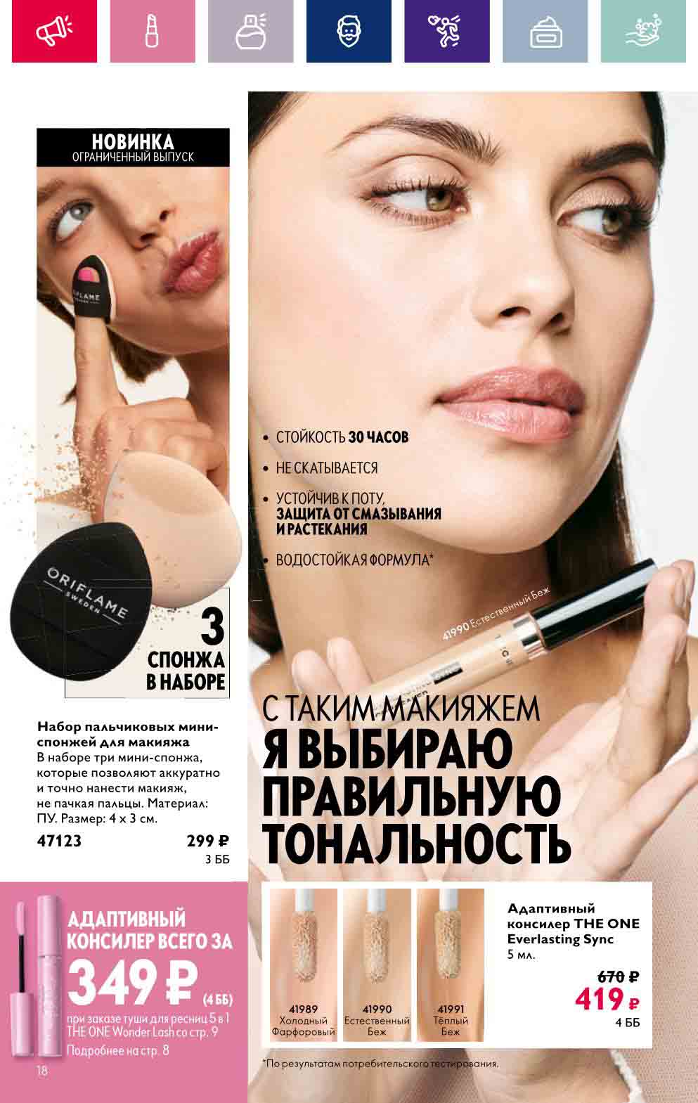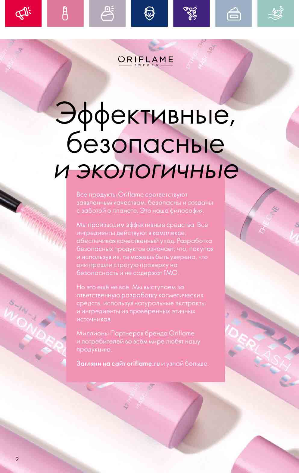 В акционном буклете предложены выгодные цены на различные товары, такие как тушь для ресниц 5 в 1 The one Wonder Lash за 399 руб., глянцевая губная помада-кушон The One irresistible Touch за 599 руб., парфюмерная вода Miss Giordani за 1999 руб. и многое другое.