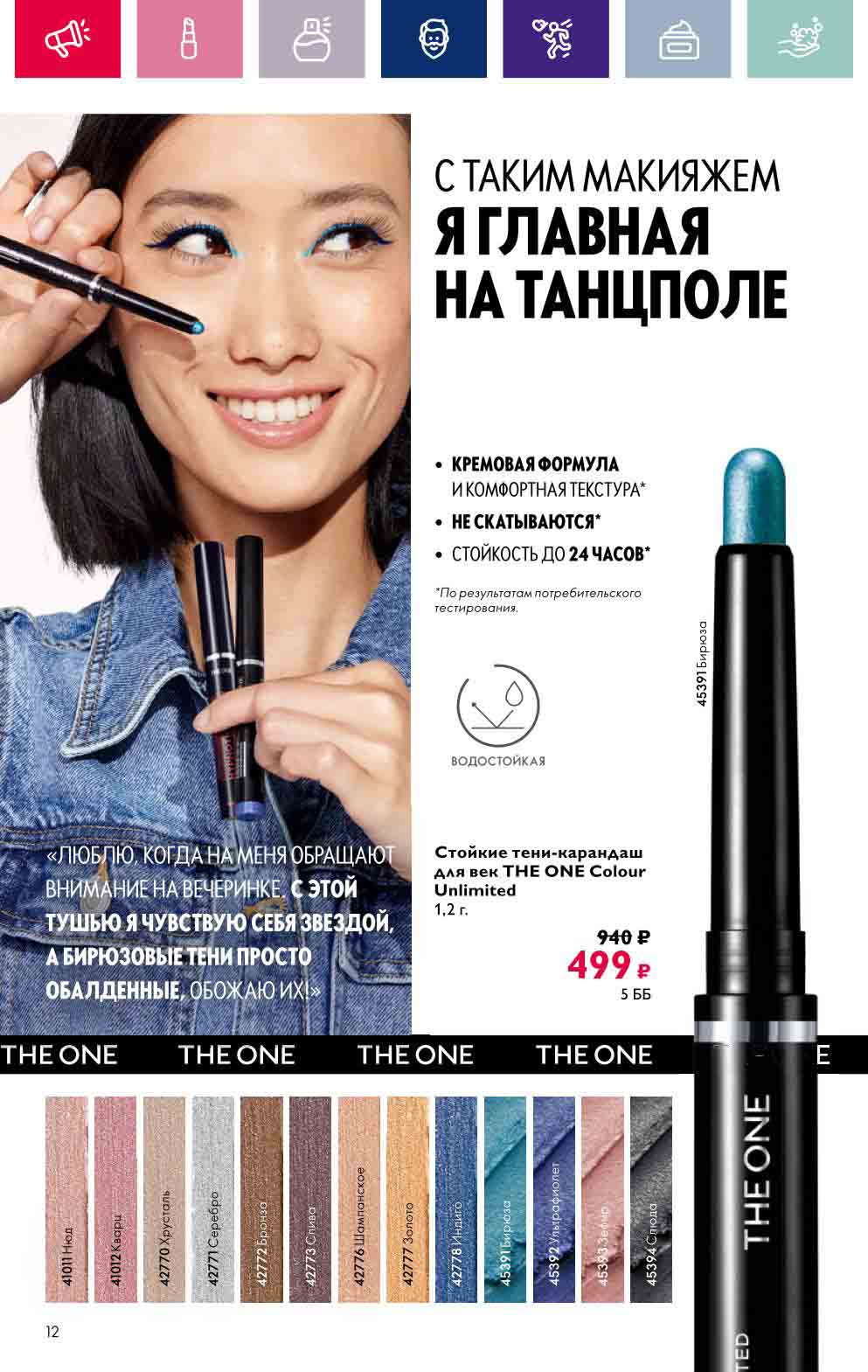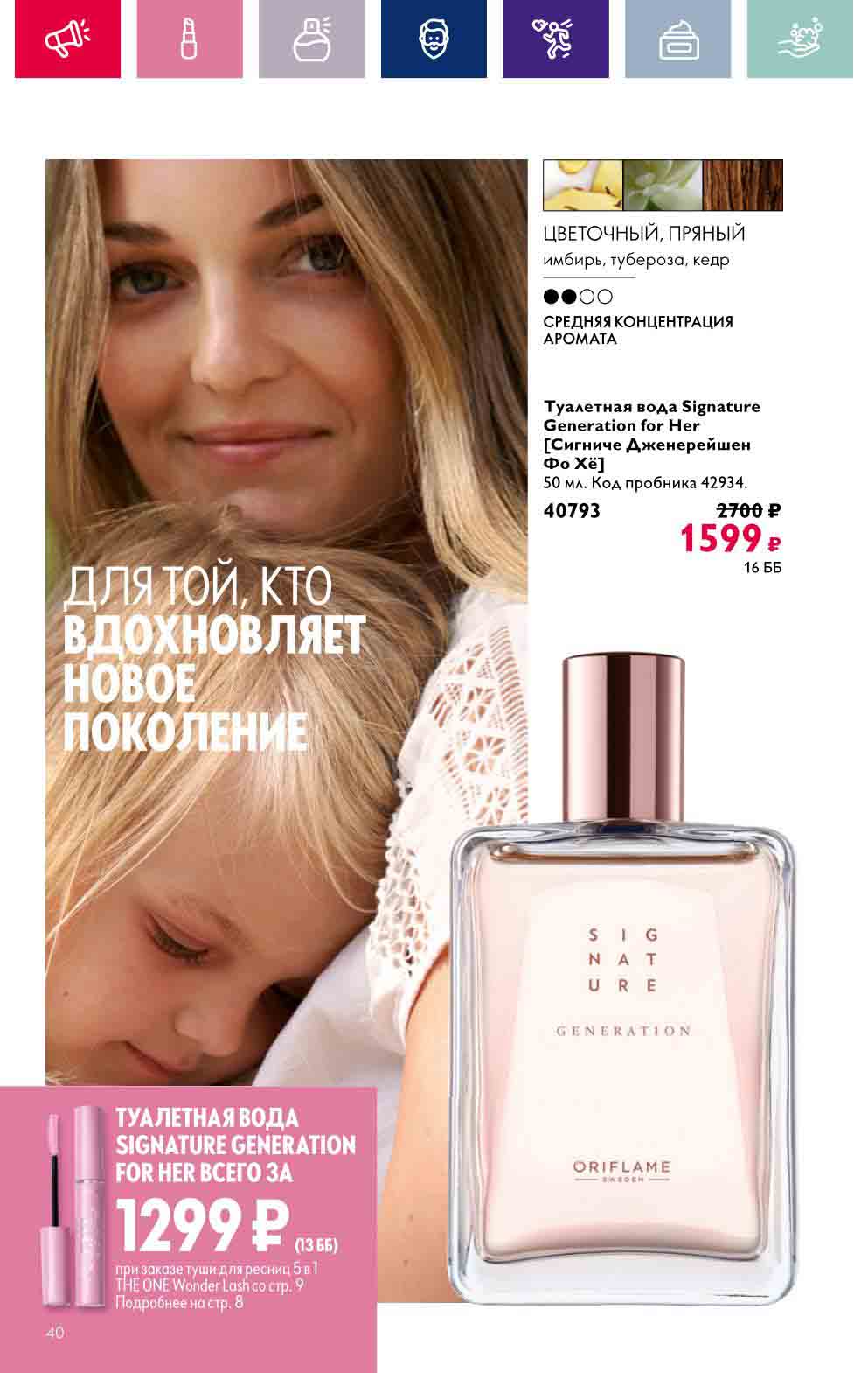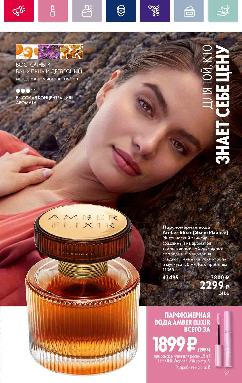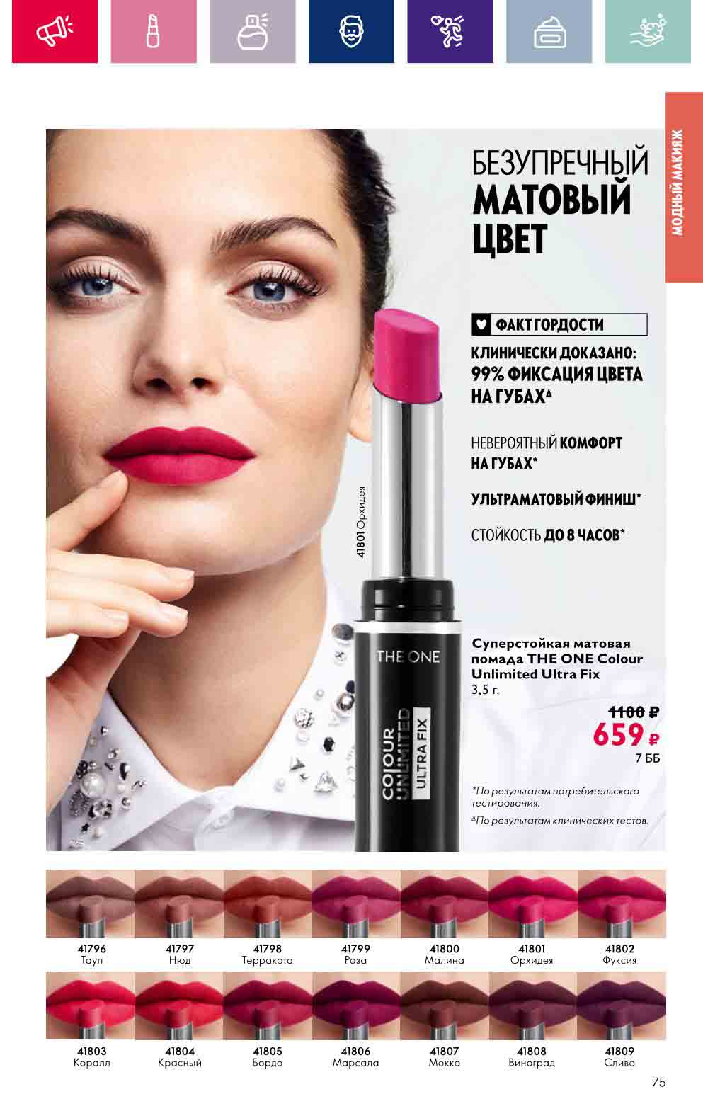 В акционном буклете предложены выгодные цены на различные товары, такие как тушь для ресниц 5 в 1 The one Wonder Lash за 399 руб., глянцевая губная помада-кушон The One irresistible Touch за 599 руб., парфюмерная вода Miss Giordani за 1999 руб. и многое другое.