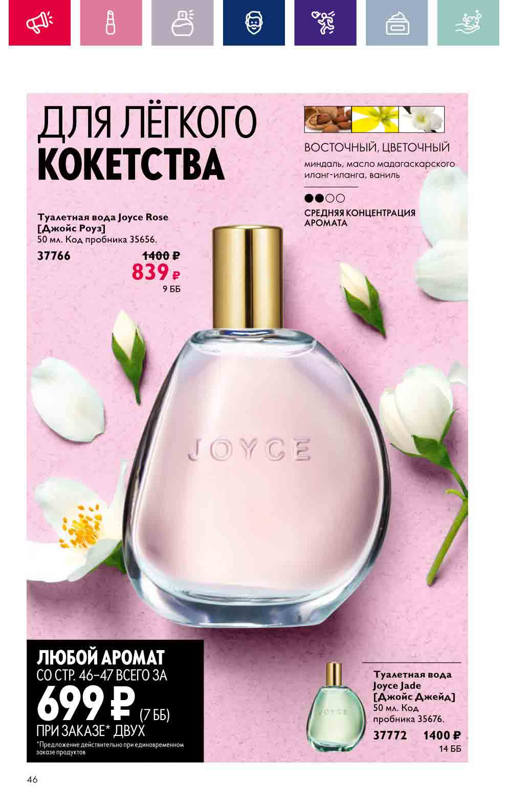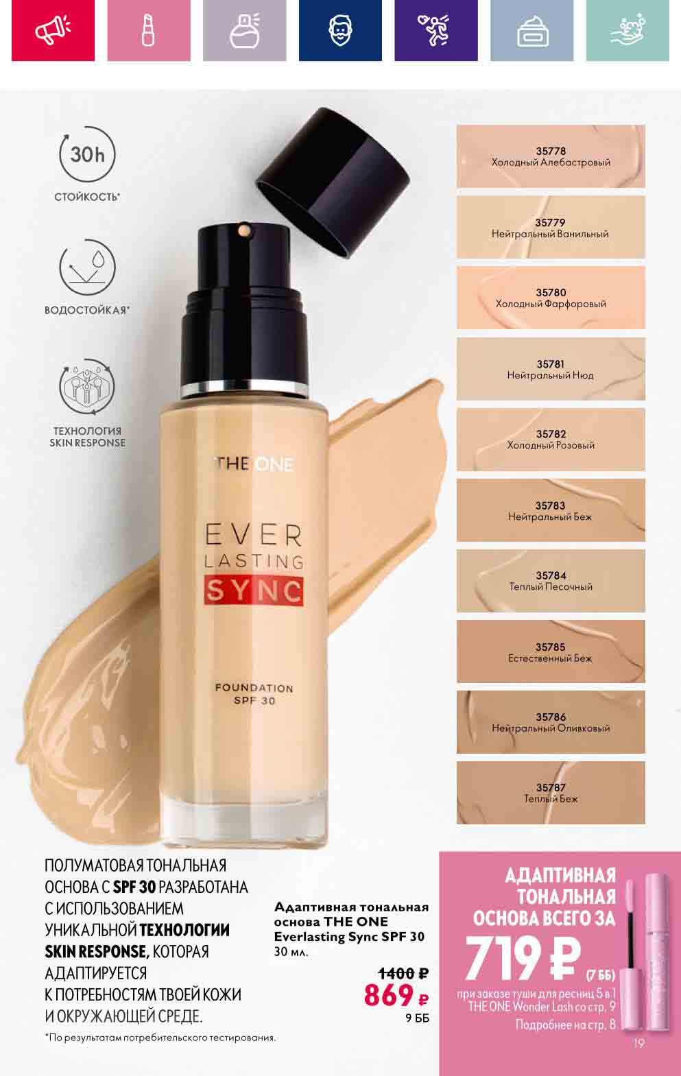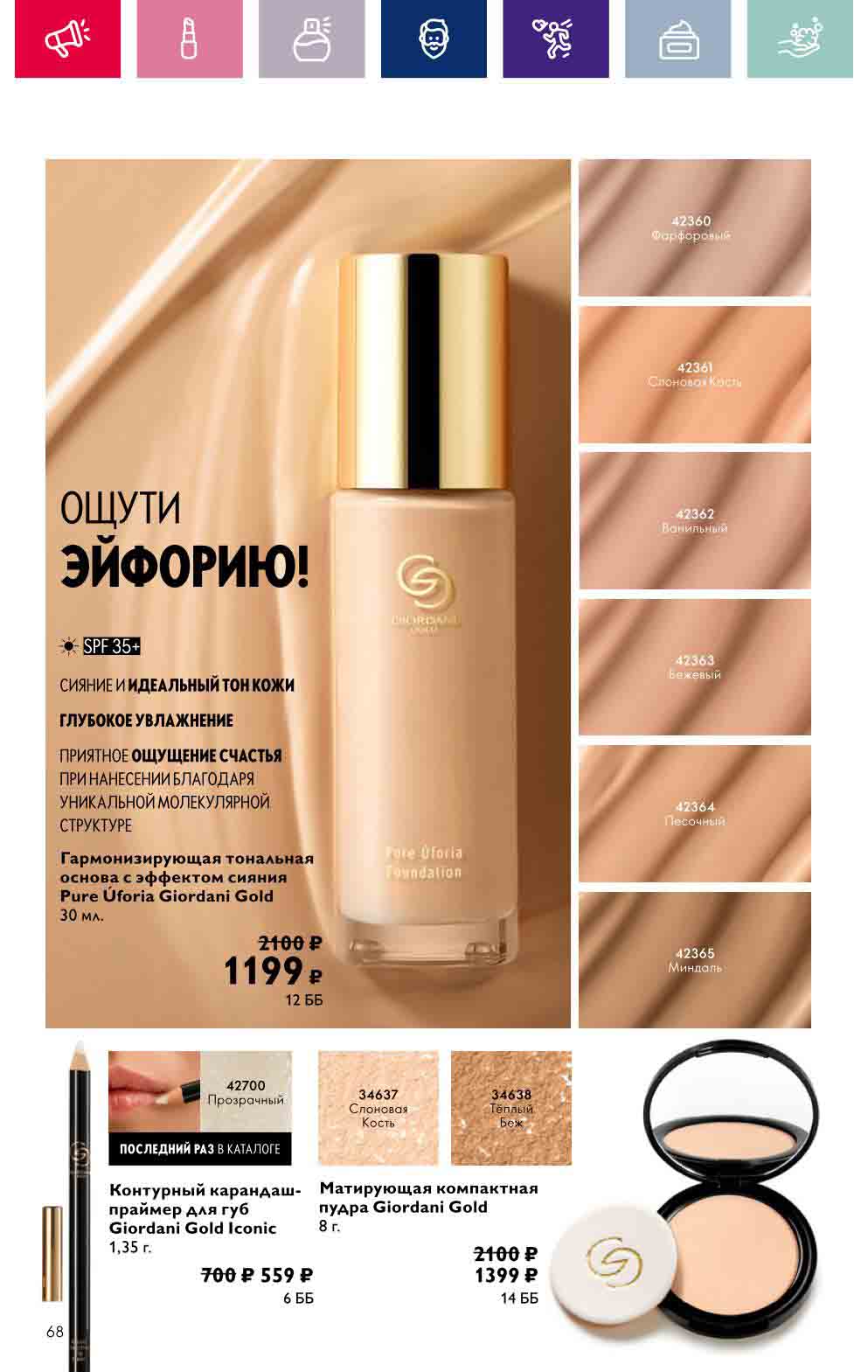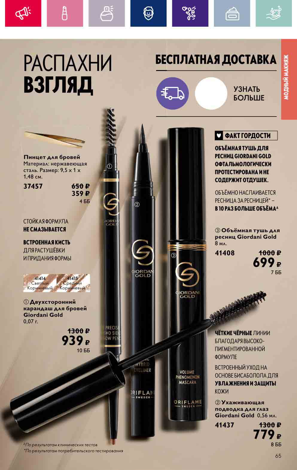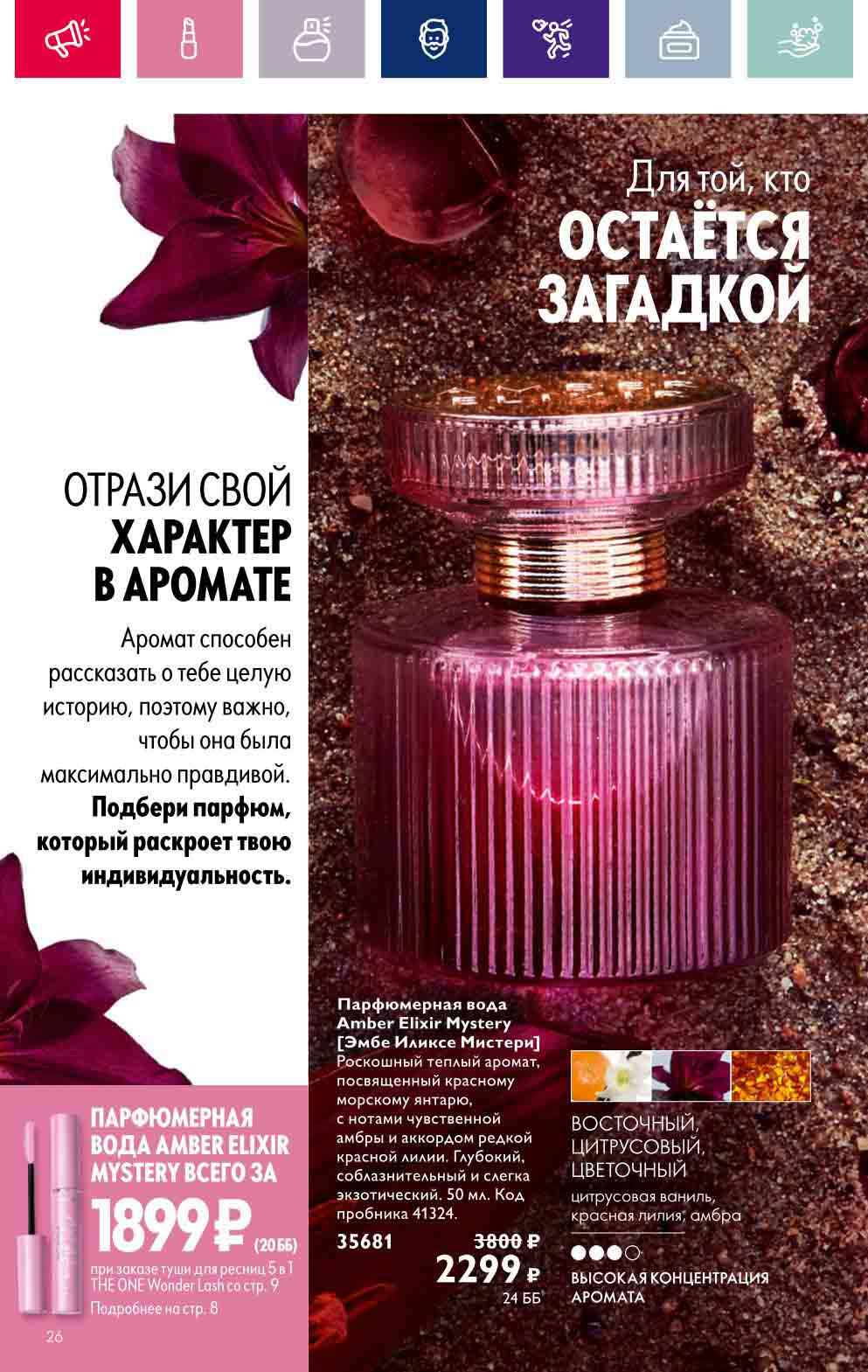 В акционном буклете предложены выгодные цены на различные товары, такие как тушь для ресниц 5 в 1 The one Wonder Lash за 399 руб., глянцевая губная помада-кушон The One irresistible Touch за 599 руб., парфюмерная вода Miss Giordani за 1999 руб. и многое другое.