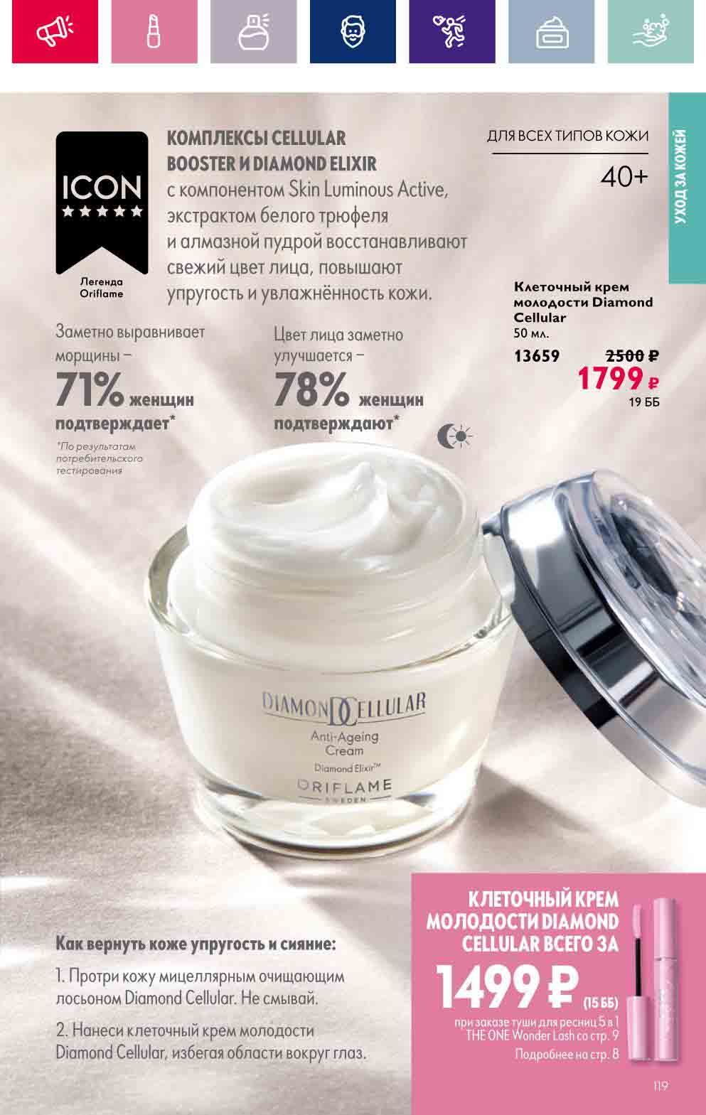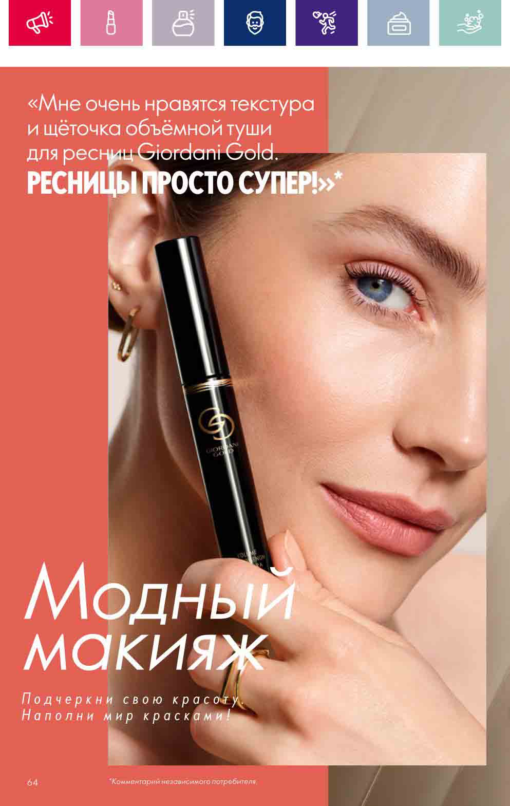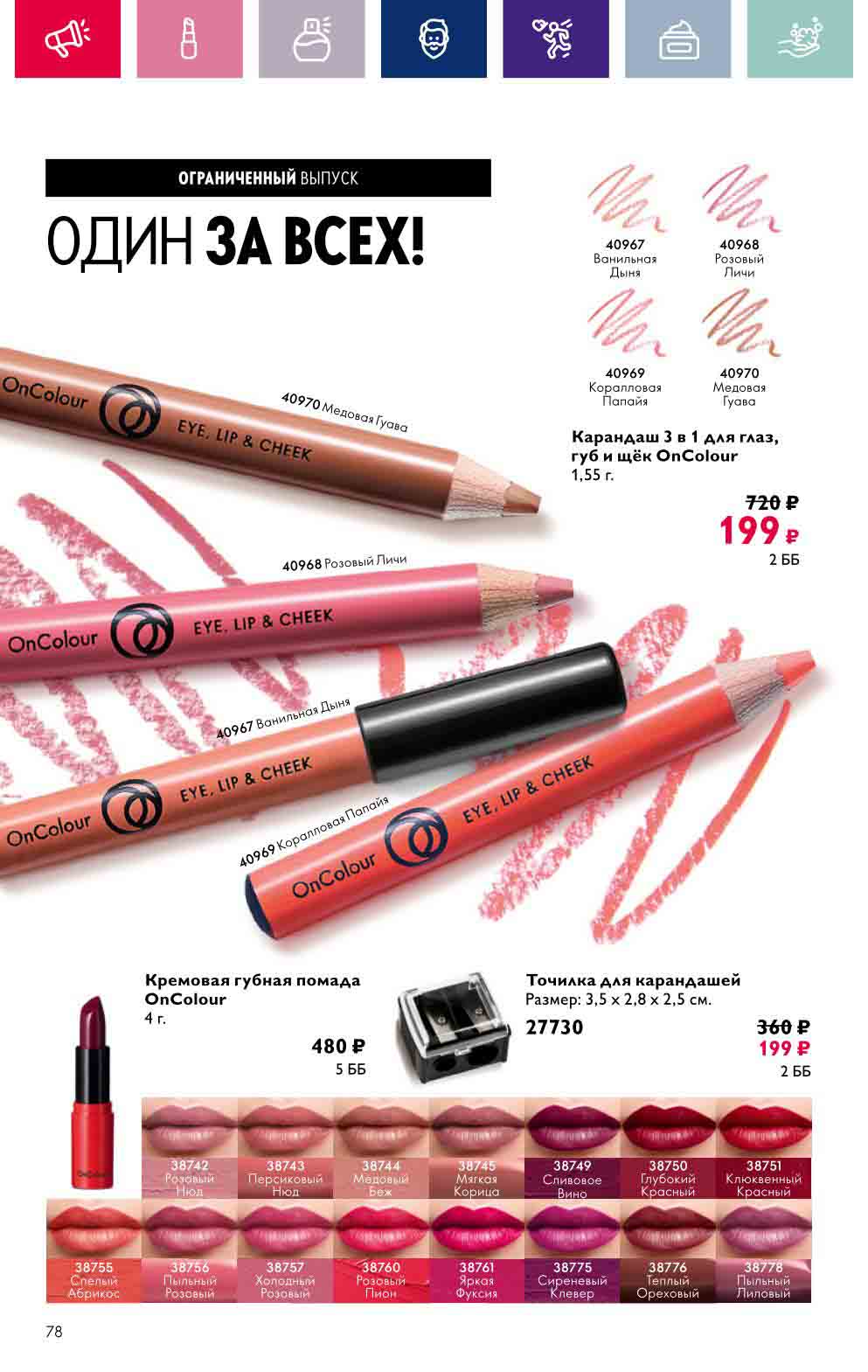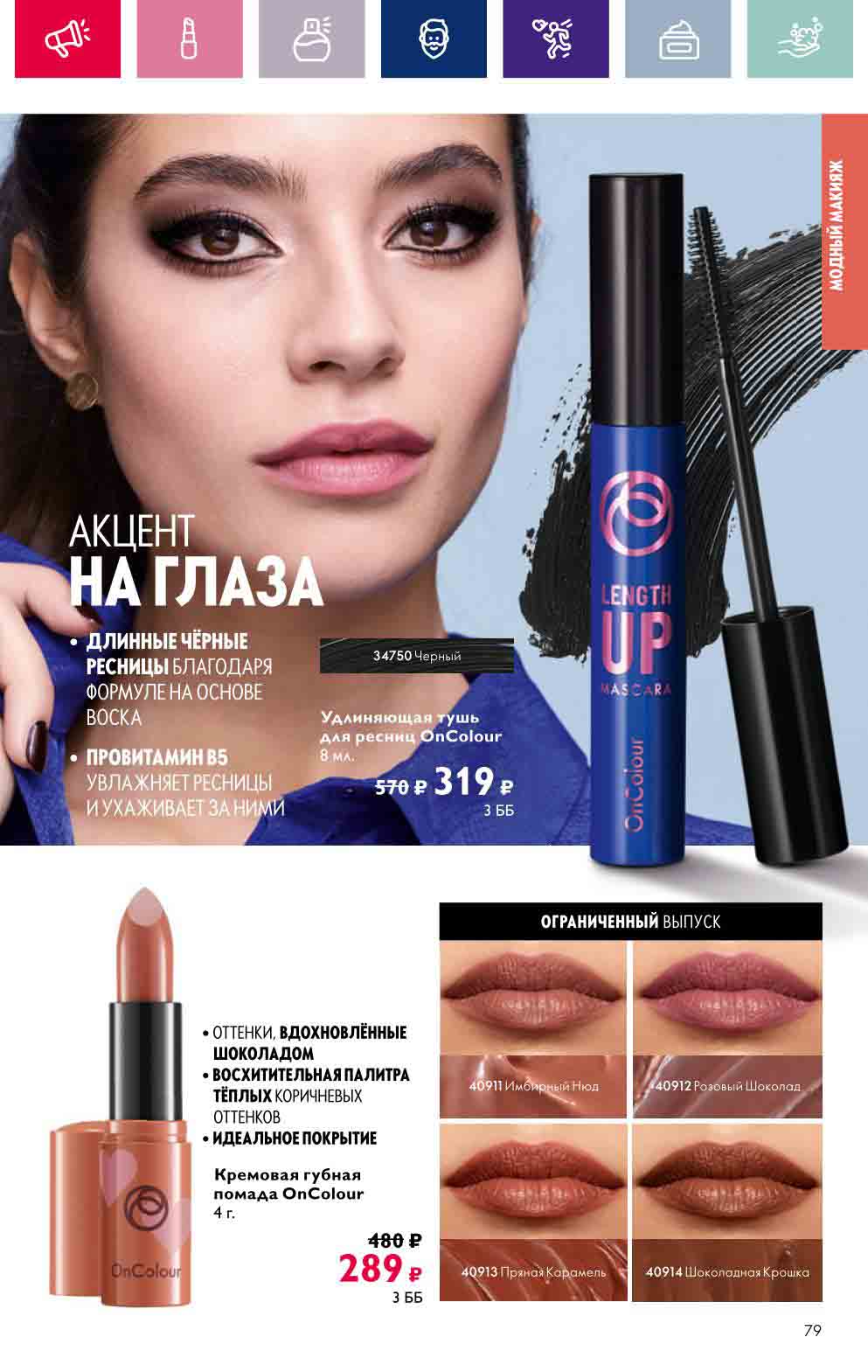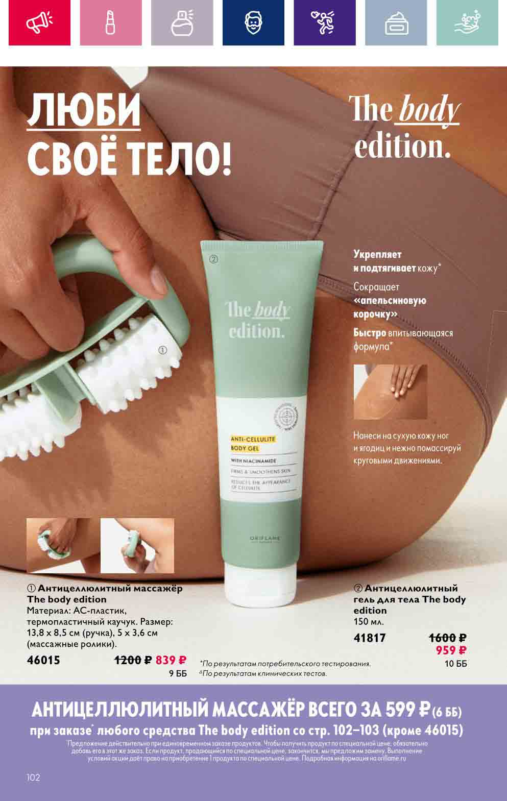В акционном буклете предложены выгодные цены на различные товары, такие как тушь для ресниц 5 в 1 The one Wonder Lash за 399 руб., глянцевая губная помада-кушон The One irresistible Touch за 599 руб., парфюмерная вода Miss Giordani за 1999 руб. и многое другое.