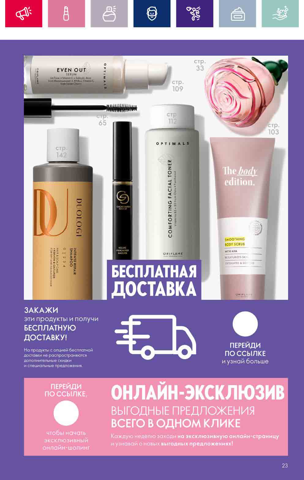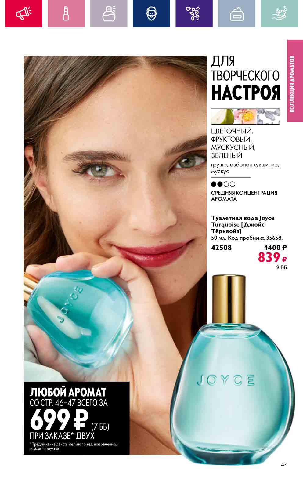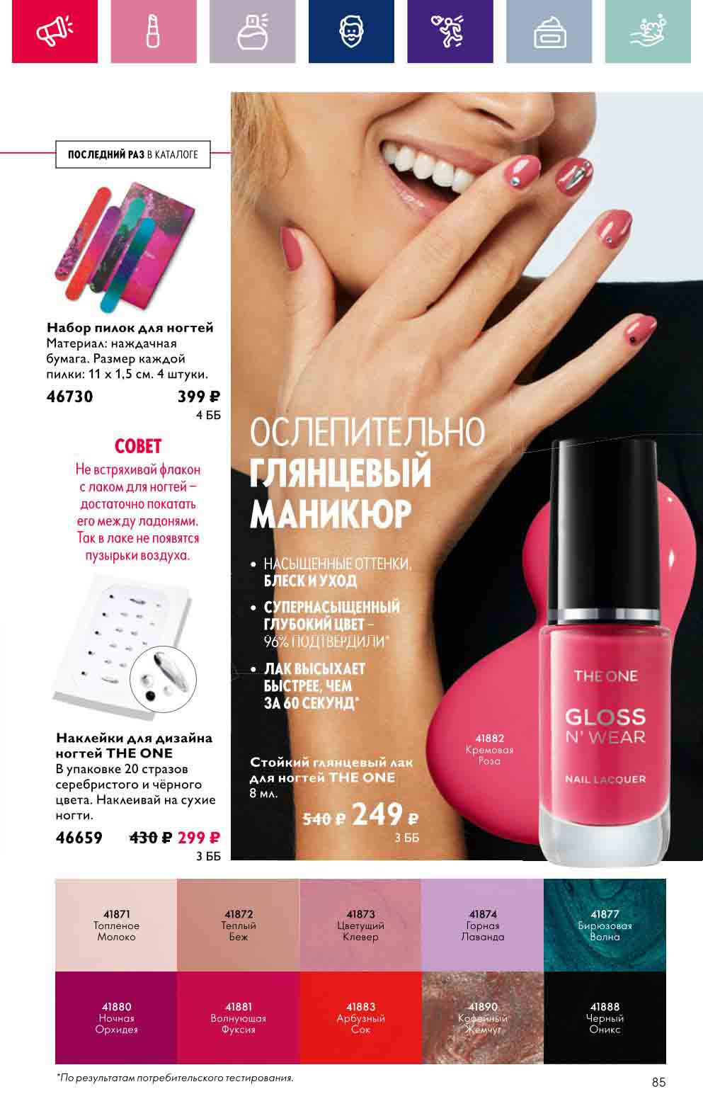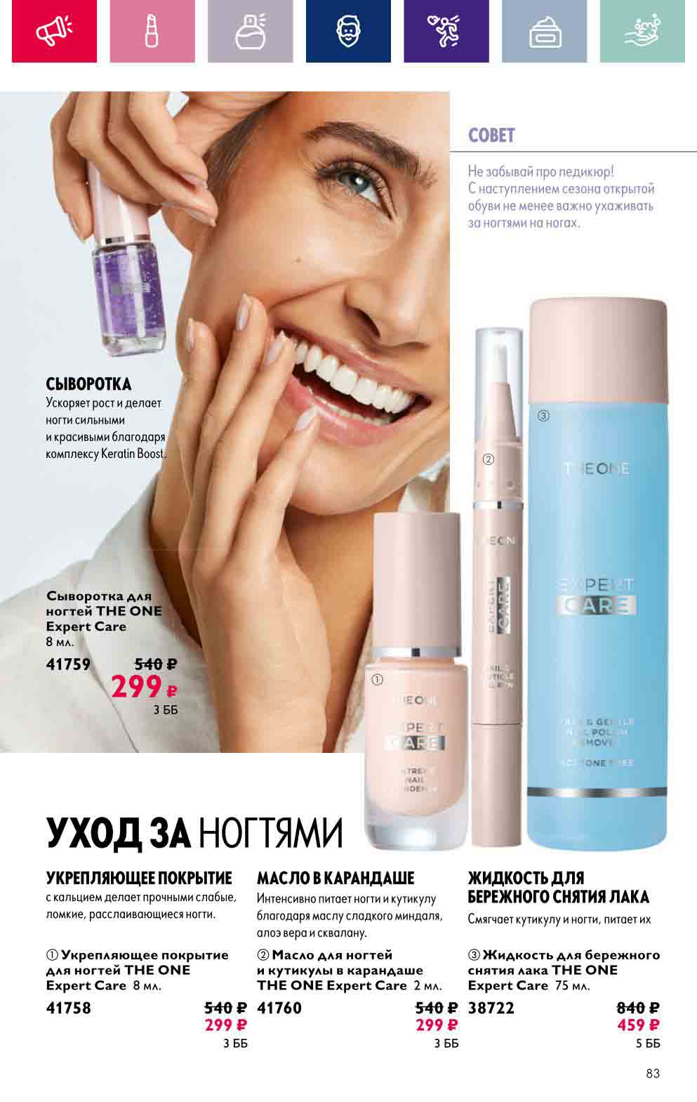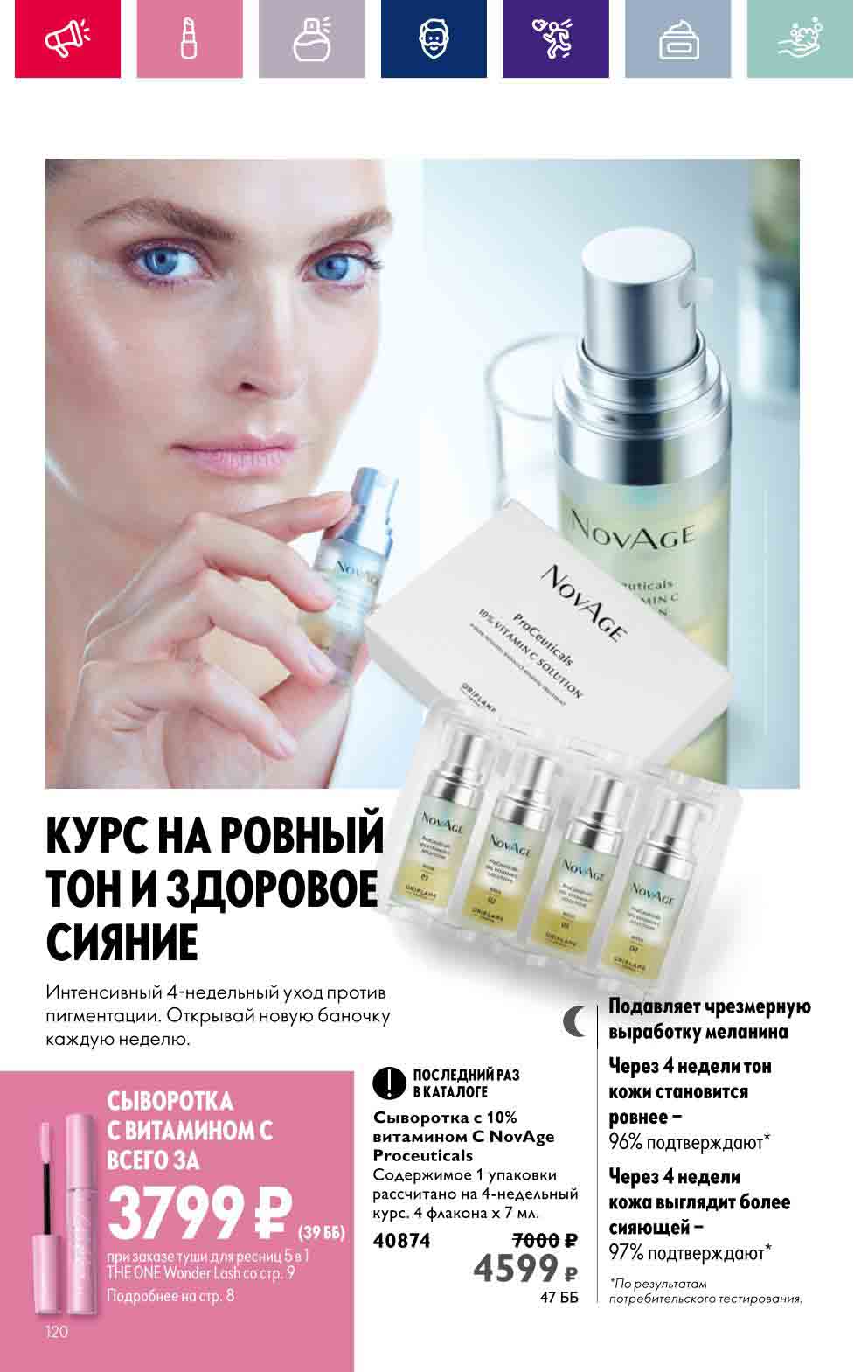 В акционном буклете предложены выгодные цены на различные товары, такие как тушь для ресниц 5 в 1 The one Wonder Lash за 399 руб., глянцевая губная помада-кушон The One irresistible Touch за 599 руб., парфюмерная вода Miss Giordani за 1999 руб. и многое другое.