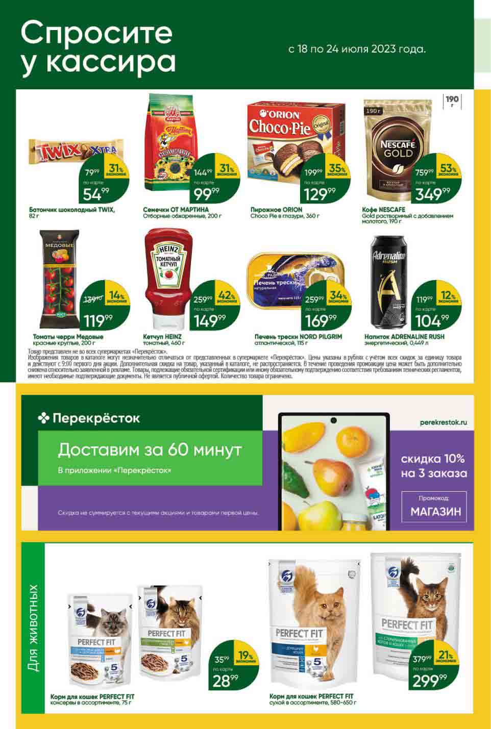 Смотрите еженедельный, новый каталог Перекресток и не переплачивайте. На страницах каталога Перекресток вы найдете все свои любимые товары, которые сейчас предлагаются в супермаркете. Не пропустите последние специальные предложения и сэкономьте на покупках. Изображение товара в каталоге может отличаться от представленных на полках. Количество товара ограничено и есть не во всех супермаркетах. Дополнительная скидка на товар указанный в каталоге не распространяется. Цены по акции Перекресток действуют в городах: Москва, Балашиха, Химки, Подольск, Королев, Мытищи, Люберцы, Электросталь, Коломна, Одинцово, Железнодорожный, Серпухов, Орехово-Зуево, Красногорск, Щелково, Сергиев Посад, Пушкино, Жуковский, Ногинск, Раменское и многих других населенных пунктах Московского региона.