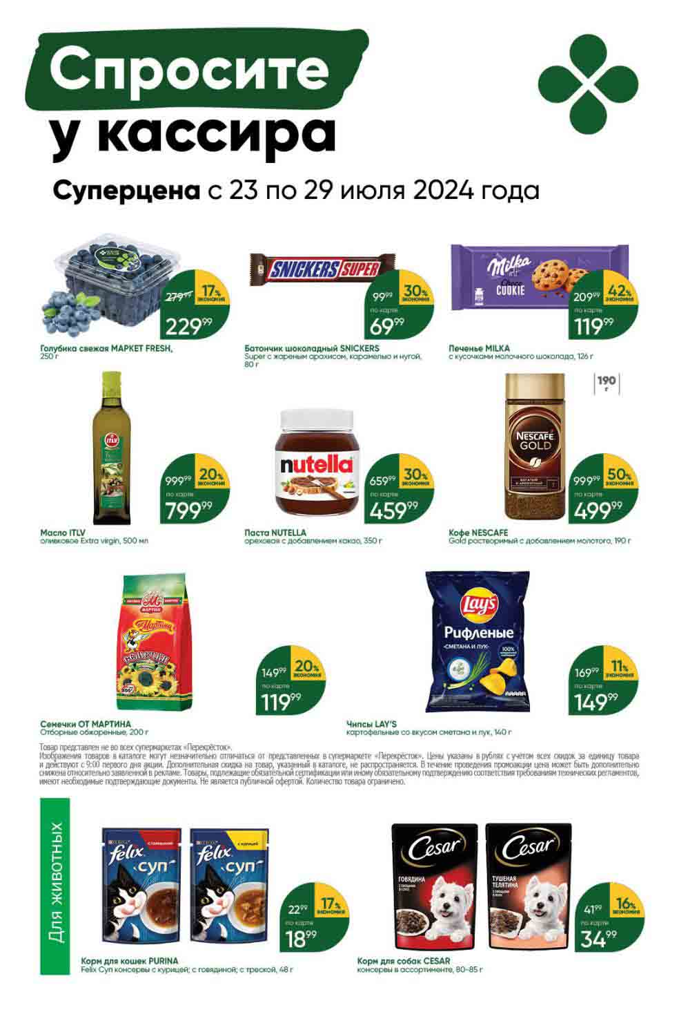 Смотрите еженедельный, новый каталог Перекресток и не переплачивайте. На страницах каталога Перекресток вы найдете все свои любимые товары, которые сейчас предлагаются в супермаркете. Не пропустите последние специальные предложения и сэкономьте на покупках. Изображение товара в каталоге может отличаться от представленных на полках. Количество товара ограничено и есть не во всех супермаркетах. Дополнительная скидка на товар указанный в каталоге не распространяется. Цены по акции Перекресток действуют в городах: Москва, Балашиха, Химки, Подольск, Королев, Мытищи, Люберцы, Электросталь, Коломна, Одинцово, Железнодорожный, Серпухов, Орехово-Зуево, Красногорск, Щелково, Сергиев Посад, Пушкино, Жуковский, Ногинск, Раменское и многих других населенных пунктах Московского региона.