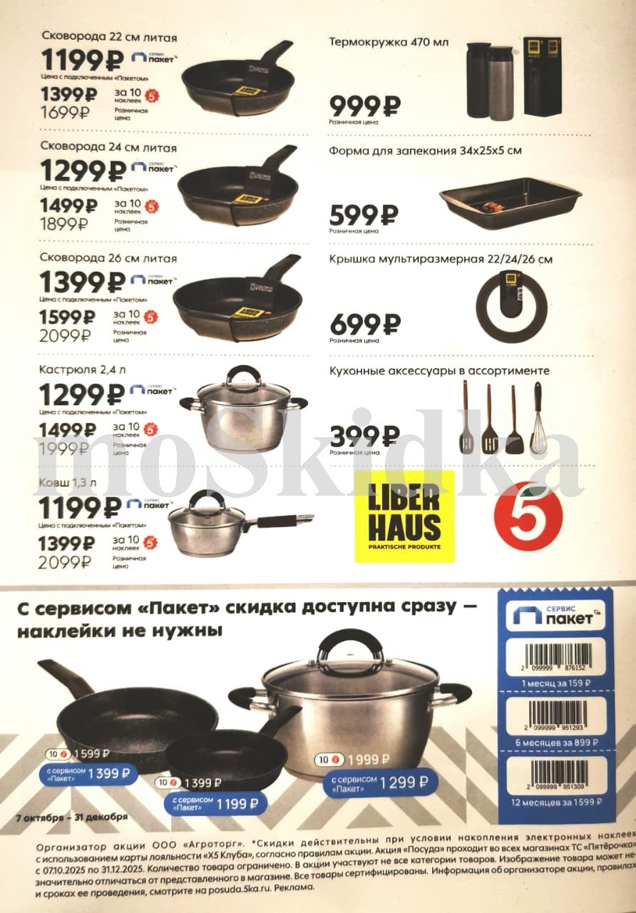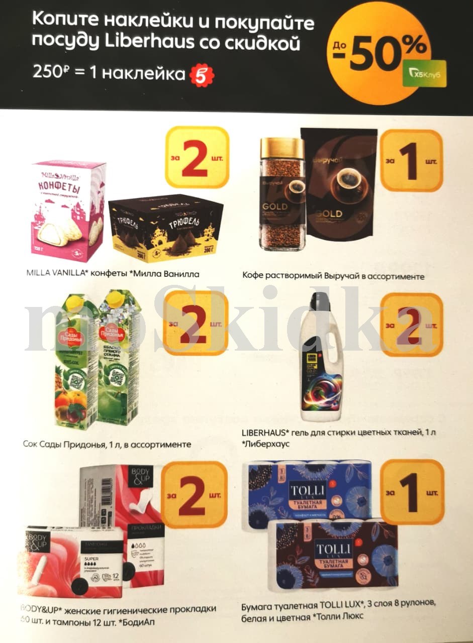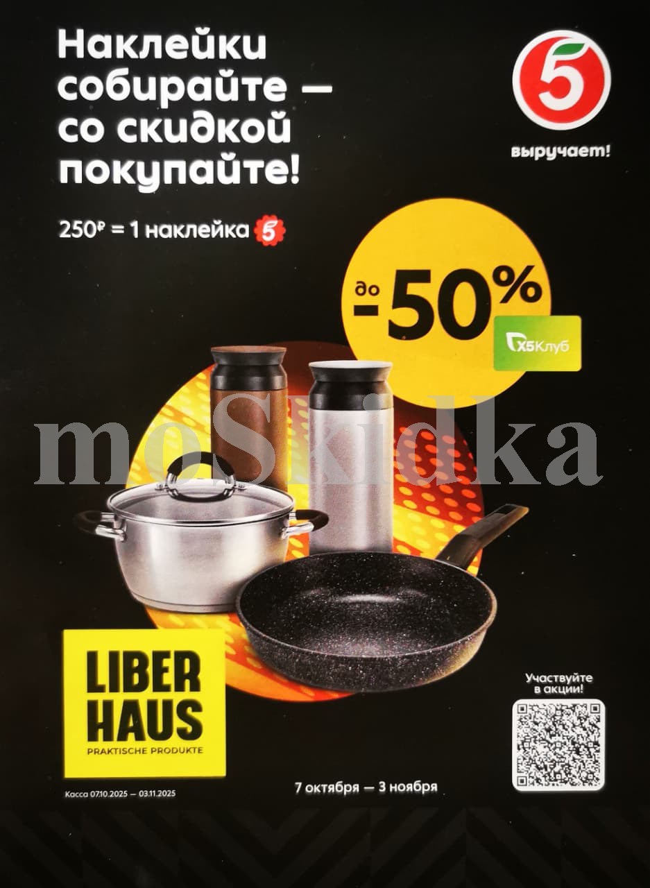 Совершайте покупки в Пятерочке и примите участие в акции, по условиям которой за каждую покупку от 250 рублей вы получите наклейку. Собрав необходимое количество наклеек, вы получаете возможность приобрести со скидкой до 50% посуду Liberhaus.