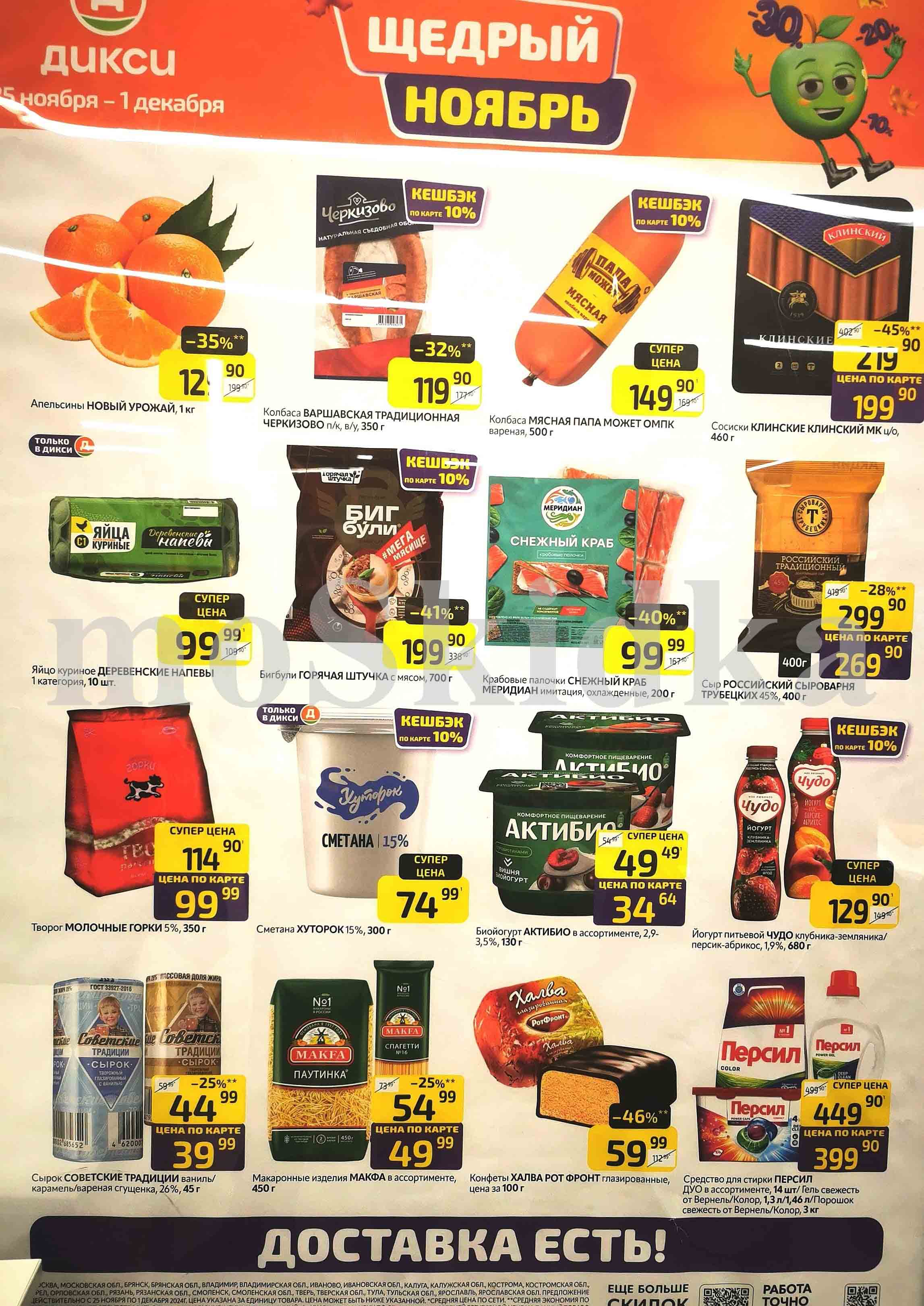 Смотрите еженедельный, новый каталог Дикси и не переплачивайте уже сегодня вас ждут ряд интересных акций и привлекательных скидок. Обо всем этом вы сможете узнать посмотрев новый каталог Дикси на нашем сайте. На страницах каталога Дикси вы найдете все свои любимые продукты, которые сейчас предлагаются в супермаркете. Предложения, представленные в настоящем буклете, действительны в указанный срок проведения. Стоимость указана за единицу товара (за исключением весового, цена которого определена за конкретный вес, указанный в настоящем буклете). В акции участвуют позиции, изображение которых размещено в каталоге. Цены в супермаркетах могут быть дополнительно снижены по решению руководства сети. Цены помеченные «*», обозначают среднюю цену данной позиции по сети. Количество товара ограничено и может не везде присутствовать. Цены по акции Дикси действуют в городах: Москва, Балашиха, Химки, Подольск, Королев, Мытищи, Люберцы, Электросталь, Коломна, Одинцово, Железнодорожный, Серпухов, Орехово-Зуево, Красногорск, Щелково, Сергиев Посад, Пушкино, Жуковский, Ногинск, Раменское, Клин, Воскресенск, Домодедово и многих других населенных пунктах Московского региона.