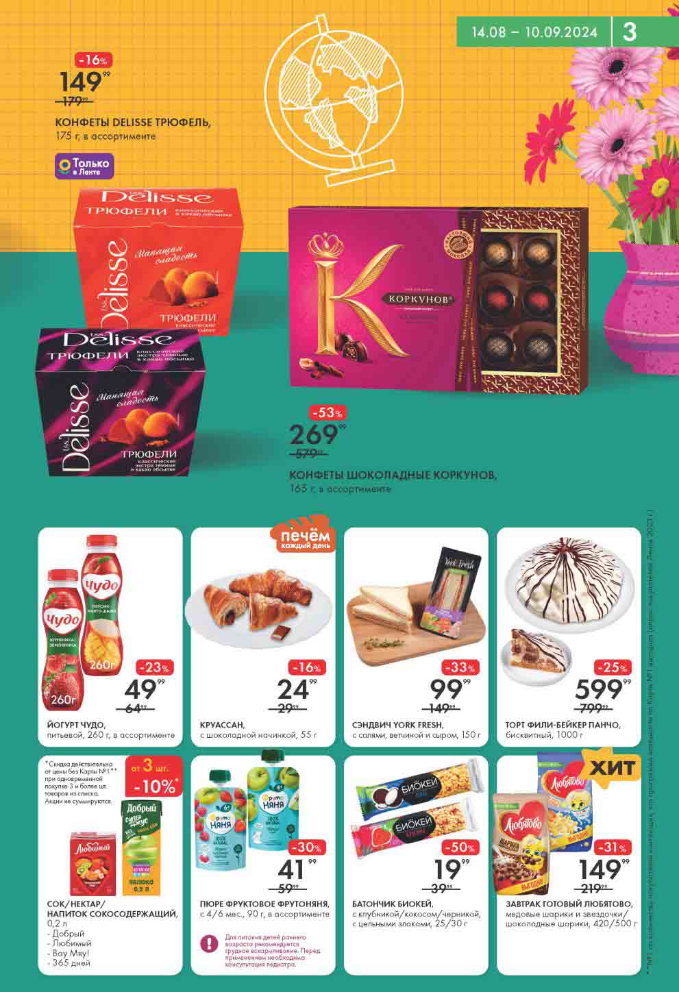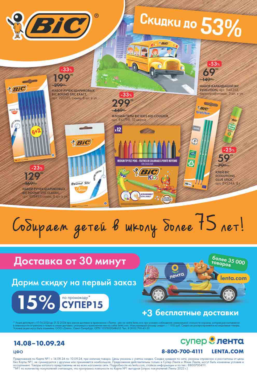 На страницах каталога ЛЕНТА вы найдете все свои любимые товары, которые сейчас предлагаются по акции. Скидки действуют в указанные сроки при покупках с Картой №1, при наличии товара Количество товара ограничено. Внешний вид товаров может отличаться от представленных. В Ленте пенсионерам скидка 10%* каждый день 9:00–13:00 (*Скидка не распространяется подарочные карты, лотерейные билеты, товары марки «365 Дней».) Выгода предоставляется на кассе при предъявлении необходимых документов и карты лояльности. Цены по акции Лента действуют в городах: Москва, Балашиха, Химки, Подольск, Королев, Мытищи, Люберцы, Электросталь, Коломна, Одинцово, Железнодорожный, Серпухов, Орехово-Зуево, Красногорск, Щелково, Сергиев Посад, Пушкино, Жуковский, Ногинск, Раменское и многих других населенных пунктах Московского региона.