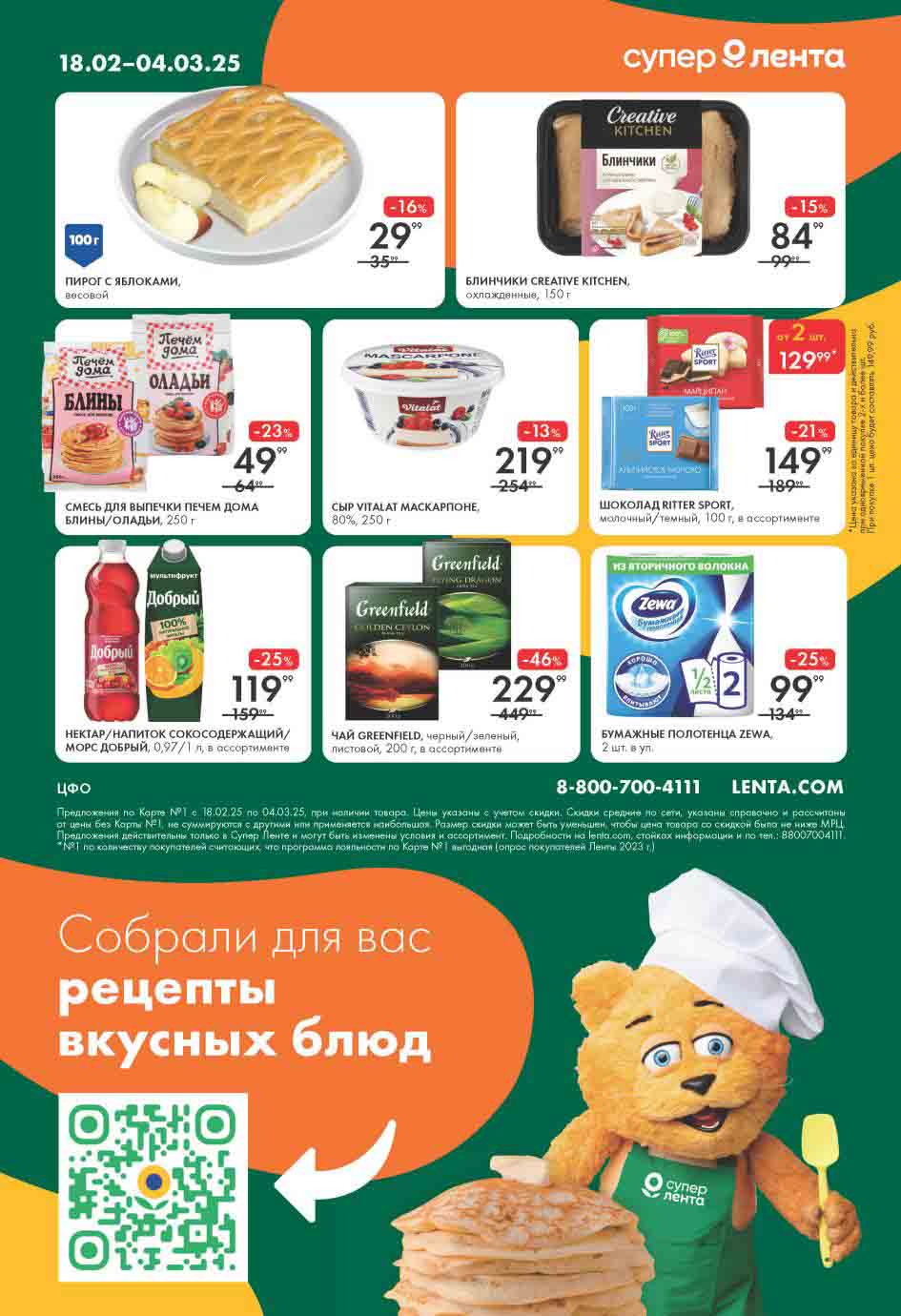 На страницах каталога ЛЕНТА вы найдете все свои любимые товары, которые сейчас предлагаются по акции. Скидки действуют в указанные сроки при покупках с Картой №1, при наличии товара Количество товара ограничено. Внешний вид товаров может отличаться от представленных. В Ленте пенсионерам скидка 10%* каждый день 9:00–13:00 (*Скидка не распространяется подарочные карты, лотерейные билеты, товары марки «365 Дней».) Выгода предоставляется на кассе при предъявлении необходимых документов и карты лояльности. Цены по акции Лента действуют в городах: Москва, Балашиха, Химки, Подольск, Королев, Мытищи, Люберцы, Электросталь, Коломна, Одинцово, Железнодорожный, Серпухов, Орехово-Зуево, Красногорск, Щелково, Сергиев Посад, Пушкино, Жуковский, Ногинск, Раменское и многих других населенных пунктах Московского региона.