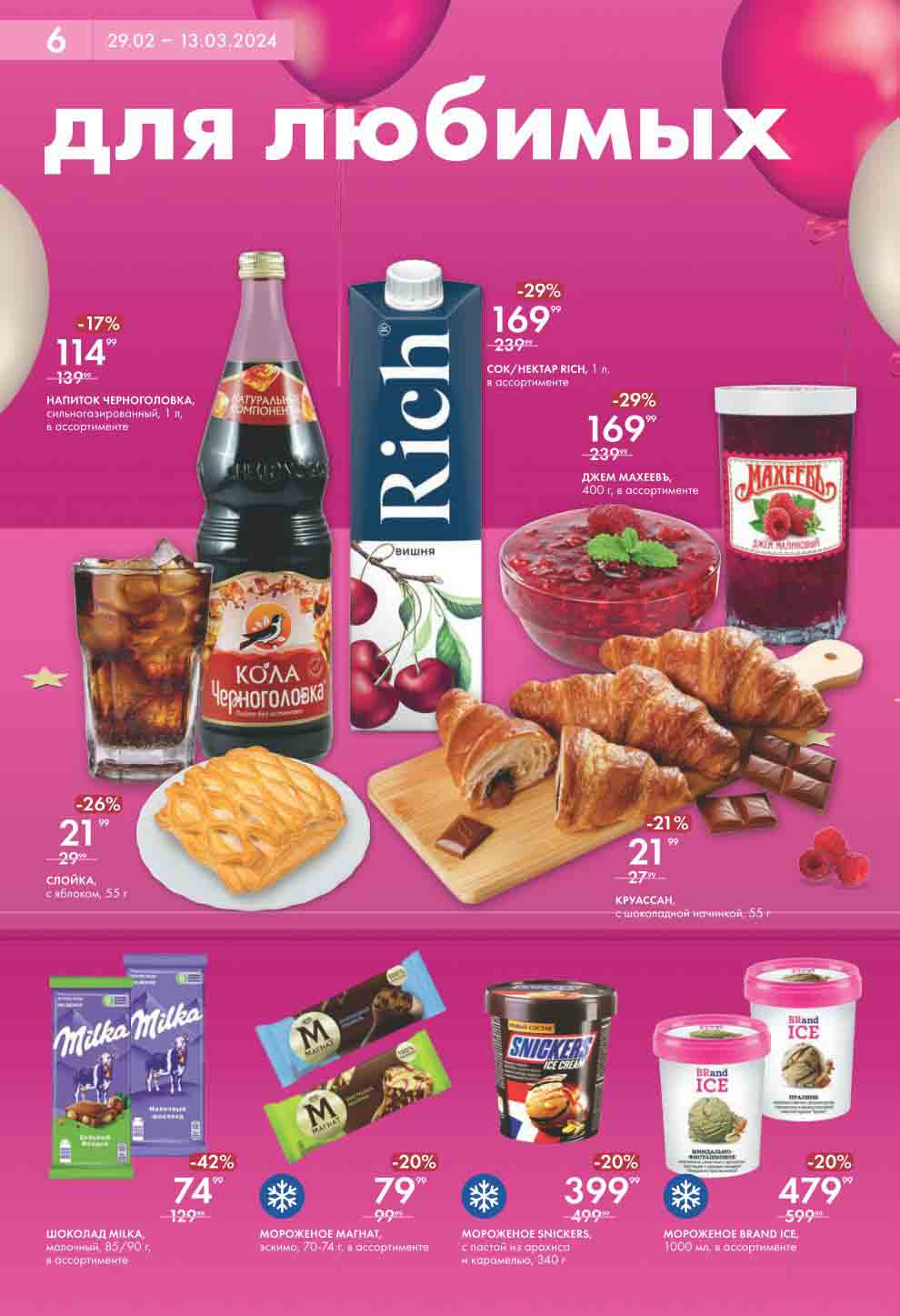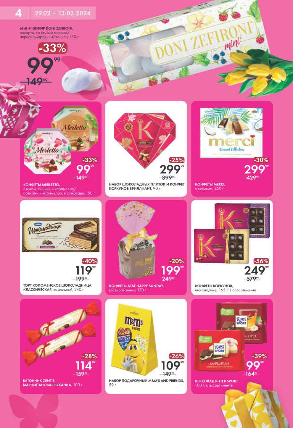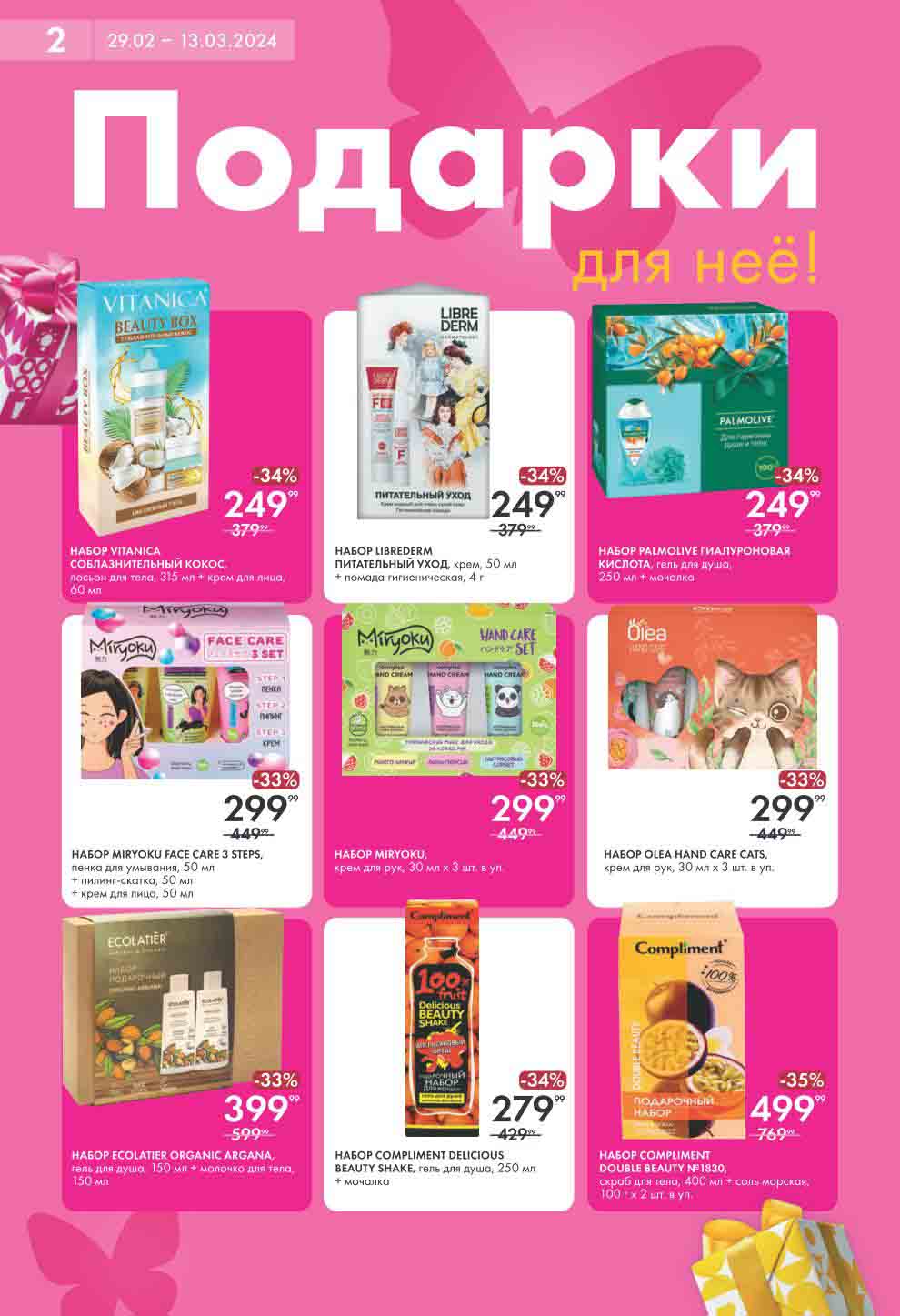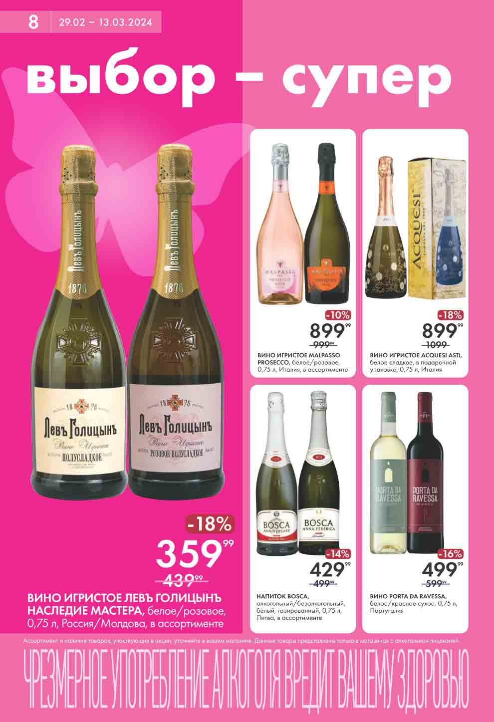 В акционном буклете предложены выгодные цены на различные товары, такие как наборы по уходу за кожей со скидкой 33%, вина, живая роза за 329.99 руб., сыры, пирожные, шоколад, напитки и многое другое. Скидки варьируются от 15% до 56% от первоначальных цен.