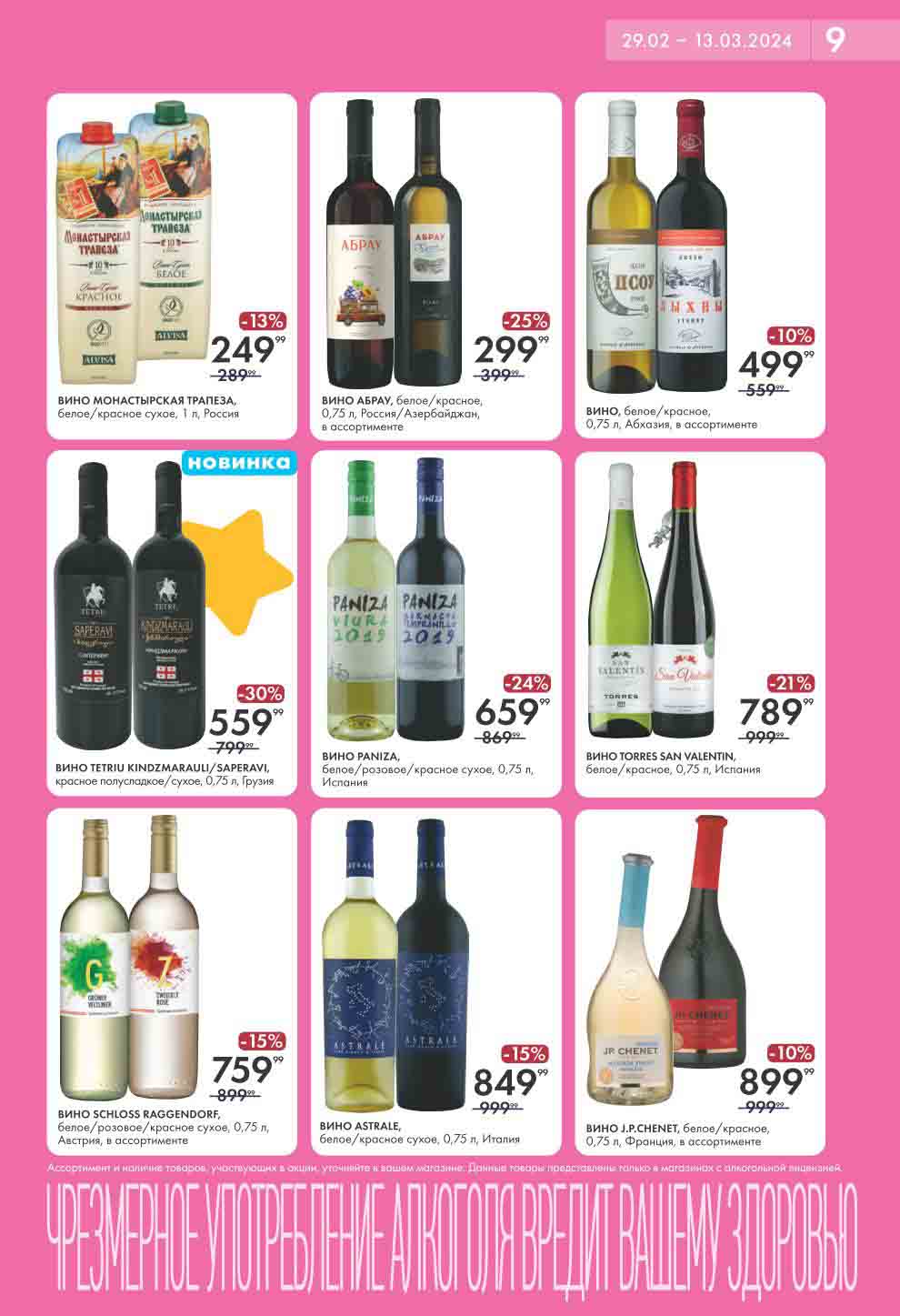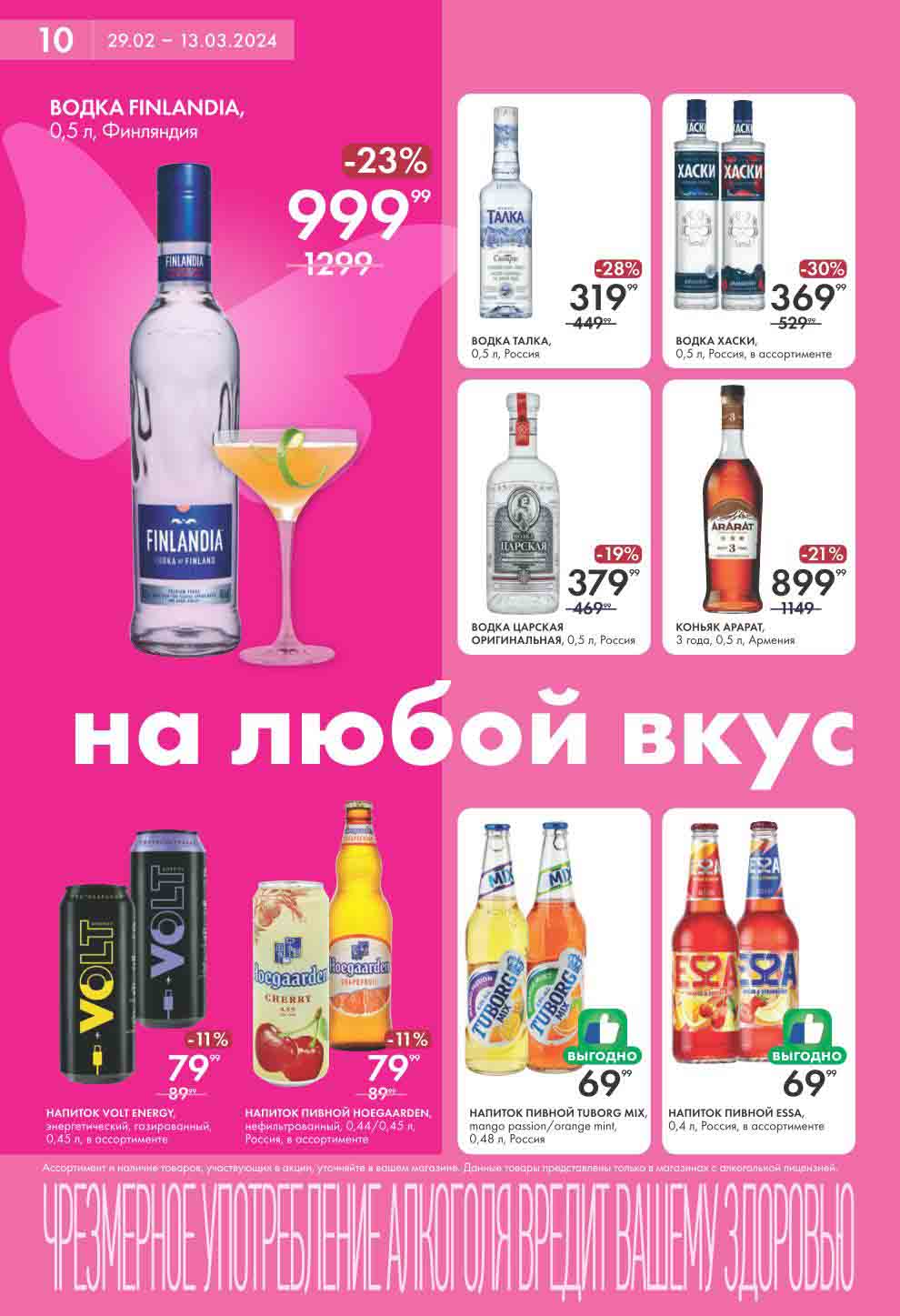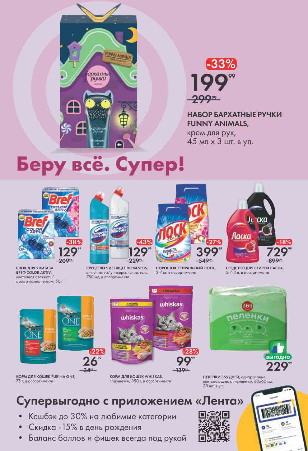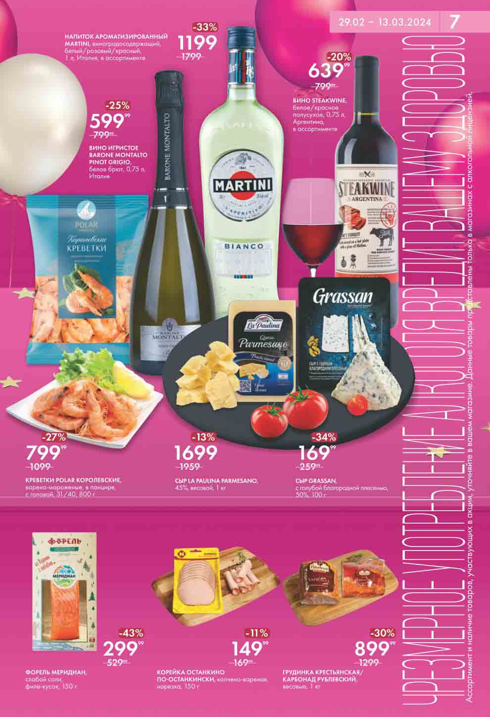 В акционном буклете предложены выгодные цены на различные товары, такие как наборы по уходу за кожей со скидкой 33%, вина, живая роза за 329.99 руб., сыры, пирожные, шоколад, напитки и многое другое. Скидки варьируются от 15% до 56% от первоначальных цен.