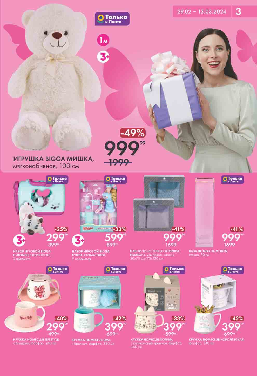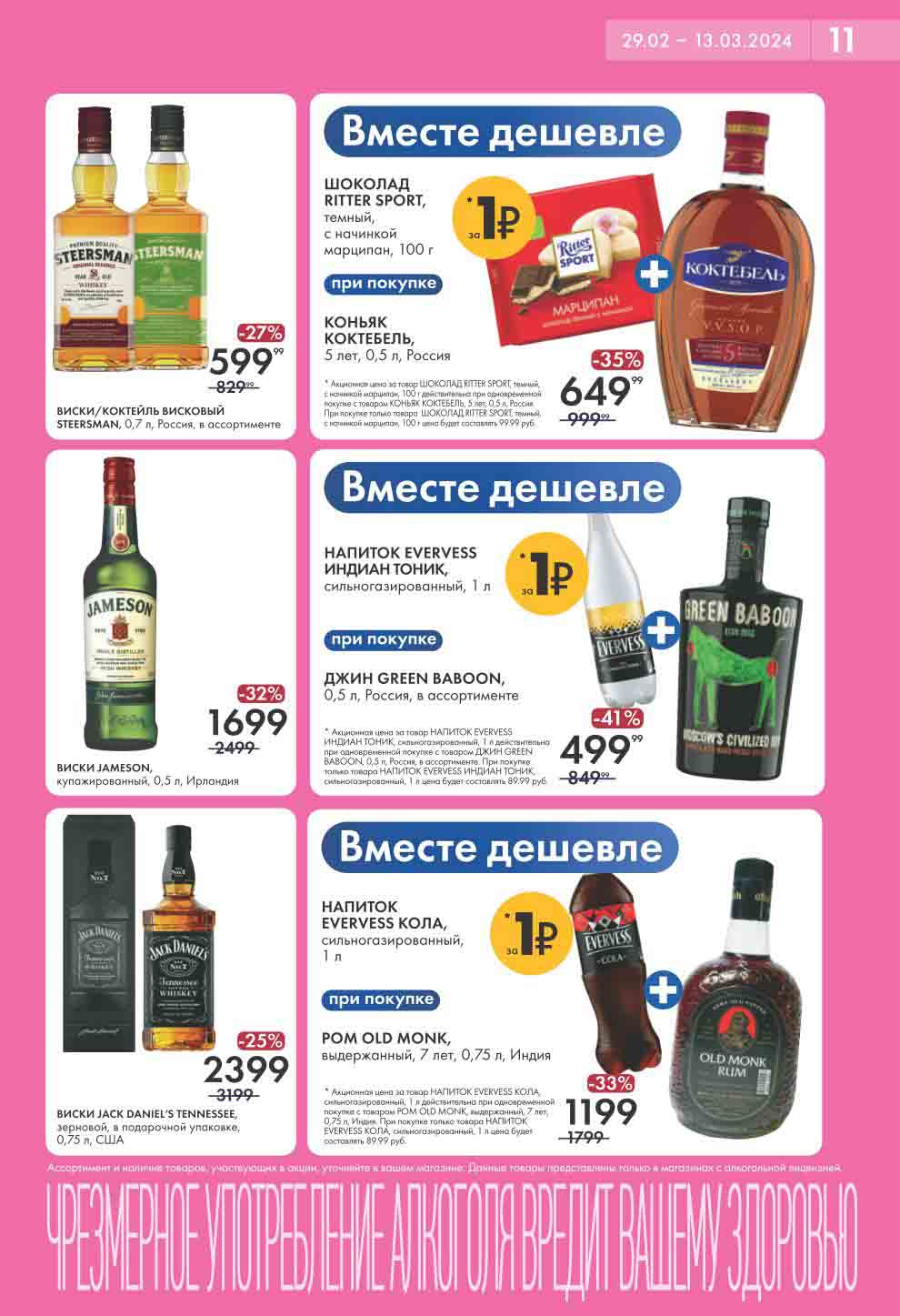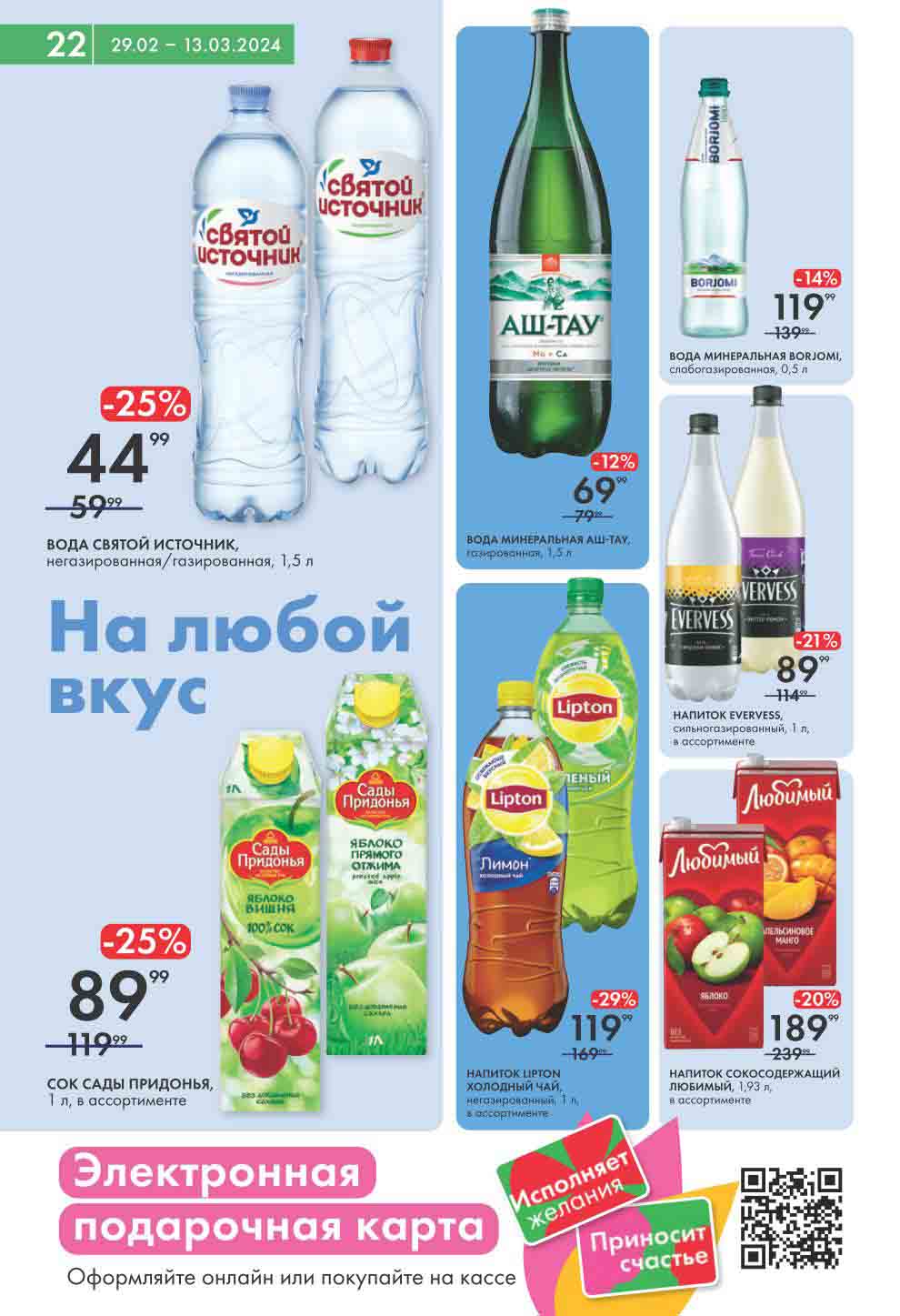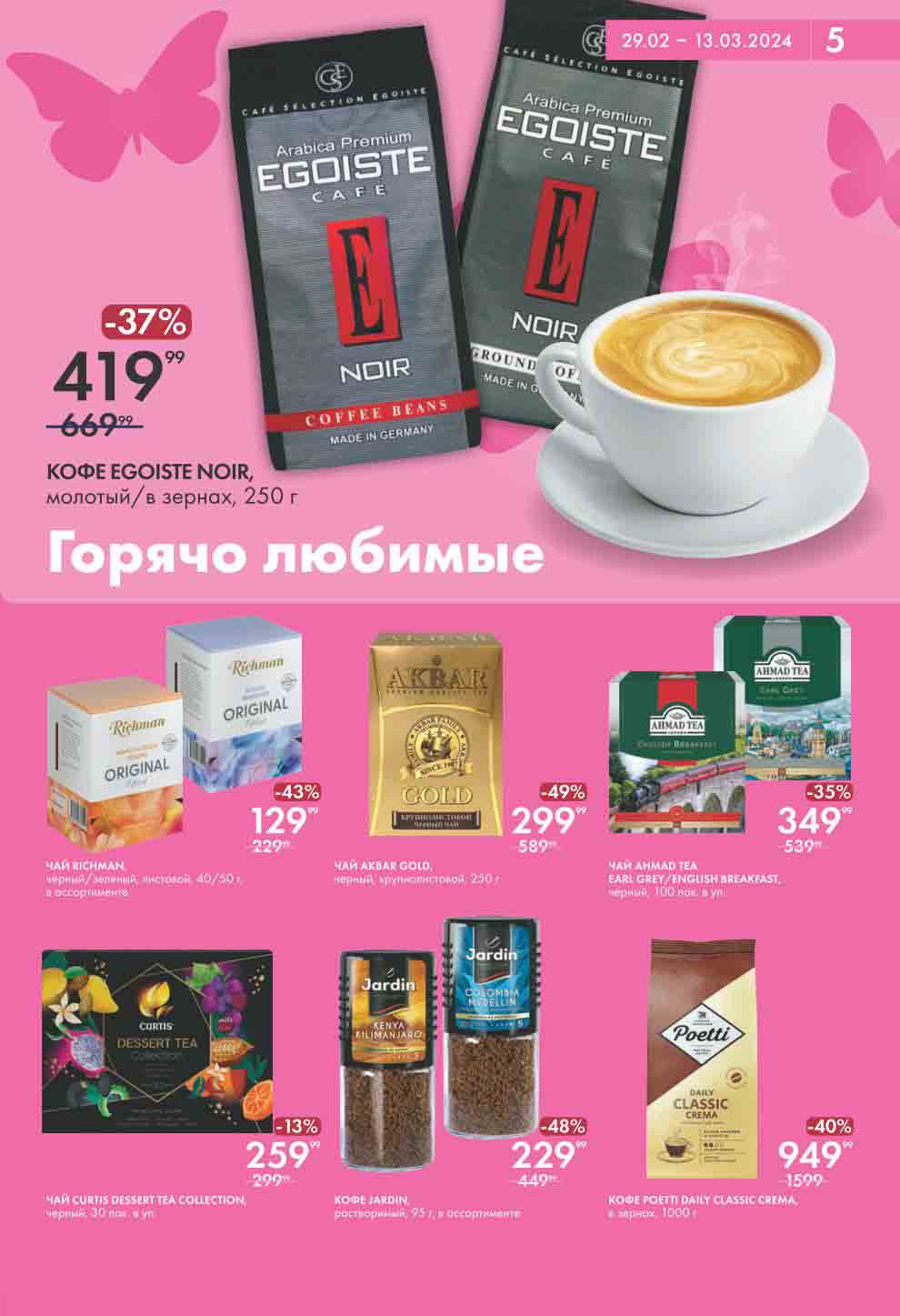 В акционном буклете предложены выгодные цены на различные товары, такие как наборы по уходу за кожей со скидкой 33%, вина, живая роза за 329.99 руб., сыры, пирожные, шоколад, напитки и многое другое. Скидки варьируются от 15% до 56% от первоначальных цен.