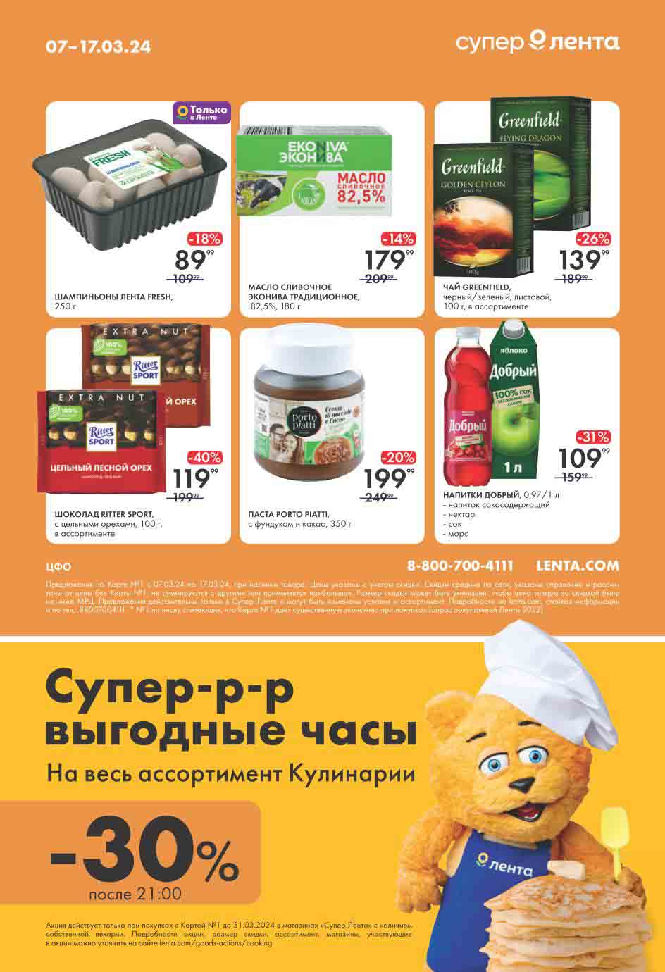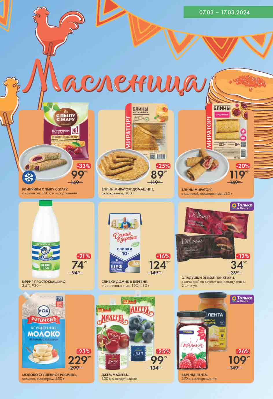 В акционном буклете предложены выгодные цены на различные товары, такие как: скидка 49% на СКОВОРОДА БЛИННАЯ HOMECLUB, ОЛОКО СГУЩЕННОЕ РОГАЧЕВЪ за 119.99 руб., БЛИНЧИКИ ОСТАНКИНО за 99.99 руб., икра лососевая дешевле на 30% и многое другое.