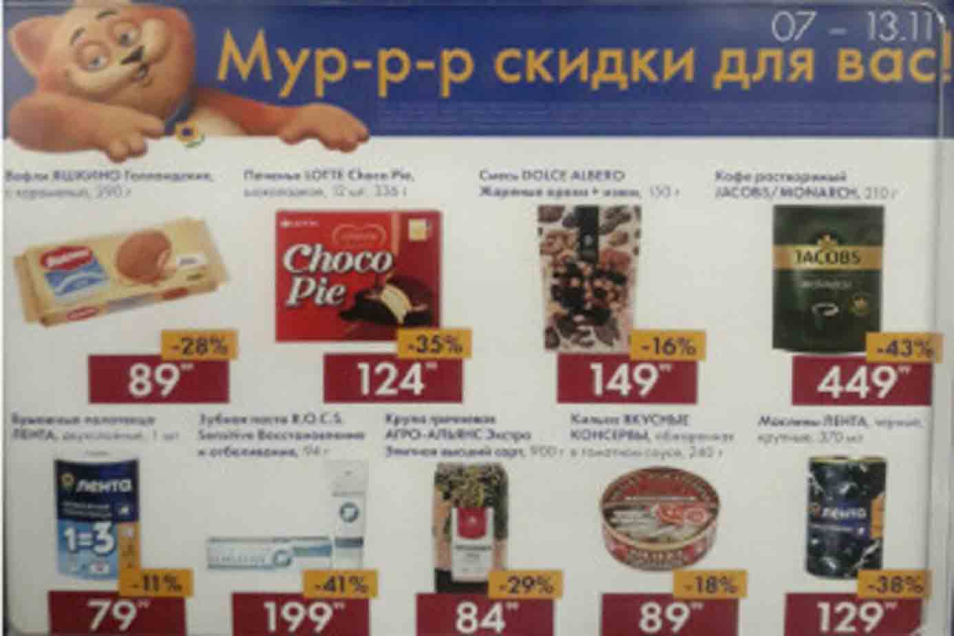 На страницах каталога ЛЕНТА вы найдете все свои любимые товары, которые сейчас предлагаются по акции. Скидки действуют в указанные сроки при покупках с Картой №1, при наличии товара Количество товара ограничено. Внешний вид товаров может отличаться от представленных. В Ленте пенсионерам скидка 10%* каждый день 9:00–13:00 (*Скидка не распространяется подарочные карты, лотерейные билеты, товары марки «365 Дней».) Выгода предоставляется на кассе при предъявлении необходимых документов и карты лояльности. Цены по акции Лента действуют в городах: Москва, Балашиха, Химки, Подольск, Королев, Мытищи, Люберцы, Электросталь, Коломна, Одинцово, Железнодорожный, Серпухов, Орехово-Зуево, Красногорск, Щелково, Сергиев Посад, Пушкино, Жуковский, Ногинск, Раменское и многих других населенных пунктах Московского региона.