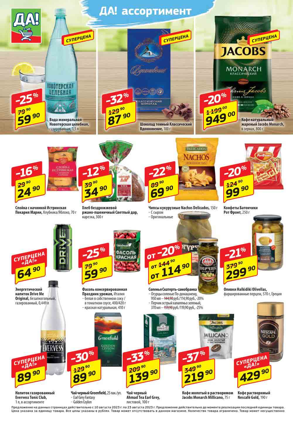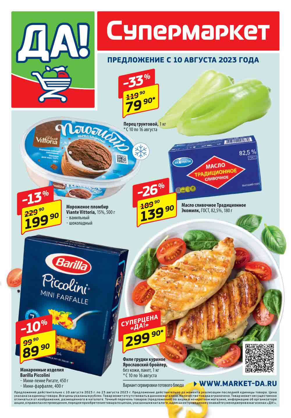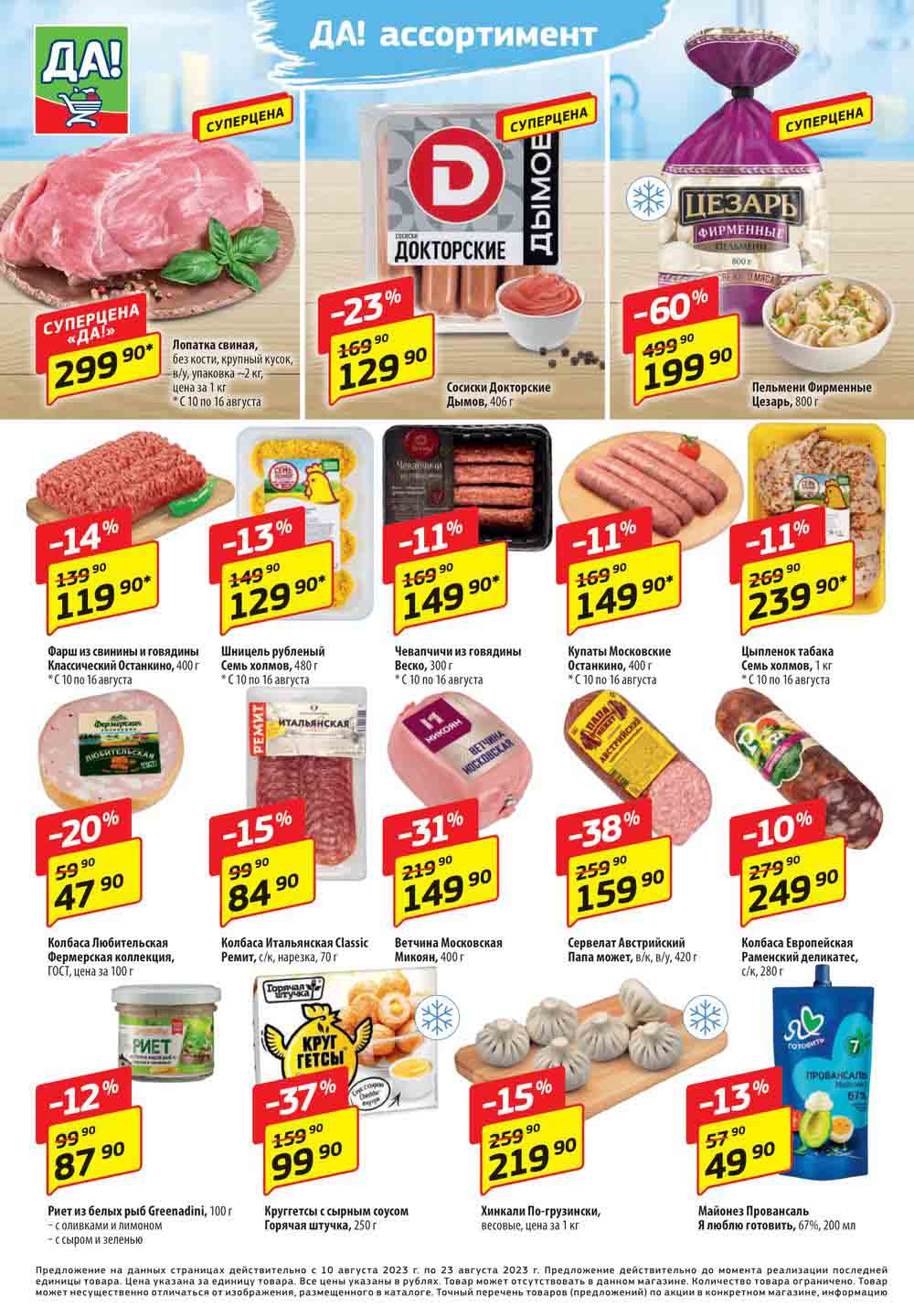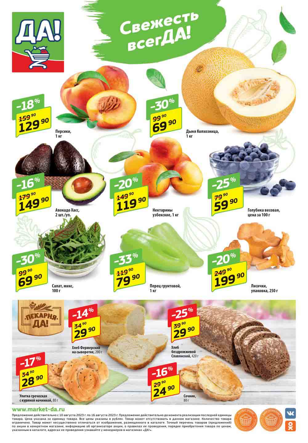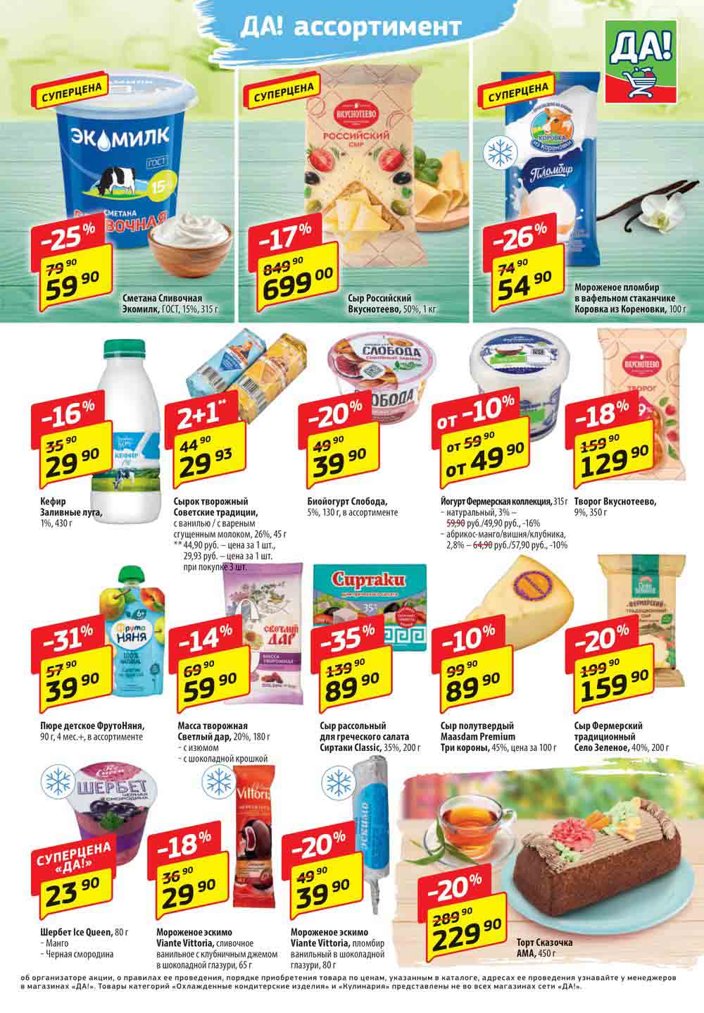 Магазин регулярно предлагает вам свои еженедельные акции и разнообразный каталог ДА! со скидкой. Уникальные возможности ожидают вас при посещении супермаркета каждую неделю. Цены по акции “Да” супермаркет, действуют в городах: Москва, Балашиха, Химки, Подольск, Королев, Мытищи, Люберцы, Электросталь, Коломна, Одинцово, Железнодорожный, Серпухов, Орехово-Зуево, Красногорск, Щелково, Сергиев Посад, Пушкино, Жуковский, Ногинск, Раменское, Клин, Воскресенск, Домодедово и многих других населенных пунктах Московского региона.