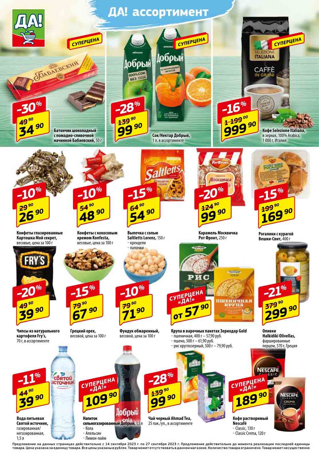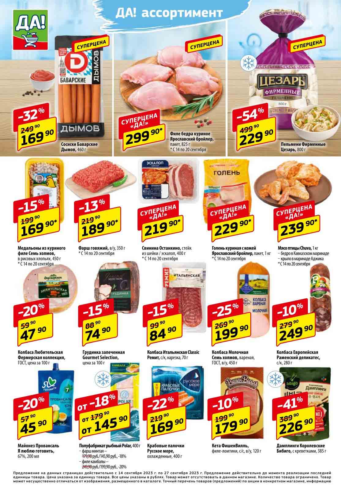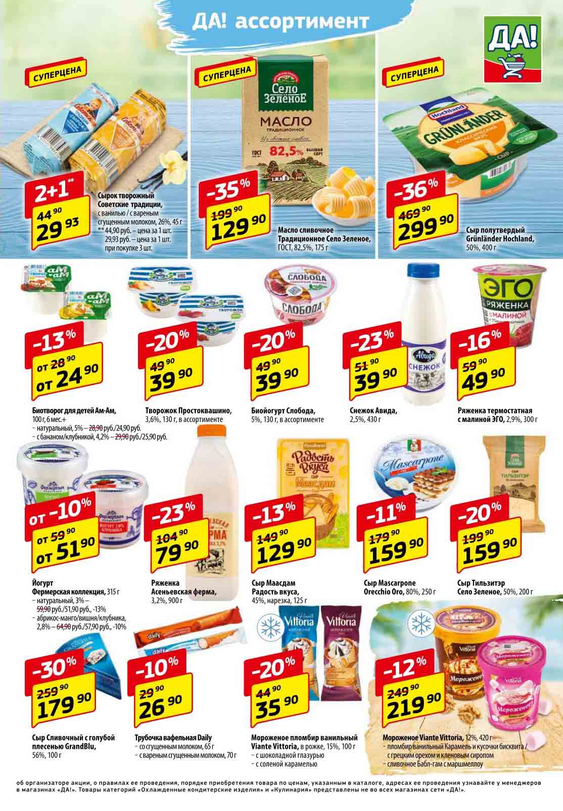 Магазин регулярно предлагает вам свои еженедельные акции и разнообразный каталог ДА! со скидкой. Уникальные возможности ожидают вас при посещении супермаркета каждую неделю. Цены по акции “Да” супермаркет, действуют в городах: Москва, Балашиха, Химки, Подольск, Королев, Мытищи, Люберцы, Электросталь, Коломна, Одинцово, Железнодорожный, Серпухов, Орехово-Зуево, Красногорск, Щелково, Сергиев Посад, Пушкино, Жуковский, Ногинск, Раменское, Клин, Воскресенск, Домодедово и многих других населенных пунктах Московского региона.