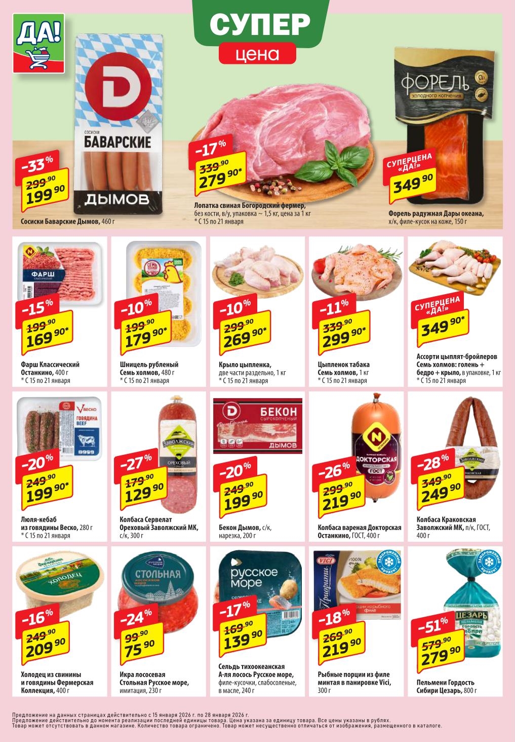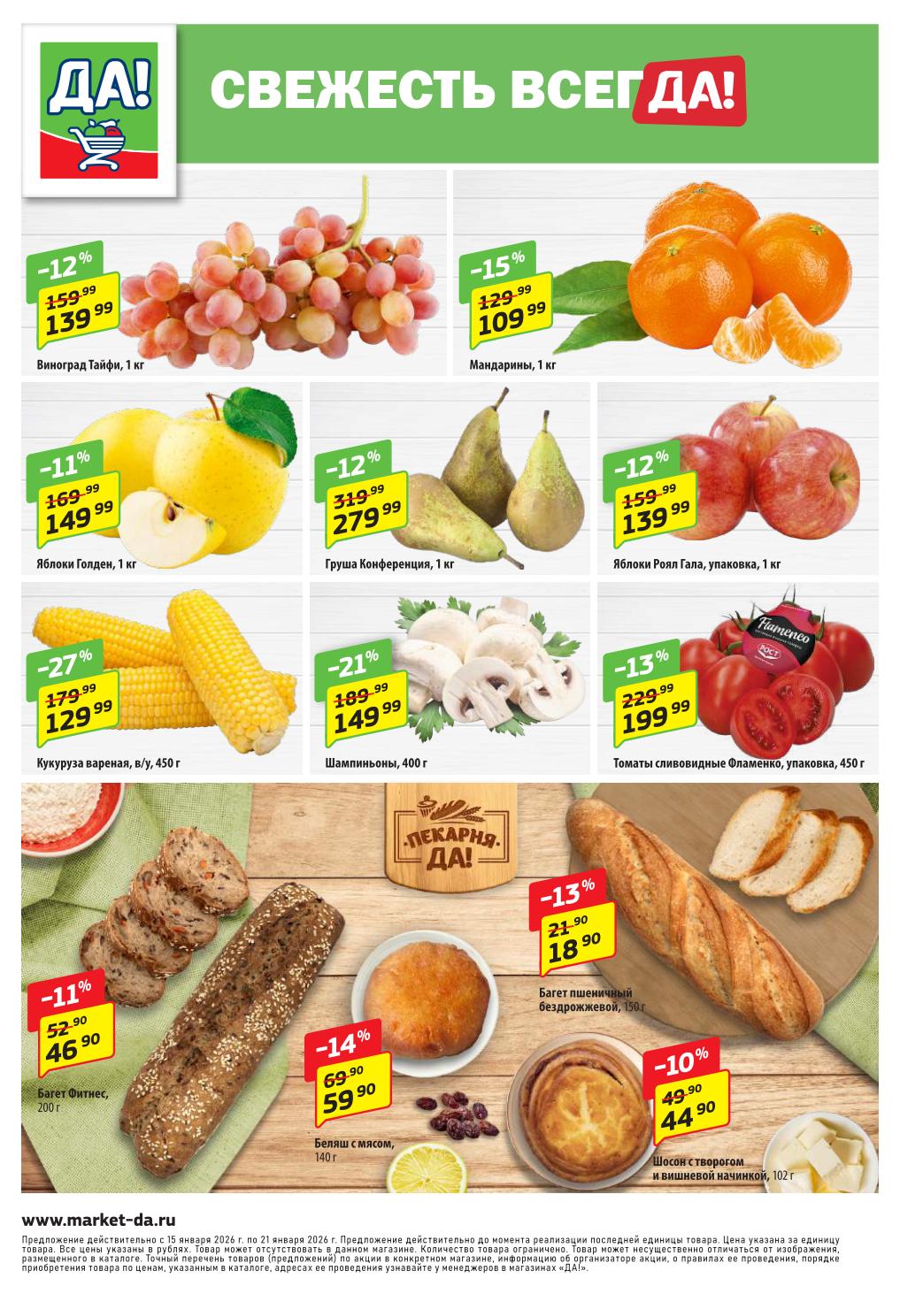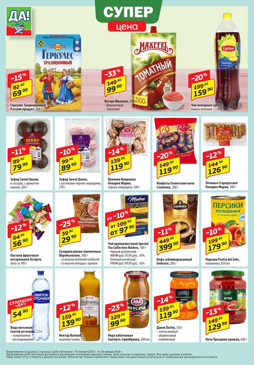 Магазин регулярно предлагает вам свои еженедельные акции и разнообразный каталог ДА! со скидкой. Уникальные возможности ожидают вас при посещении супермаркета каждую неделю. Цены по акции “Да” супермаркет, действуют в городах: Москва, Балашиха, Химки, Подольск, Королев, Мытищи, Люберцы, Электросталь, Коломна, Одинцово, Железнодорожный, Серпухов, Орехово-Зуево, Красногорск, Щелково, Сергиев Посад, Пушкино, Жуковский, Ногинск, Раменское, Клин, Воскресенск, Домодедово и многих других населенных пунктах Московского региона.