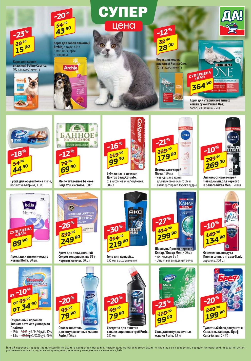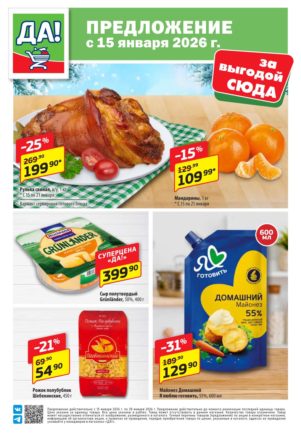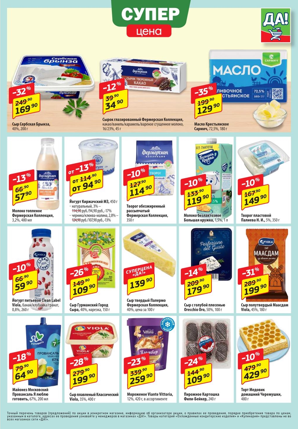 Магазин регулярно предлагает вам свои еженедельные акции и разнообразный каталог ДА! со скидкой. Уникальные возможности ожидают вас при посещении супермаркета каждую неделю. Цены по акции “Да” супермаркет, действуют в городах: Москва, Балашиха, Химки, Подольск, Королев, Мытищи, Люберцы, Электросталь, Коломна, Одинцово, Железнодорожный, Серпухов, Орехово-Зуево, Красногорск, Щелково, Сергиев Посад, Пушкино, Жуковский, Ногинск, Раменское, Клин, Воскресенск, Домодедово и многих других населенных пунктах Московского региона.