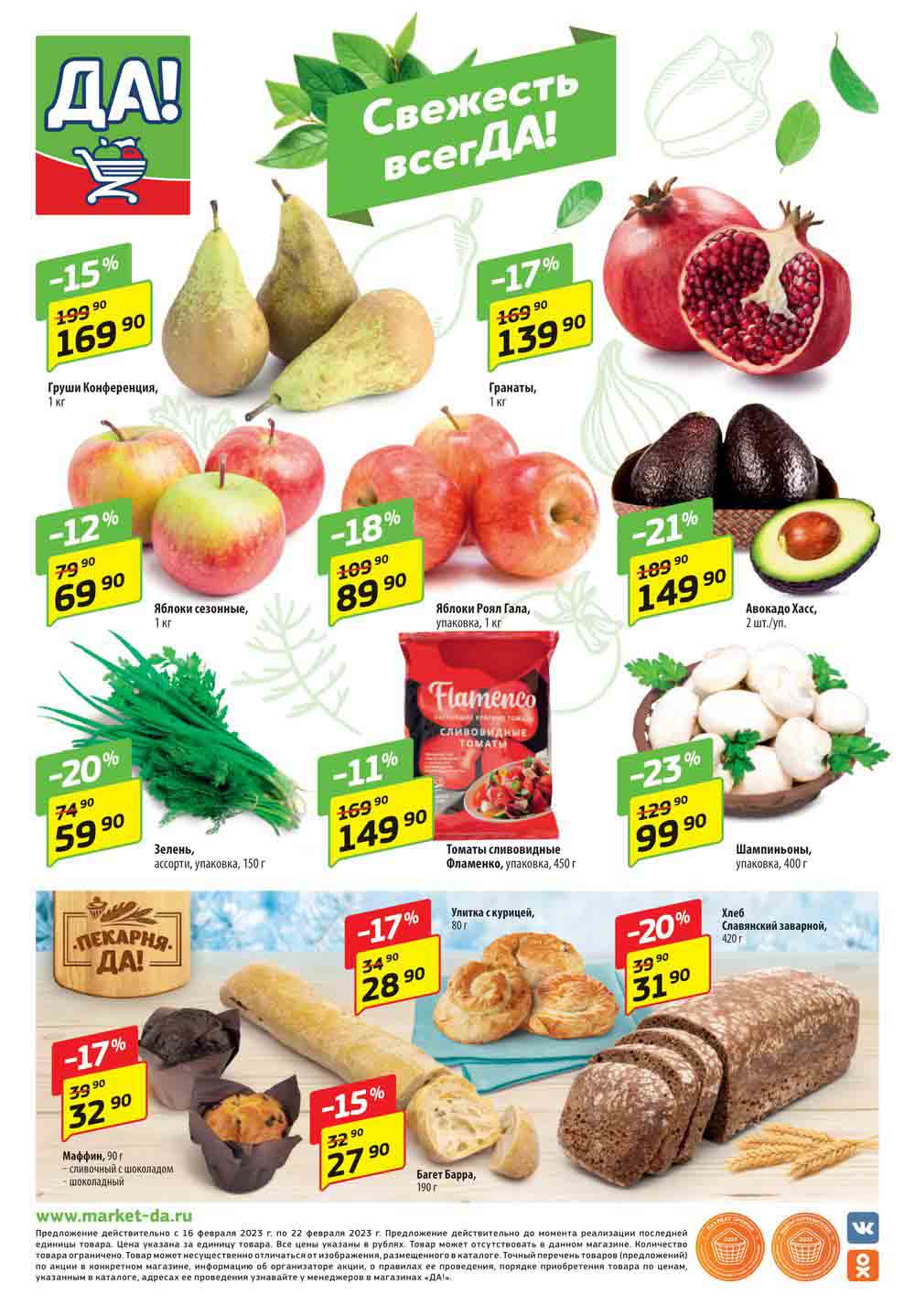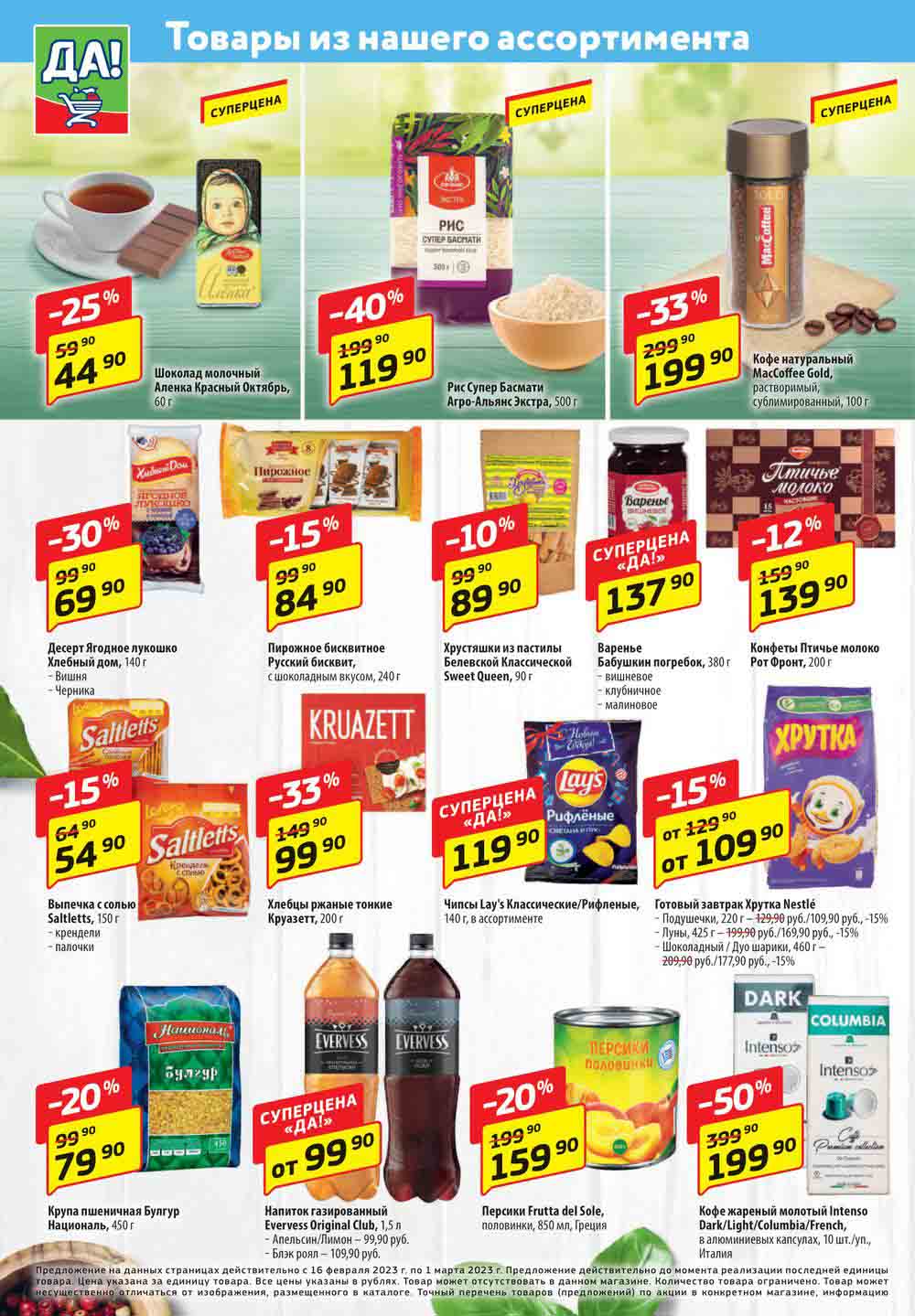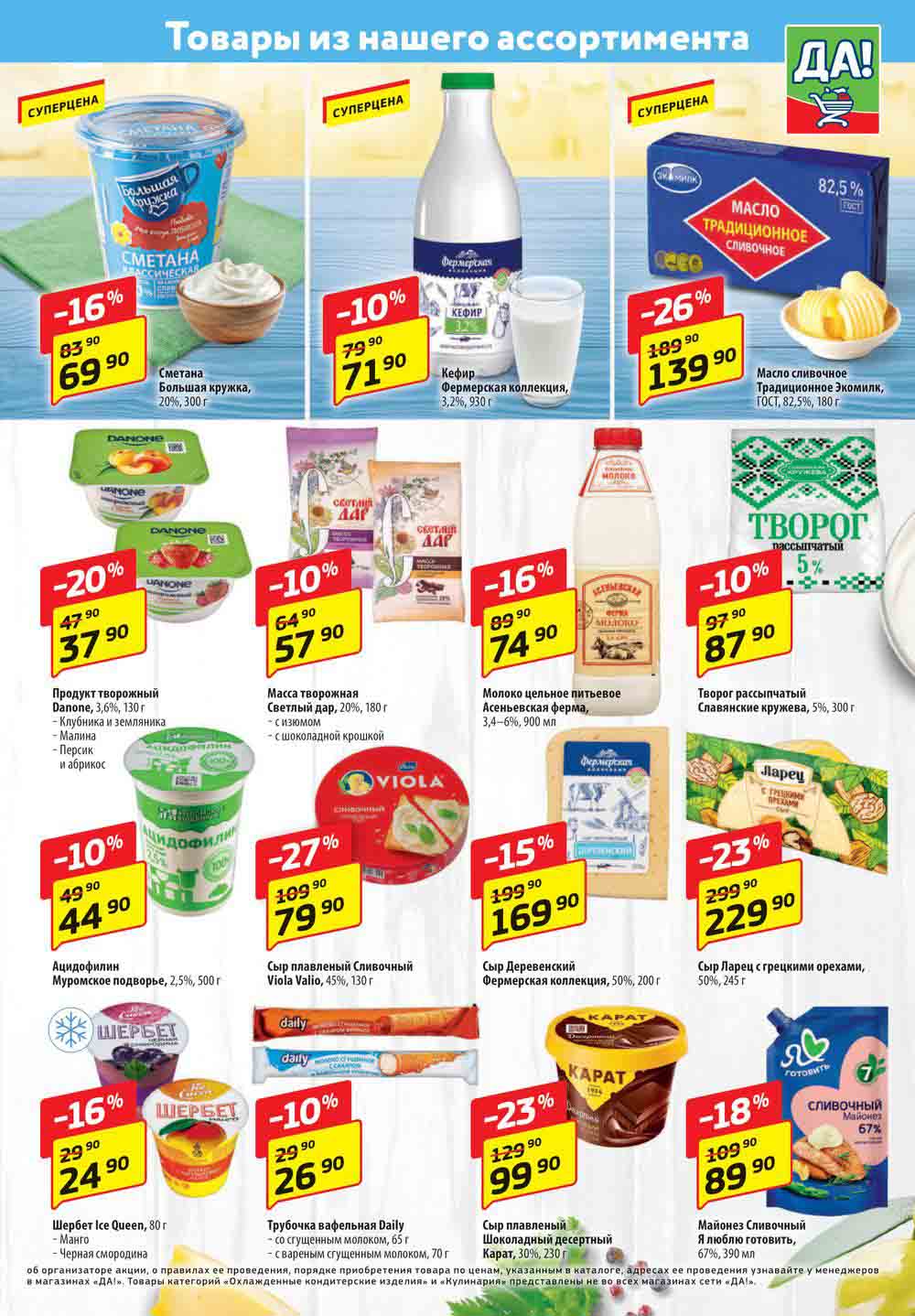Магазин регулярно предлагает вам свои еженедельные акции и разнообразный каталог ДА! со скидкой. Уникальные возможности ожидают вас при посещении супермаркета каждую неделю. Цены по акции “Да” супермаркет, действуют в городах: Москва, Балашиха, Химки, Подольск, Королев, Мытищи, Люберцы, Электросталь, Коломна, Одинцово, Железнодорожный, Серпухов, Орехово-Зуево, Красногорск, Щелково, Сергиев Посад, Пушкино, Жуковский, Ногинск, Раменское, Клин, Воскресенск, Домодедово и многих других населенных пунктах Московского региона.