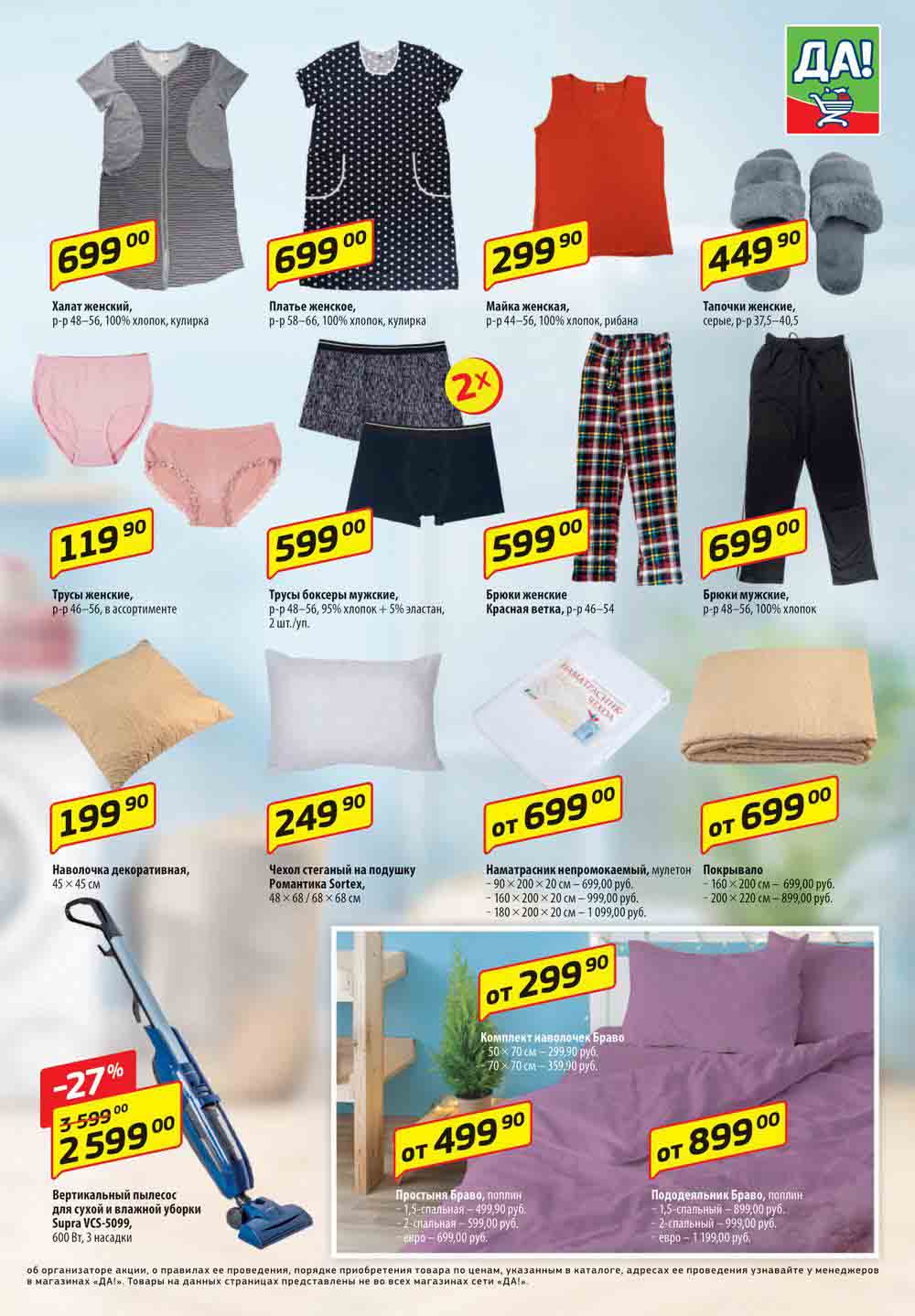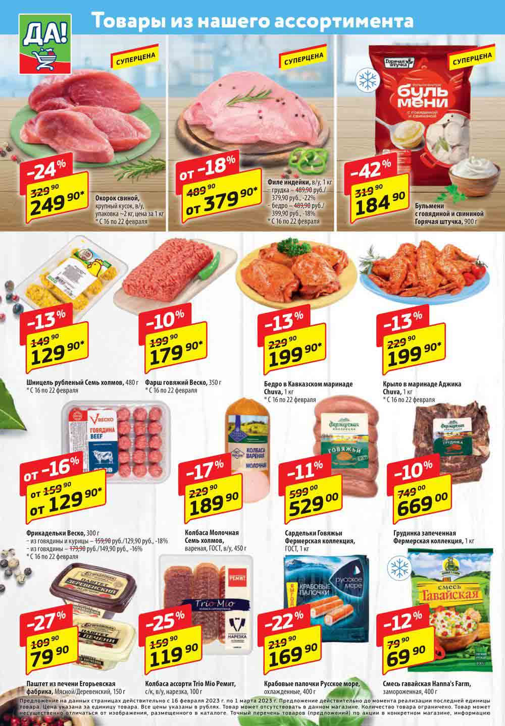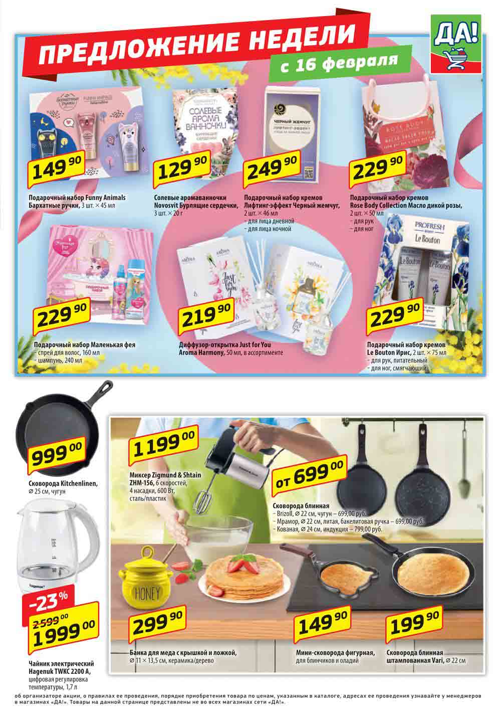 Магазин регулярно предлагает вам свои еженедельные акции и разнообразный каталог ДА! со скидкой. Уникальные возможности ожидают вас при посещении супермаркета каждую неделю. Цены по акции “Да” супермаркет, действуют в городах: Москва, Балашиха, Химки, Подольск, Королев, Мытищи, Люберцы, Электросталь, Коломна, Одинцово, Железнодорожный, Серпухов, Орехово-Зуево, Красногорск, Щелково, Сергиев Посад, Пушкино, Жуковский, Ногинск, Раменское, Клин, Воскресенск, Домодедово и многих других населенных пунктах Московского региона.
