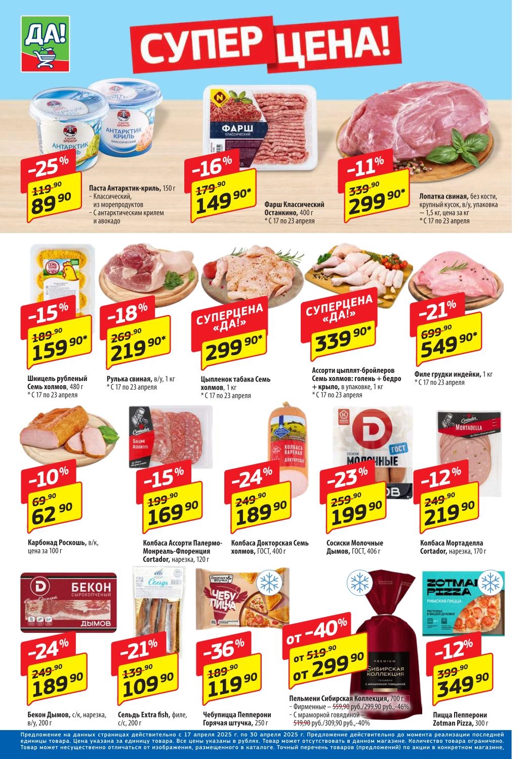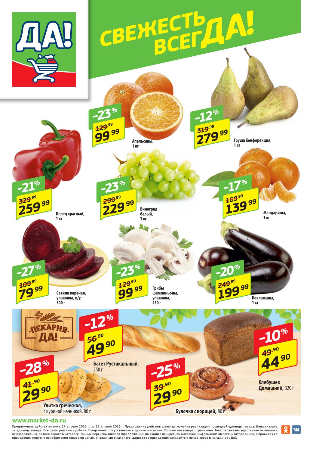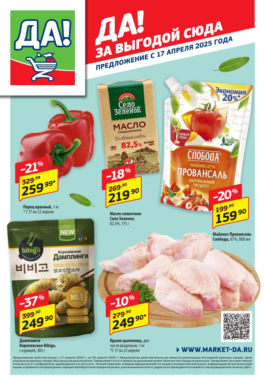 Магазин регулярно предлагает вам свои еженедельные акции и разнообразный каталог ДА! со скидкой. Уникальные возможности ожидают вас при посещении супермаркета каждую неделю. Цены по акции “Да” супермаркет, действуют в городах: Москва, Балашиха, Химки, Подольск, Королев, Мытищи, Люберцы, Электросталь, Коломна, Одинцово, Железнодорожный, Серпухов, Орехово-Зуево, Красногорск, Щелково, Сергиев Посад, Пушкино, Жуковский, Ногинск, Раменское, Клин, Воскресенск, Домодедово и многих других населенных пунктах Московского региона.
