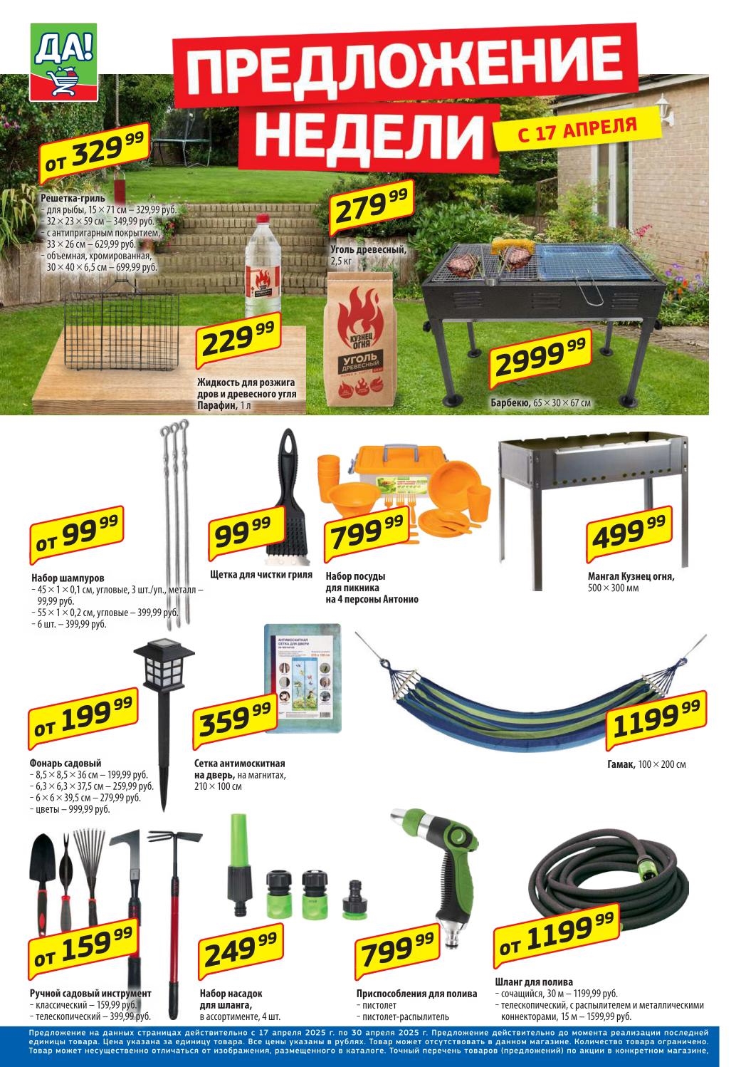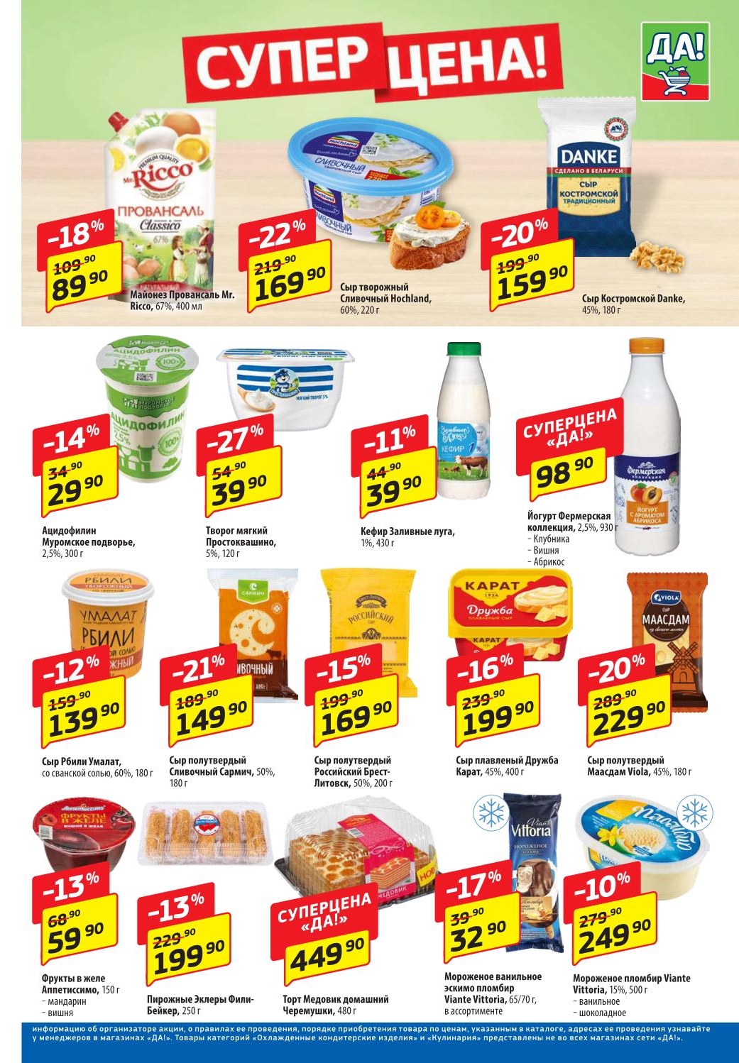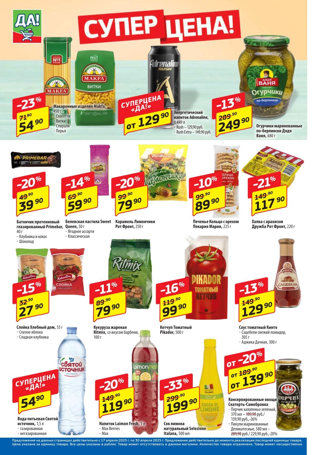 Магазин регулярно предлагает вам свои еженедельные акции и разнообразный каталог ДА! со скидкой. Уникальные возможности ожидают вас при посещении супермаркета каждую неделю. Цены по акции “Да” супермаркет, действуют в городах: Москва, Балашиха, Химки, Подольск, Королев, Мытищи, Люберцы, Электросталь, Коломна, Одинцово, Железнодорожный, Серпухов, Орехово-Зуево, Красногорск, Щелково, Сергиев Посад, Пушкино, Жуковский, Ногинск, Раменское, Клин, Воскресенск, Домодедово и многих других населенных пунктах Московского региона.